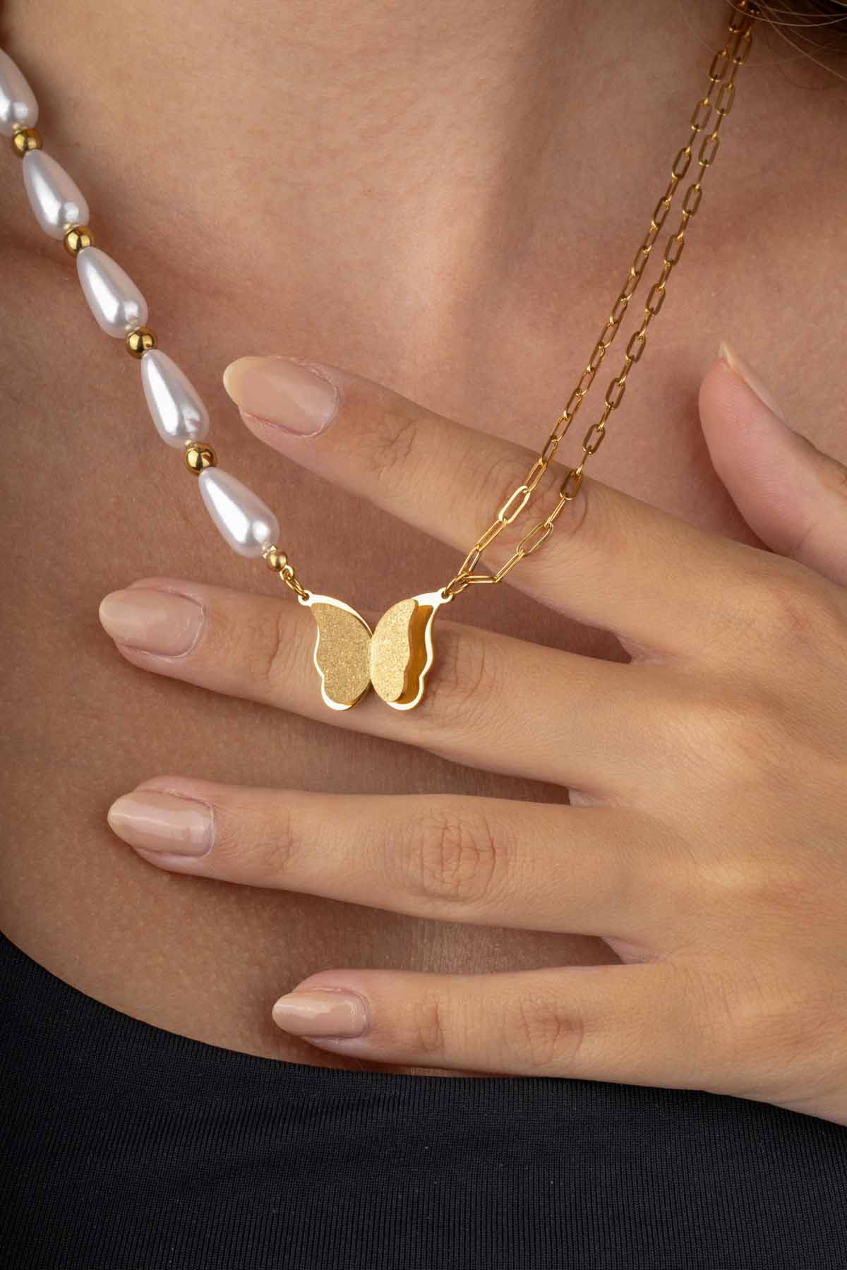 İnci detaylarının zarafeti ile kelebek figürünün sembolik anlamını buluşturan bu Altın Kaplama Çelik Kolye, modern tasarımıyla göz alıcı bir stil vadeder.