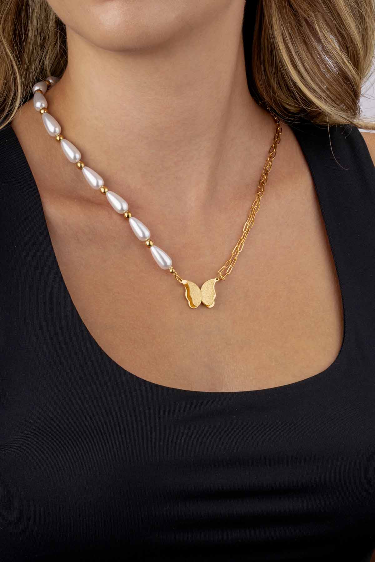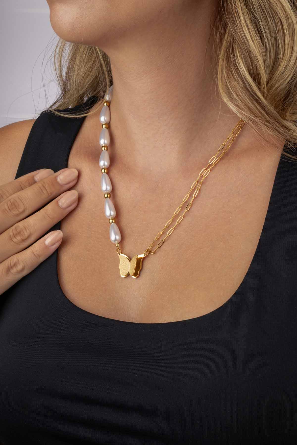 İnci Geçişli Kelebek Model Altın Kaplama Kadın Çelik Kolye - 1