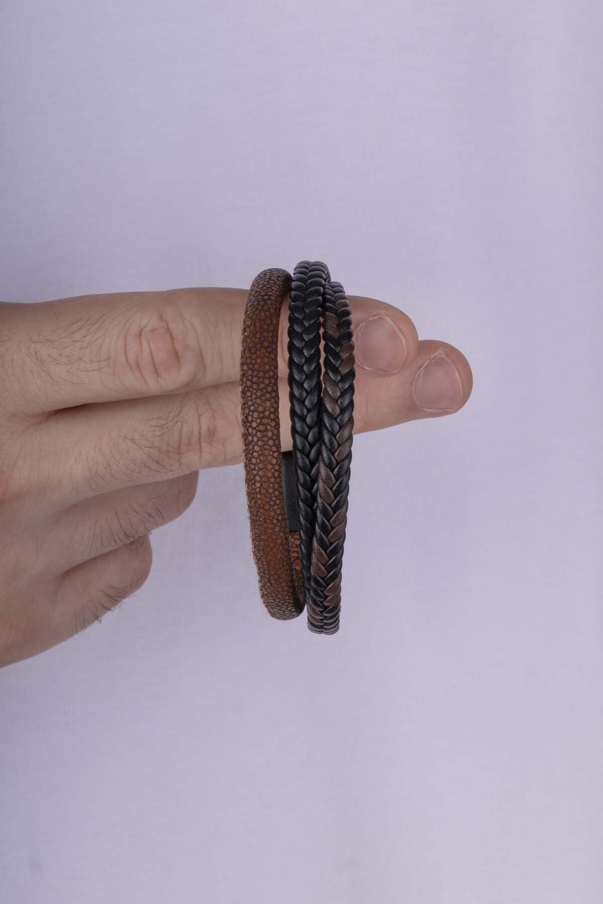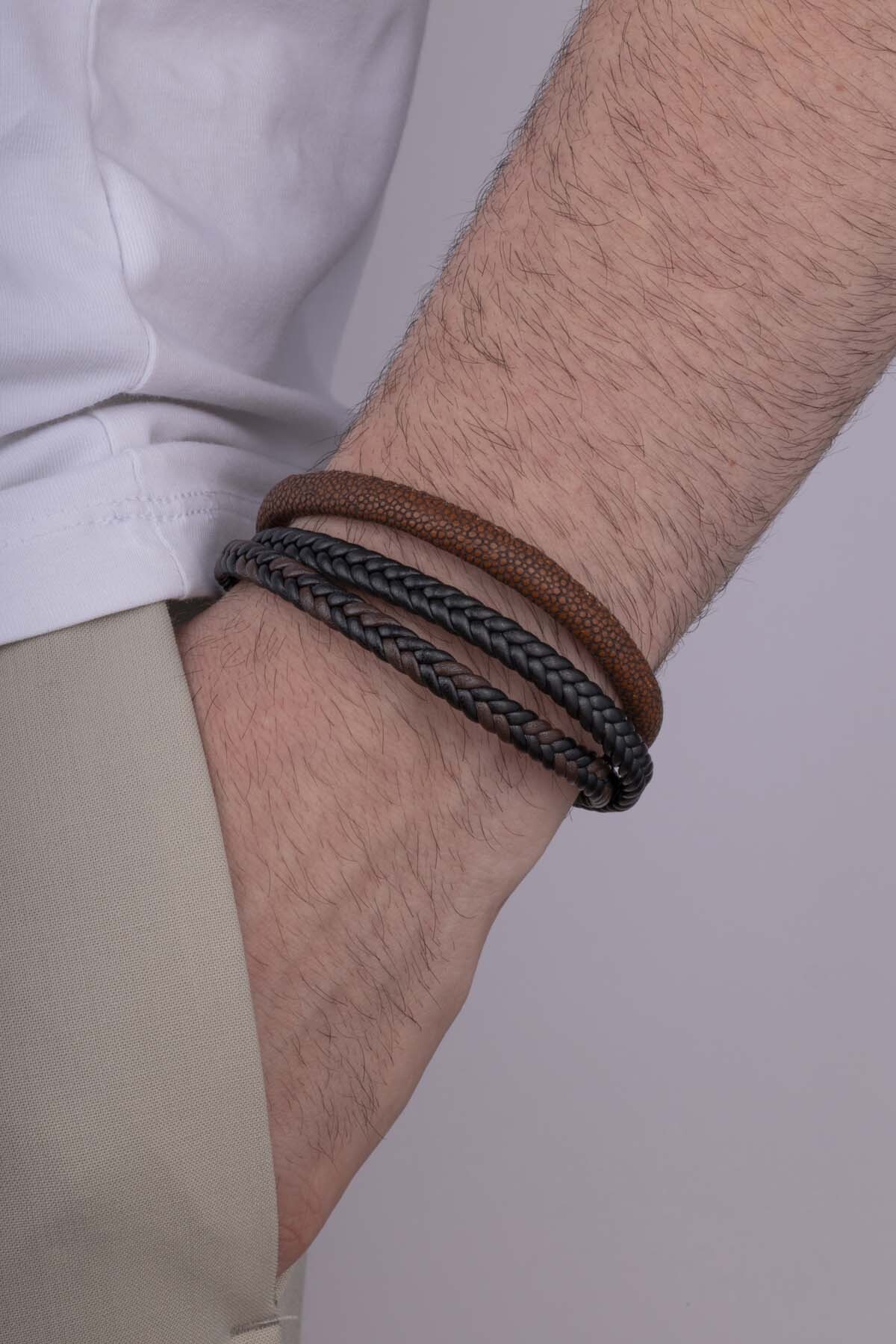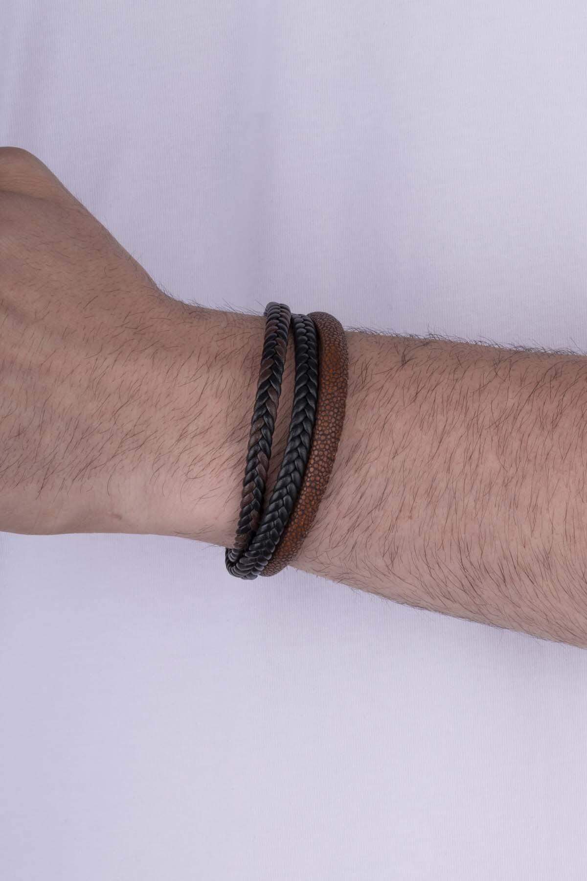Bileklik kombinasyonu, hem tek başına hem de farklı aksesuarlarla rahatlıkla kullanılabilir. Dayanıklı deri yapısı sayesinde uzun ömürlü kullanım sağlar ve casual ya da smart-casual kombinlere uyum gösterir. Örgü ve düz deri detayları, bu modelin özgün duruşunu güçlendirir.