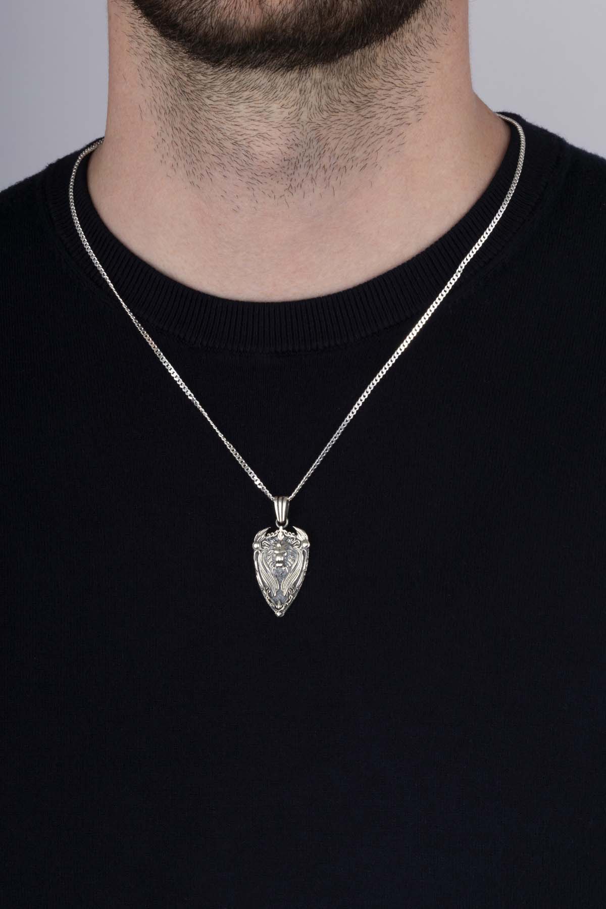 Kalkan Motifli Aslan Başı Gümüş Erkek Kolye - 3