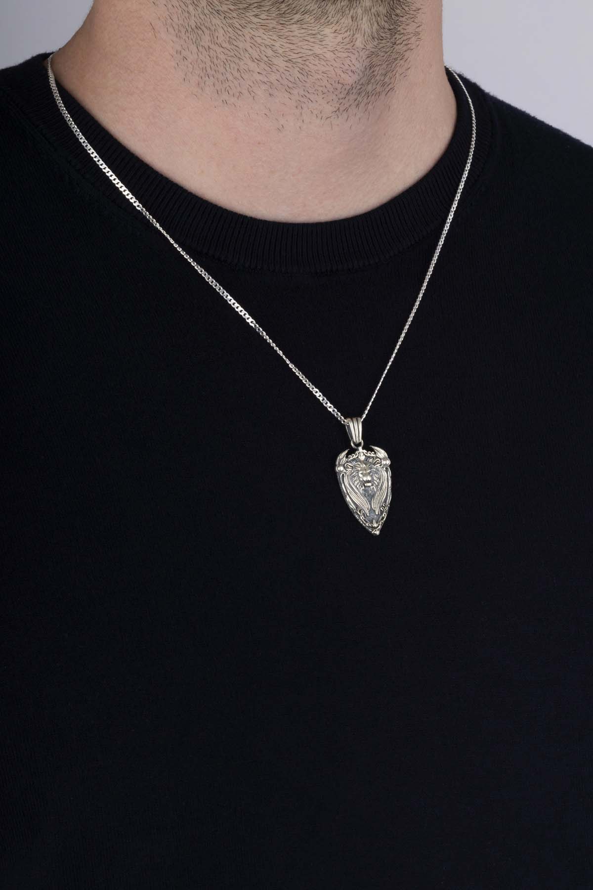 Kalkan Motifli Aslan Başı Gümüş Erkek Kolye - 1