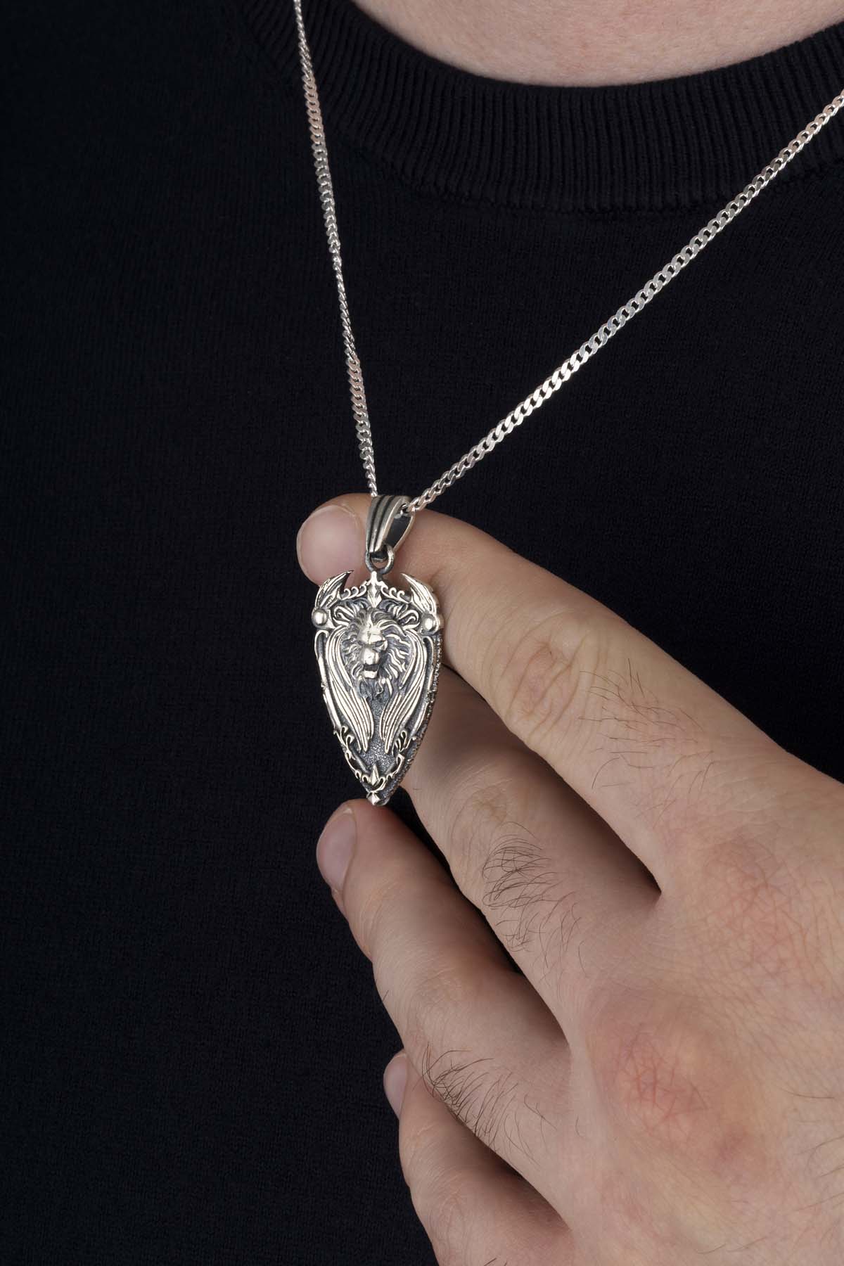 Kalkan Motifli Aslan Başı Gümüş Erkek Kolye - 4