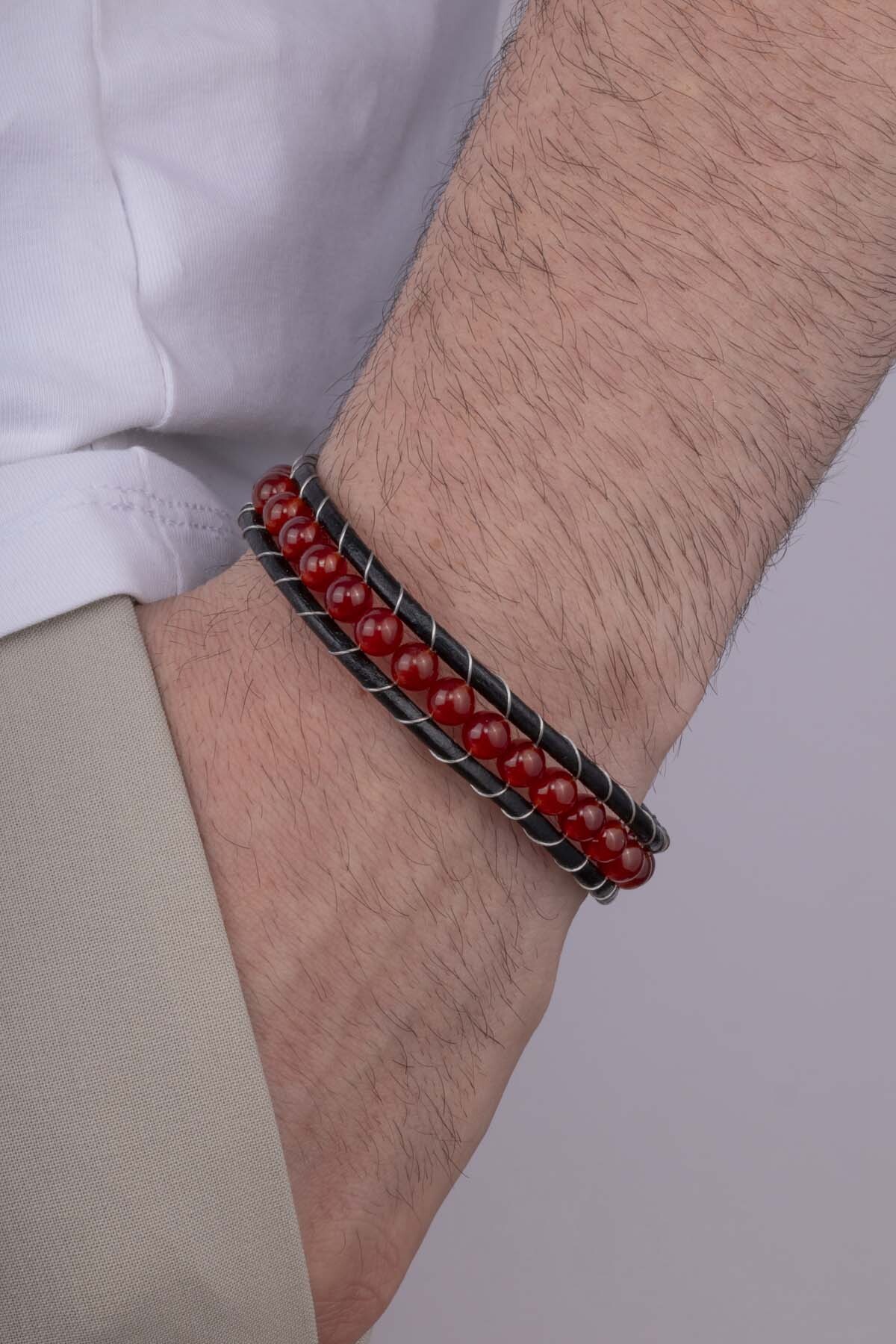 Bu bileklik, siyah deri geçişleriyle modern bir tasarıma sahiptir. Doğal taşın enerjisini zarif bir stil ile birleştiren bu model, hem günlük kullanım hem de özel davetlerde şıklığı tamamlayan bir aksesuar olarak öne çıkar. Deri ile birleşen kırmızı akik boncuklar, hem dayanıklılığı hem de estetik görünümüyle kullanıcıya uzun ömürlü bir deneyim sunar.