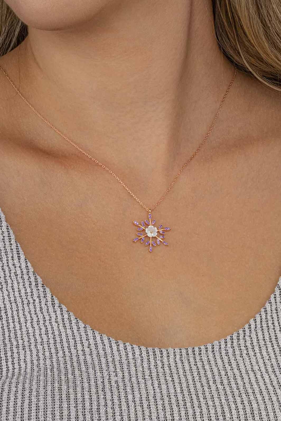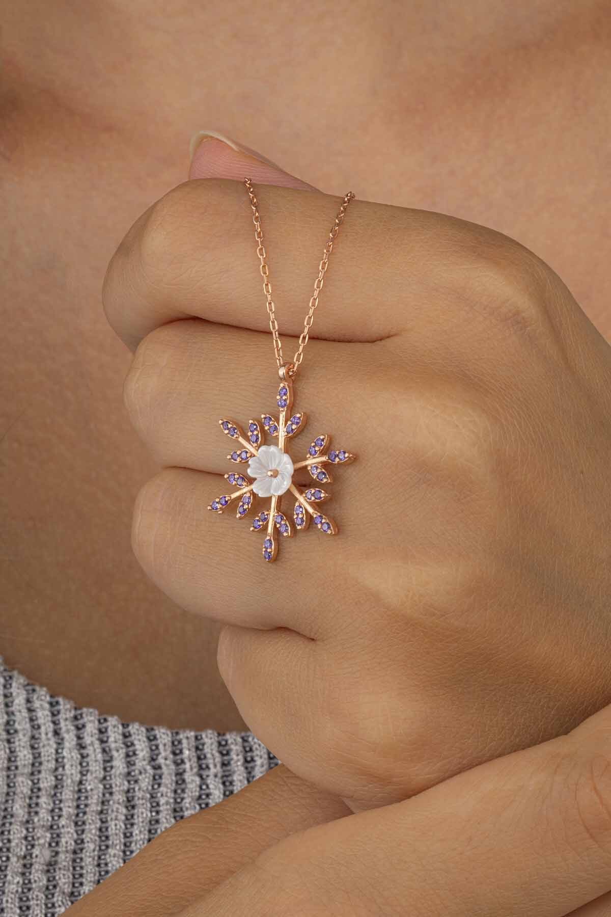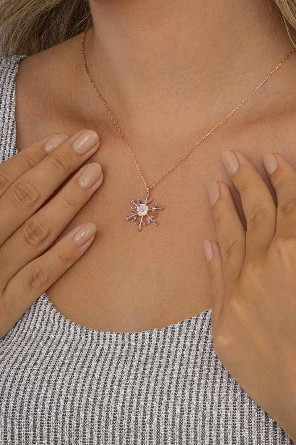 Kar tanesini andıran tasarımı, saflığı ve benzersizliği simgelerken, mor taş detayları kolyeye asil bir parlaklık kazandırır. Her bir taşın özenle yerleştirilmesi, takının kusursuz bir işçiliğe sahip olduğunu gösterir. Hem günlük kullanımda hem de özel günlerde kombinlerinizi tamamlayacak zarif bir takıdır.