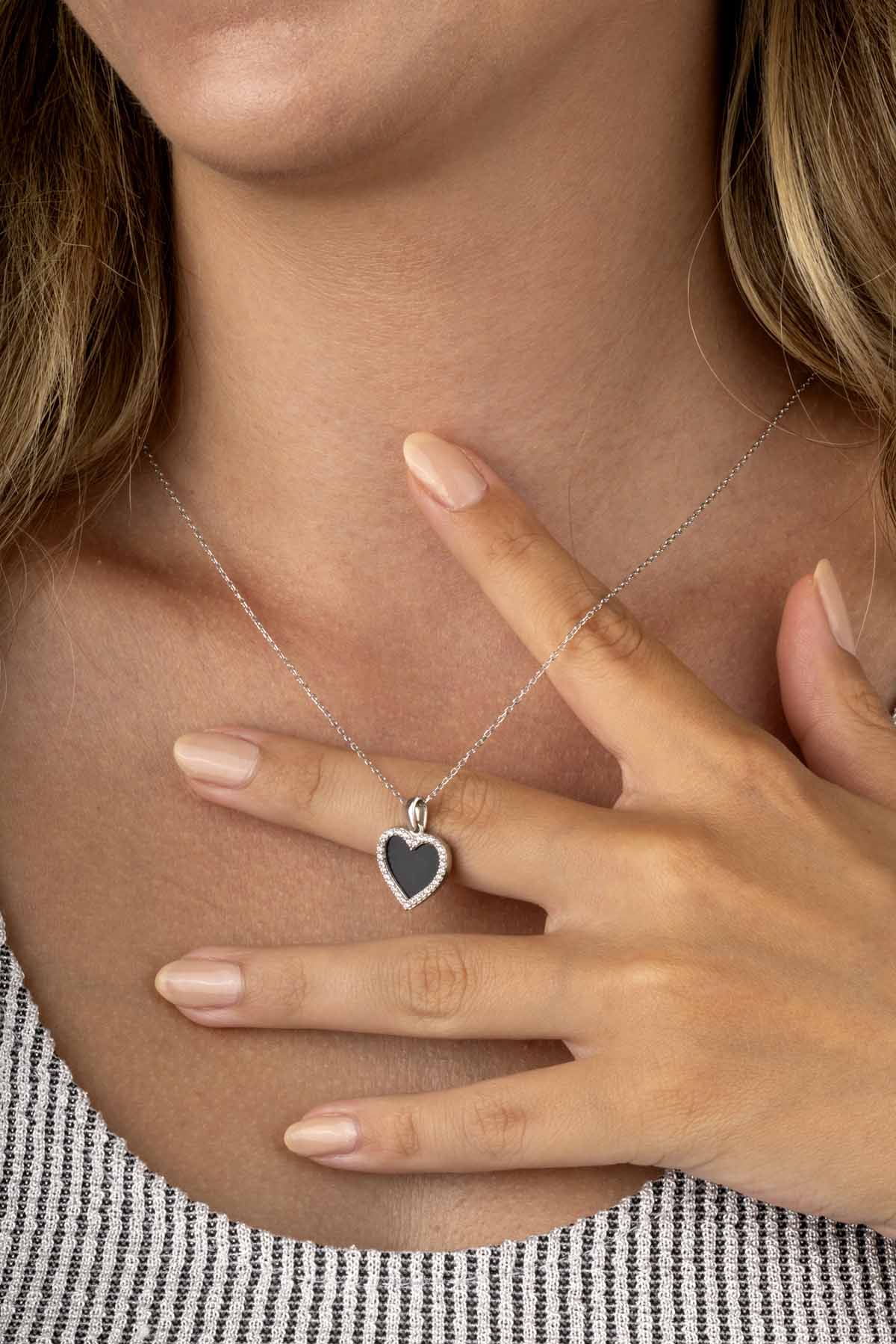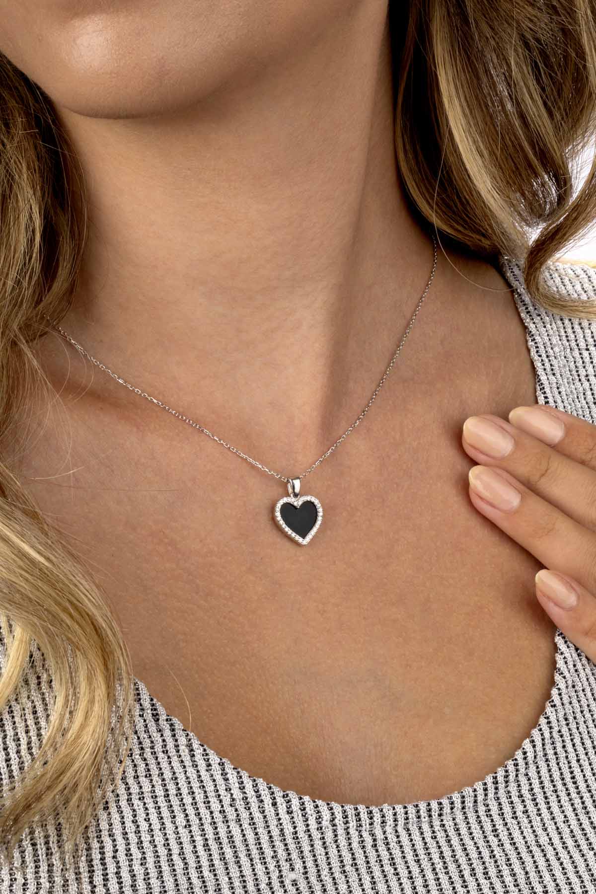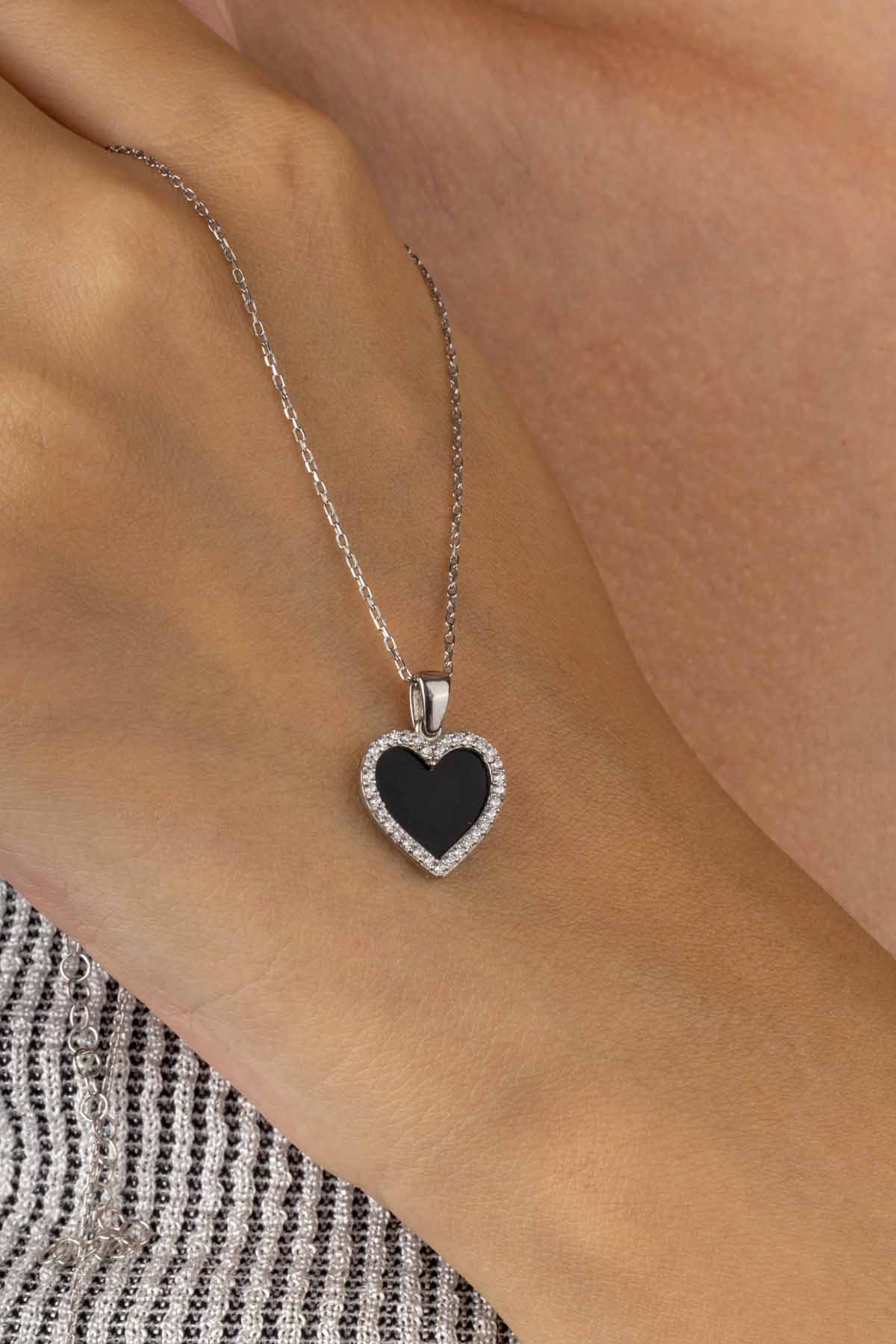 Oniks Taşlı Beyaz Altın Kaplama 925 Ayar Gümüş Kadın Kolye, siyah taşın asaleti ve kalp formunun zarafetiyle şıklığınızı tamamlayan, sevdiklerinize anlamlı bir hediye seçeneği sunan özel bir tasarımdır.