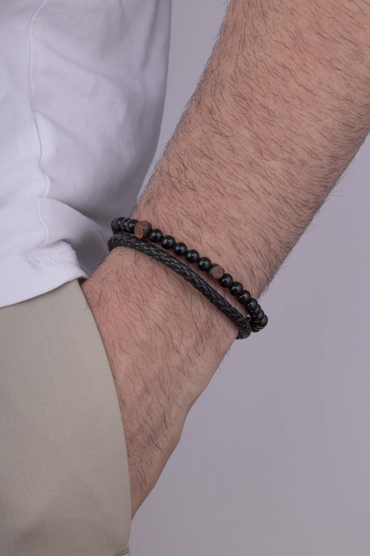 Oniks Taşlı Çift Kordon Örgü Model Erkek Deri Bileklik - 1