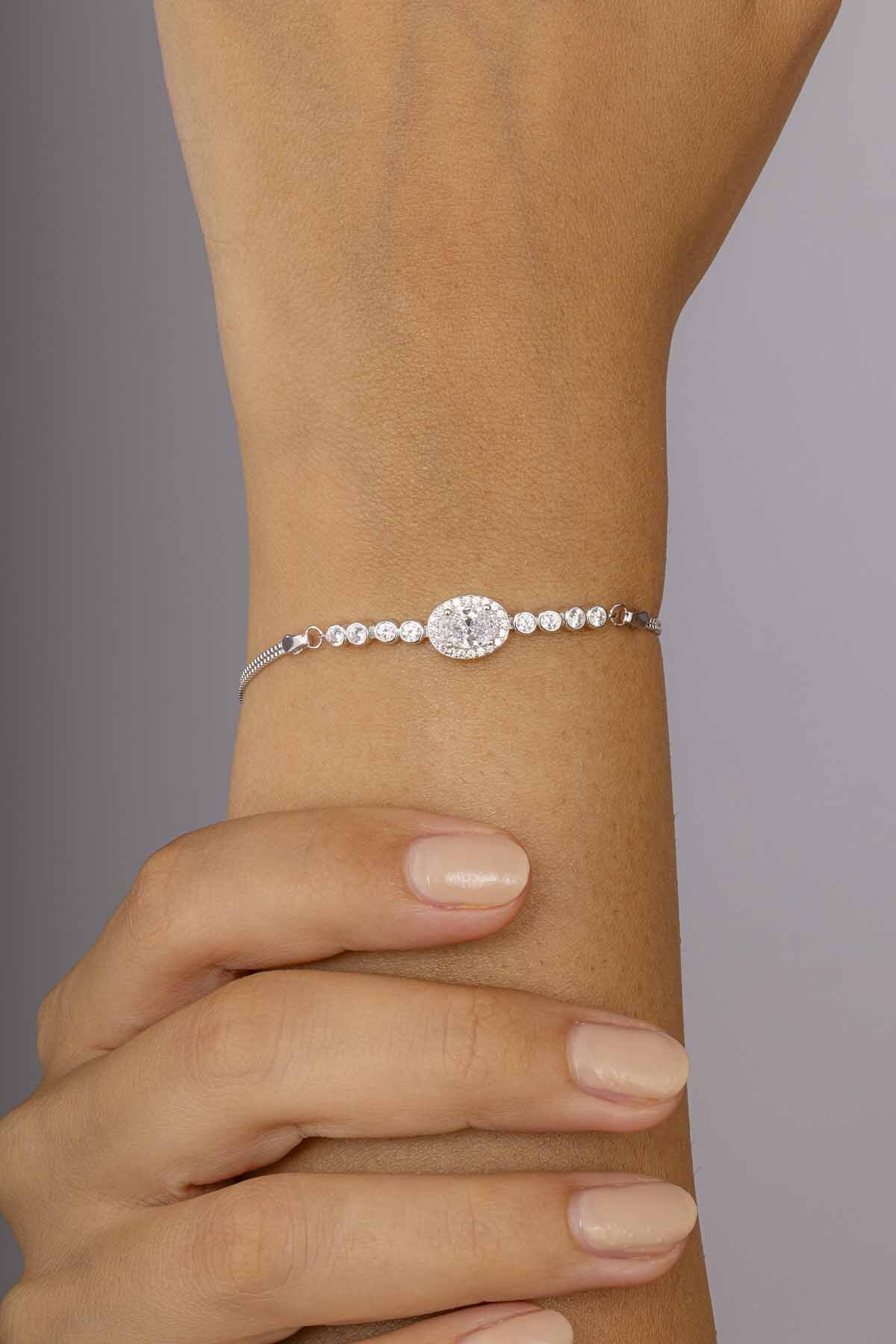 Oval Kesim Zirkon Taşlı 925 Ayar Gümüş Kadın Bileklik - 1