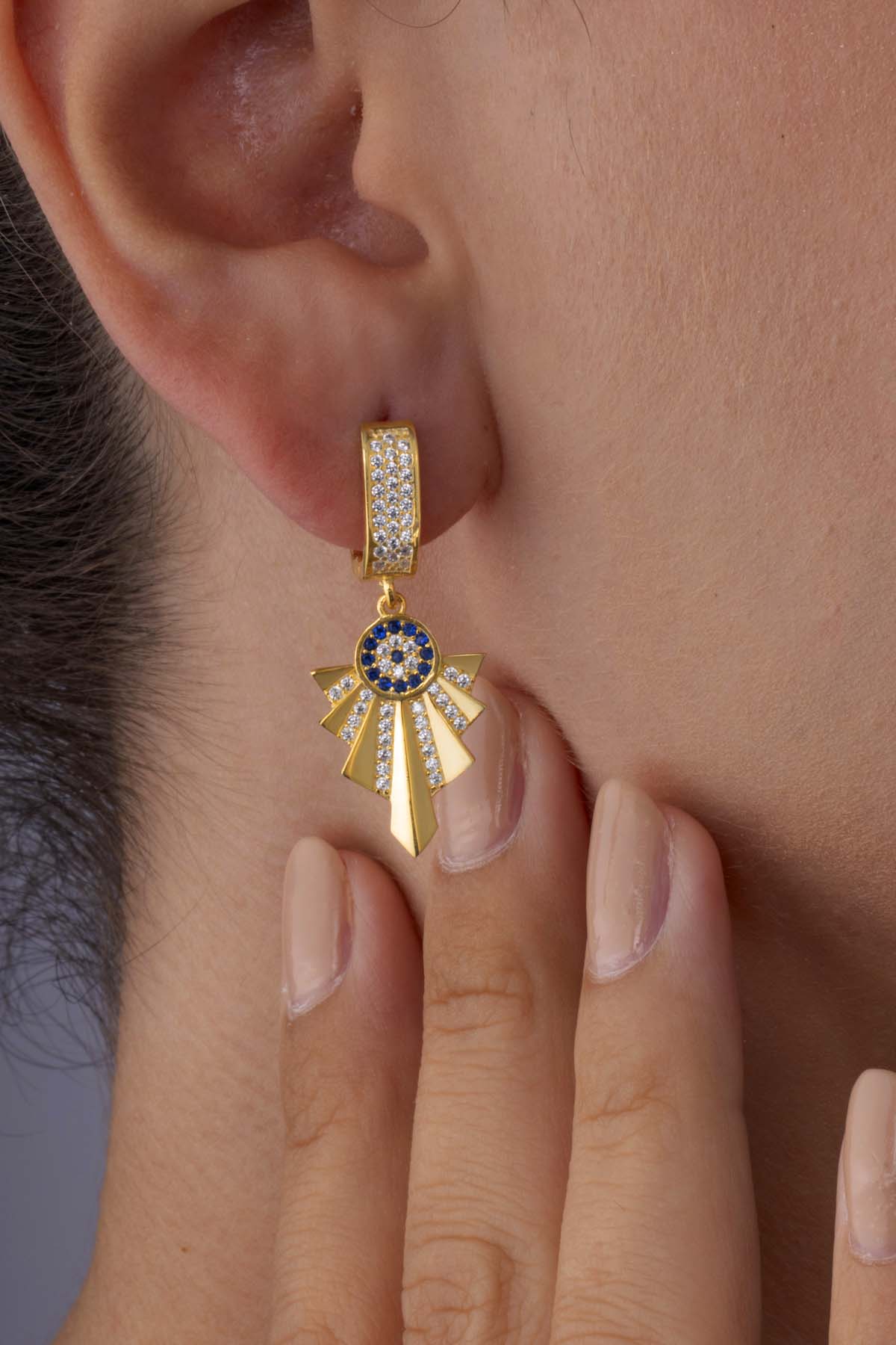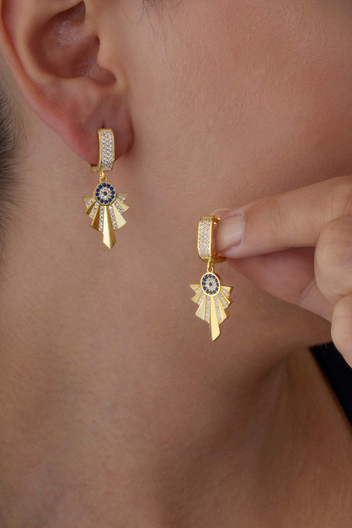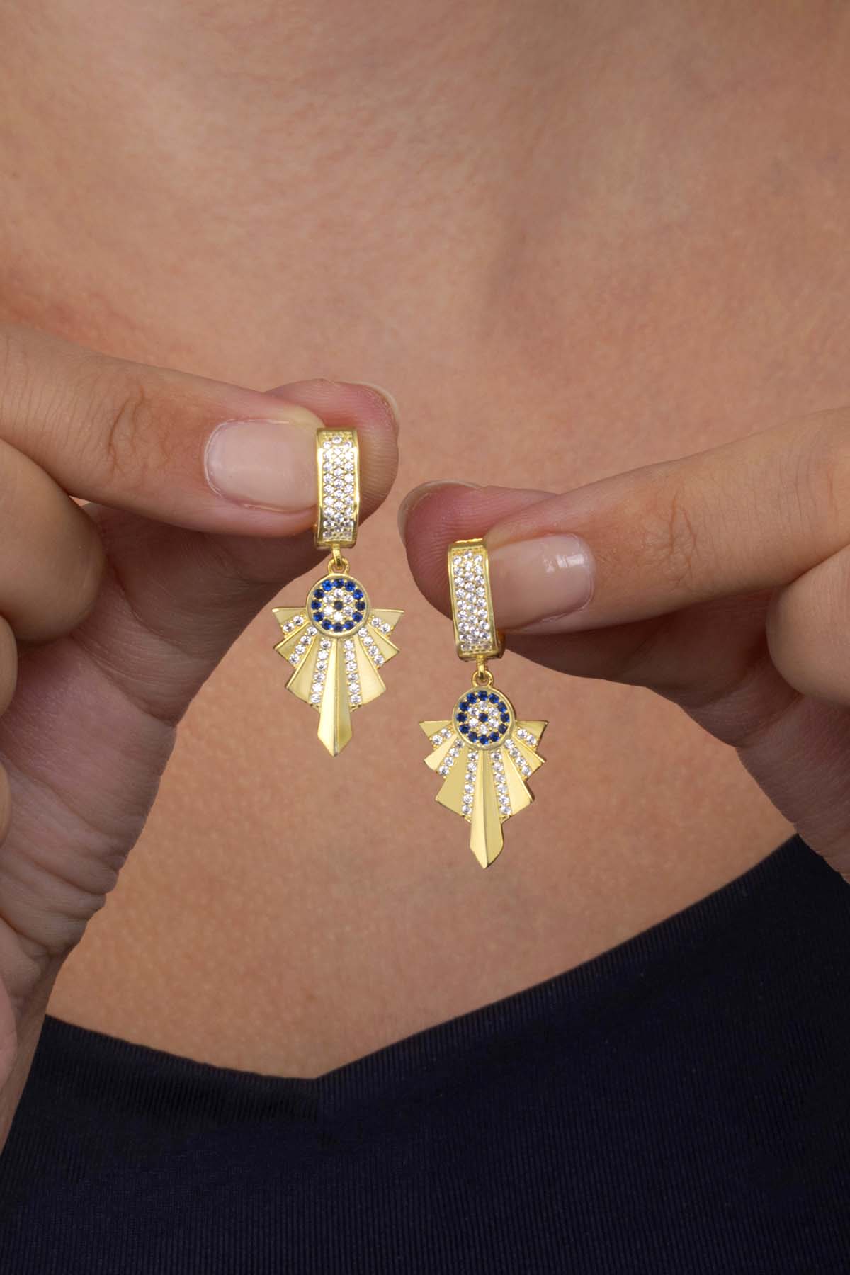 Göz alıcı kalkan formu ve nazar boncuğunun koruyucu enerjisiyle bu küpeler, stilinize hem şıklık hem de güç katıyor.