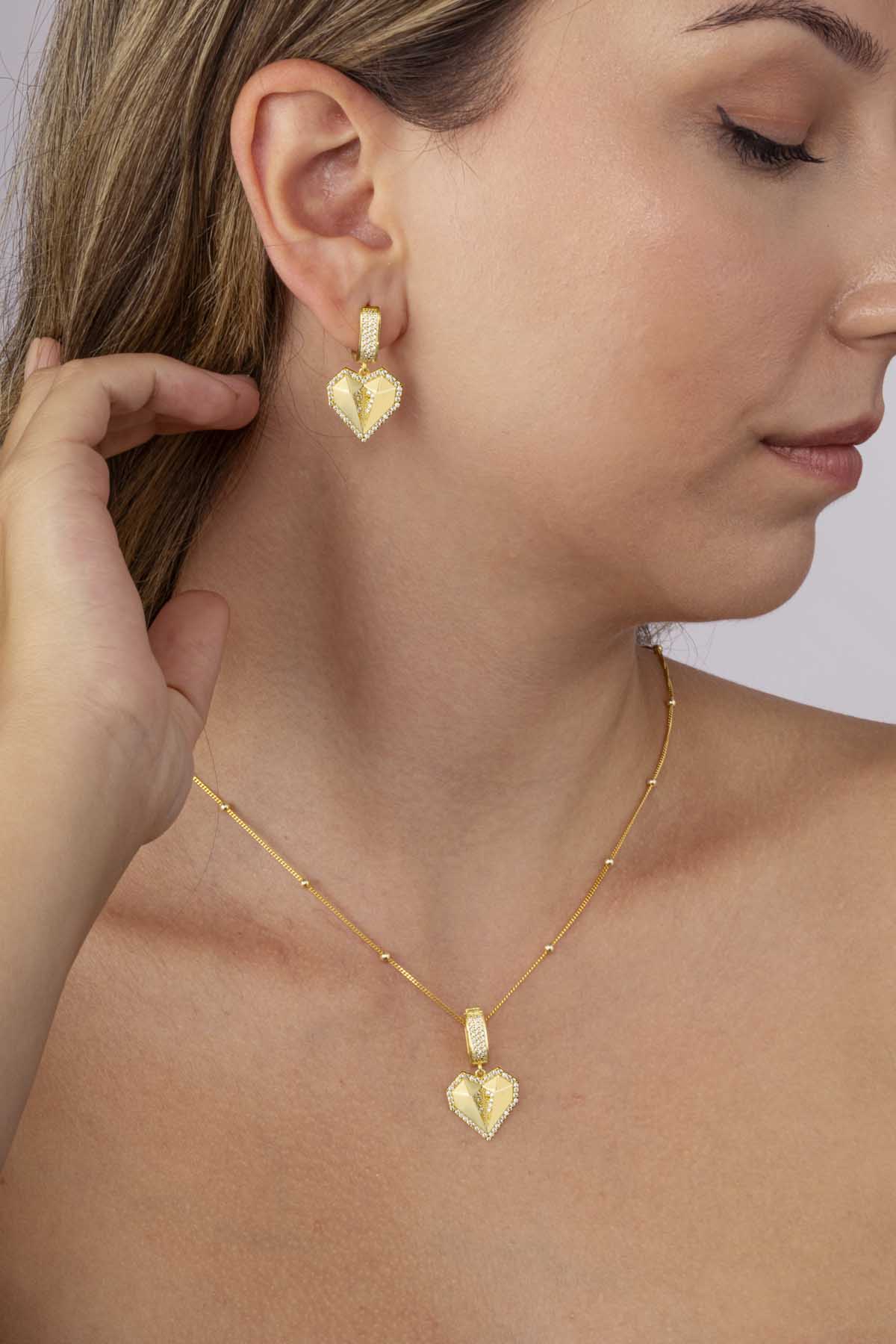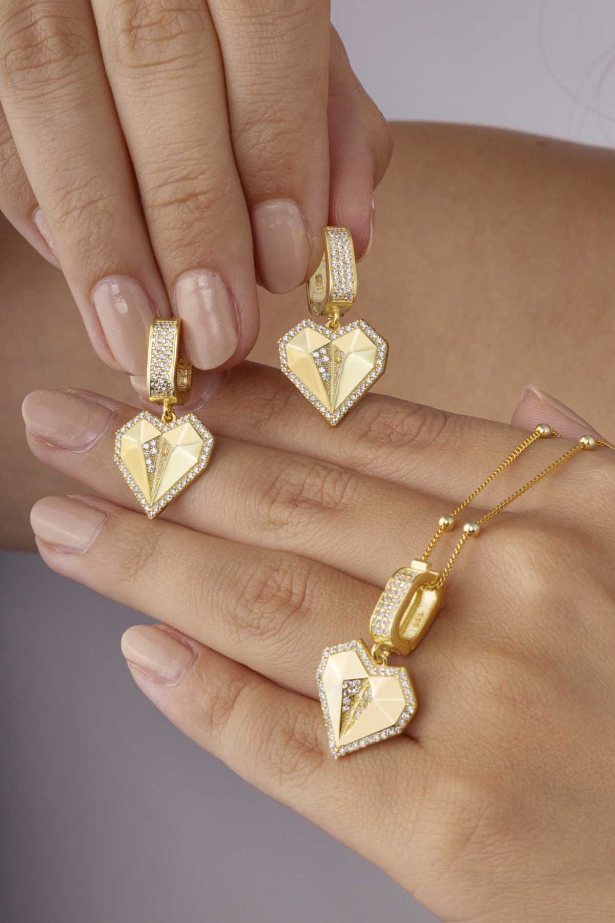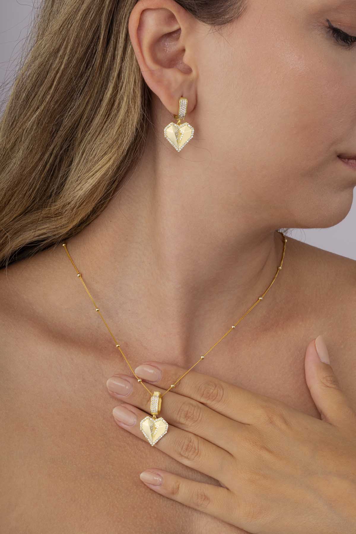 Günlük kullanım için zarif bir dokunuş arayanlar veya özel günlerinde romantik bir şıklık tercih edenler için ideal olan bu set, kalp sembolizminin taşıdığı sevgi, bağlılık ve tutku anlamlarını şık bir şekilde yansıtıyor. Altın kaplama detaylar, zamansız bir zarafet kazandırırken 925 ayar gümüşün kalitesi uzun ömürlü kullanım garantisi sunar.