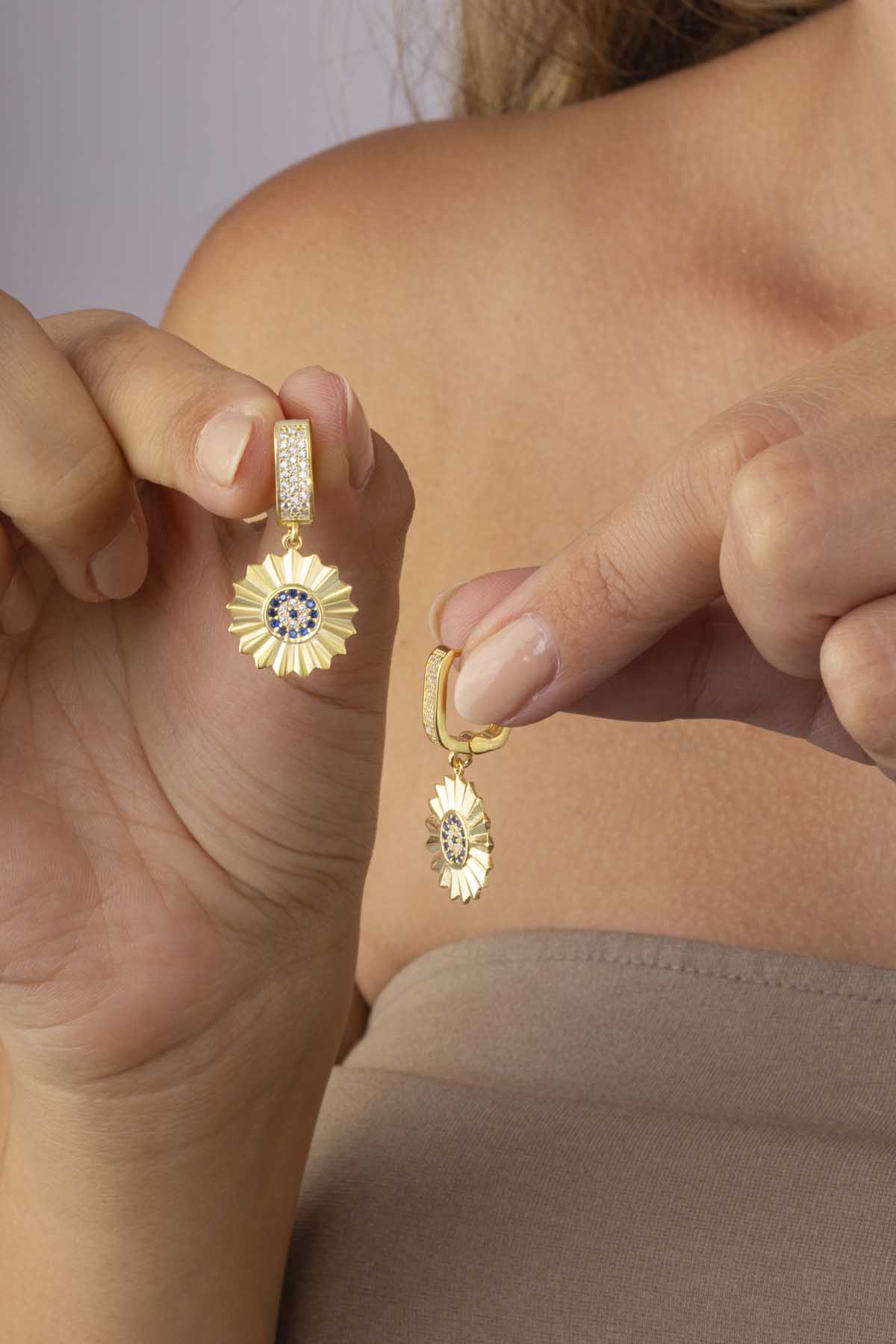 925 ayar gümüş üzerine altın kaplama ile tasarlanan nazar boncuğu küpe, günlük kullanım için ideal bir aksesuardır. Nazar boncuğu sembolü; kötü enerjilerden korunma, huzur ve şansı çekme anlamlarını taşır. Işıltılı taş detayları ve modern tasarımı sayesinde hem klasik hem de trend kombinlere kolayca uyum sağlar. Günlük şıklığınızı tamamlayan bu özel tasarım, aynı zamanda sevdiklerinize anlamlı bir hediye alternatifi olacak. Dayanıklı yapısı ve dikkat çekici tasarımıyla stilinizi güçlendirecek bu küpe, size her an zarafet katacak.