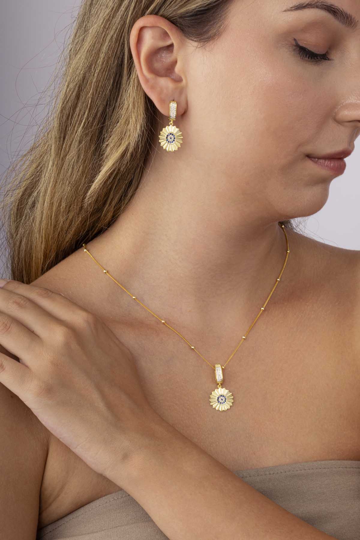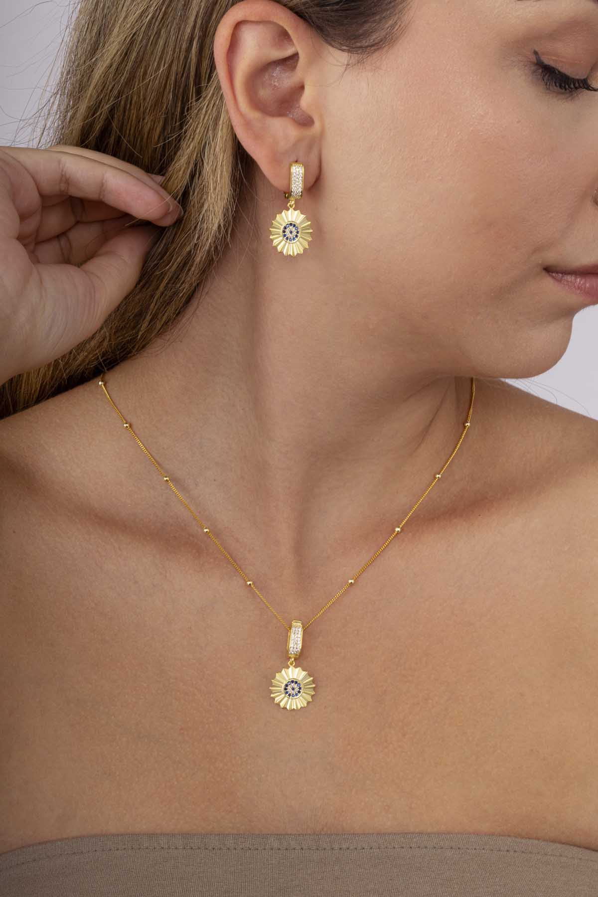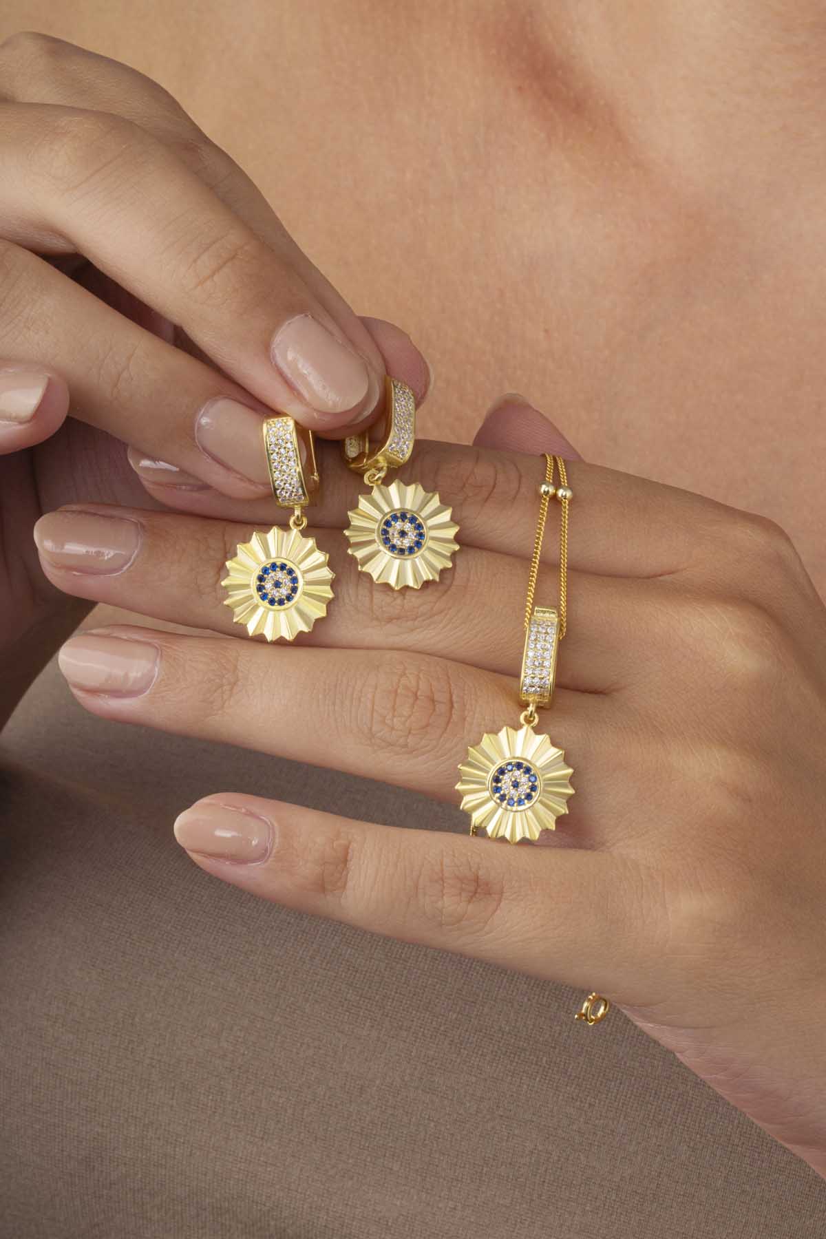 925 ayar gümüş üzerine altın kaplama olarak tasarlanan küpe ve kolye kombini, nazar sembolizmini modern bir zarafetle buluşturuyor. Nazar boncuğu yüzyıllardır kötü enerjilere karşı koruyucu bir sembol olarak kabul edilirken, bu tasarımda altın kaplamanın sofistike ışıltısıyla birleşerek güçlü bir anlam kazanıyor.