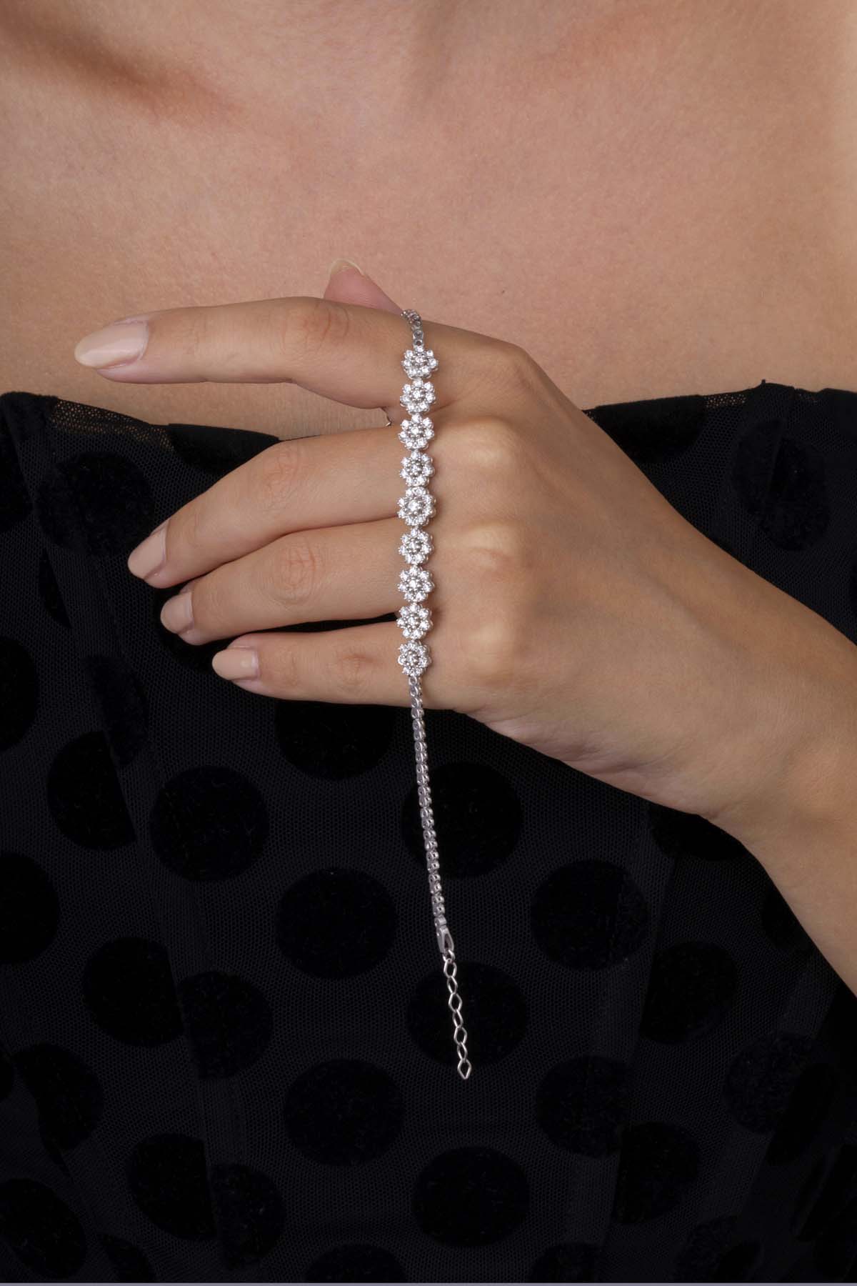 Gelince Haber Ver925 ayar gümüşten ustalıkla üretilen bu zarif bileklik, elmas montür tekniğiyle işlenmiş göz alıcı papatya motifleriyle bezenmiştir. Her bir çiçek formu, ışıltılı taşlarla zenginleştirilmiş olup bilekte zarif ve feminen bir duruş sergiler.