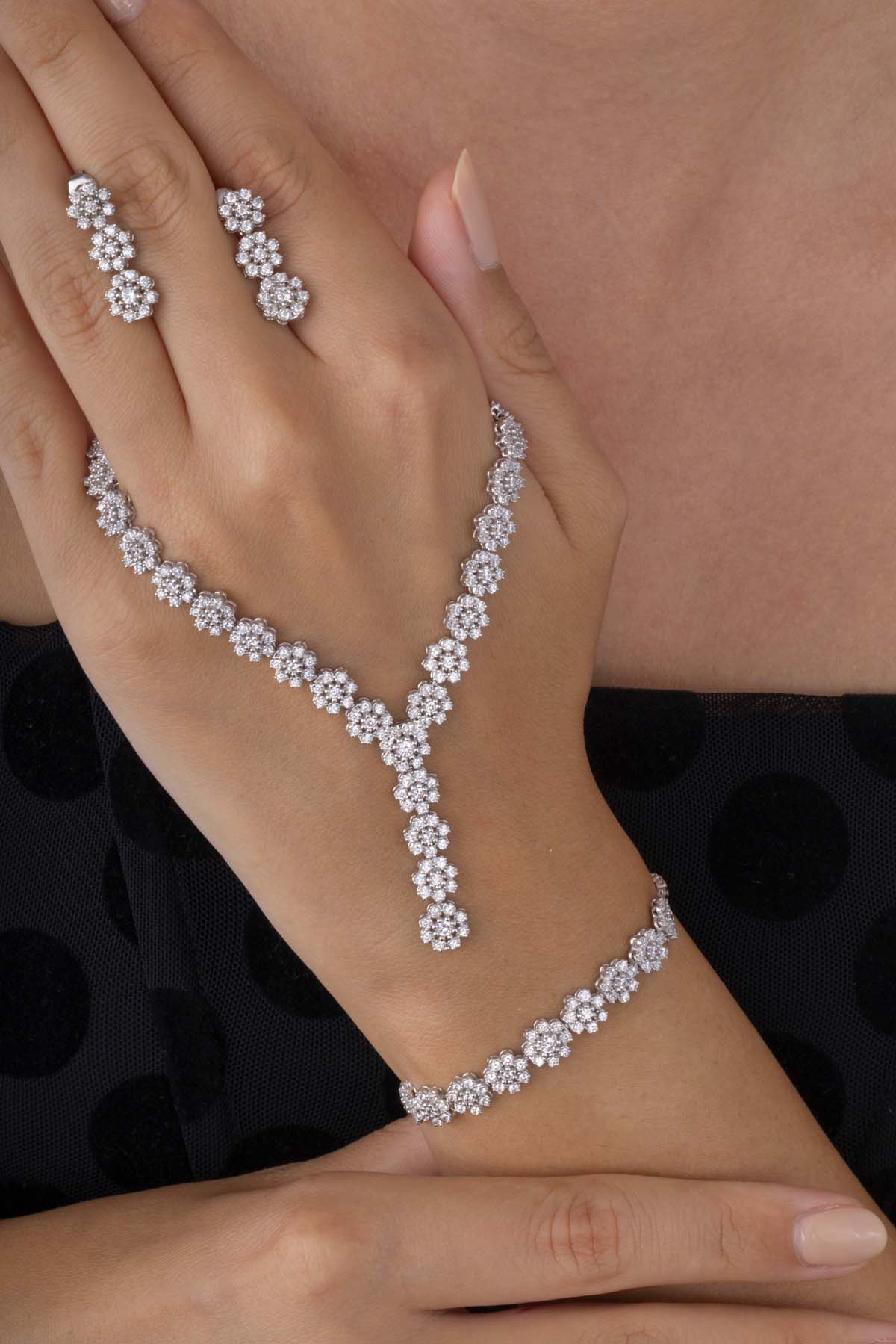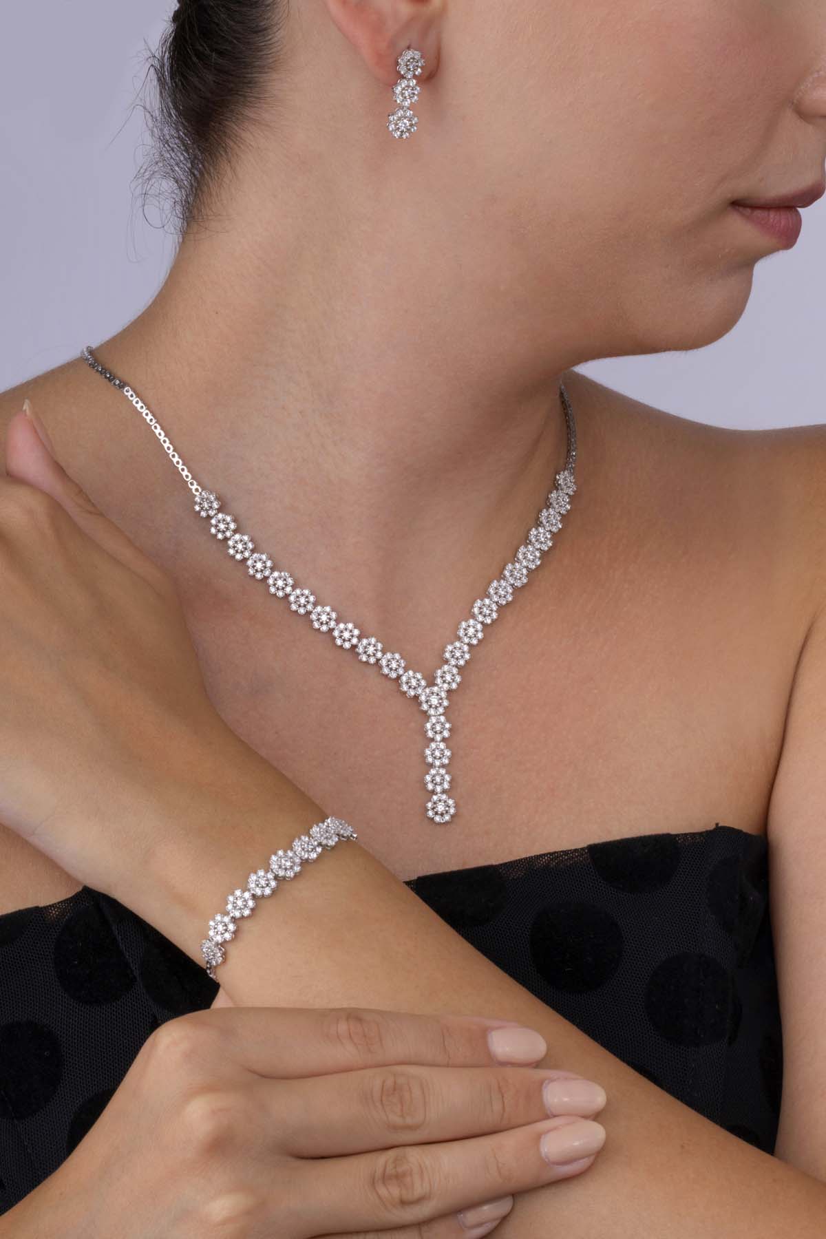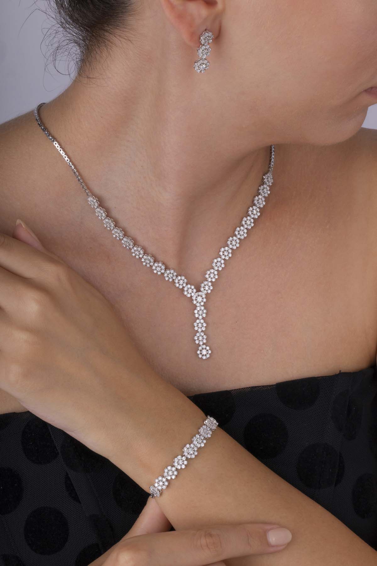 Kolye, boyun hattını zarifçe saran çiçek dizilimiyle dikkat çekerken; bileklik, bilekte narin bir ışıltı sunar. Küpeler ise kulakta hafif ve etkileyici bir düşüş efekti yaratarak yüzü doğal şekilde çerçeveler. Tüm parçalar, taşların yüksek parlaklığı sayesinde ışığı etkileyici biçimde yansıtarak göz alıcı bir uyum sağlar.
