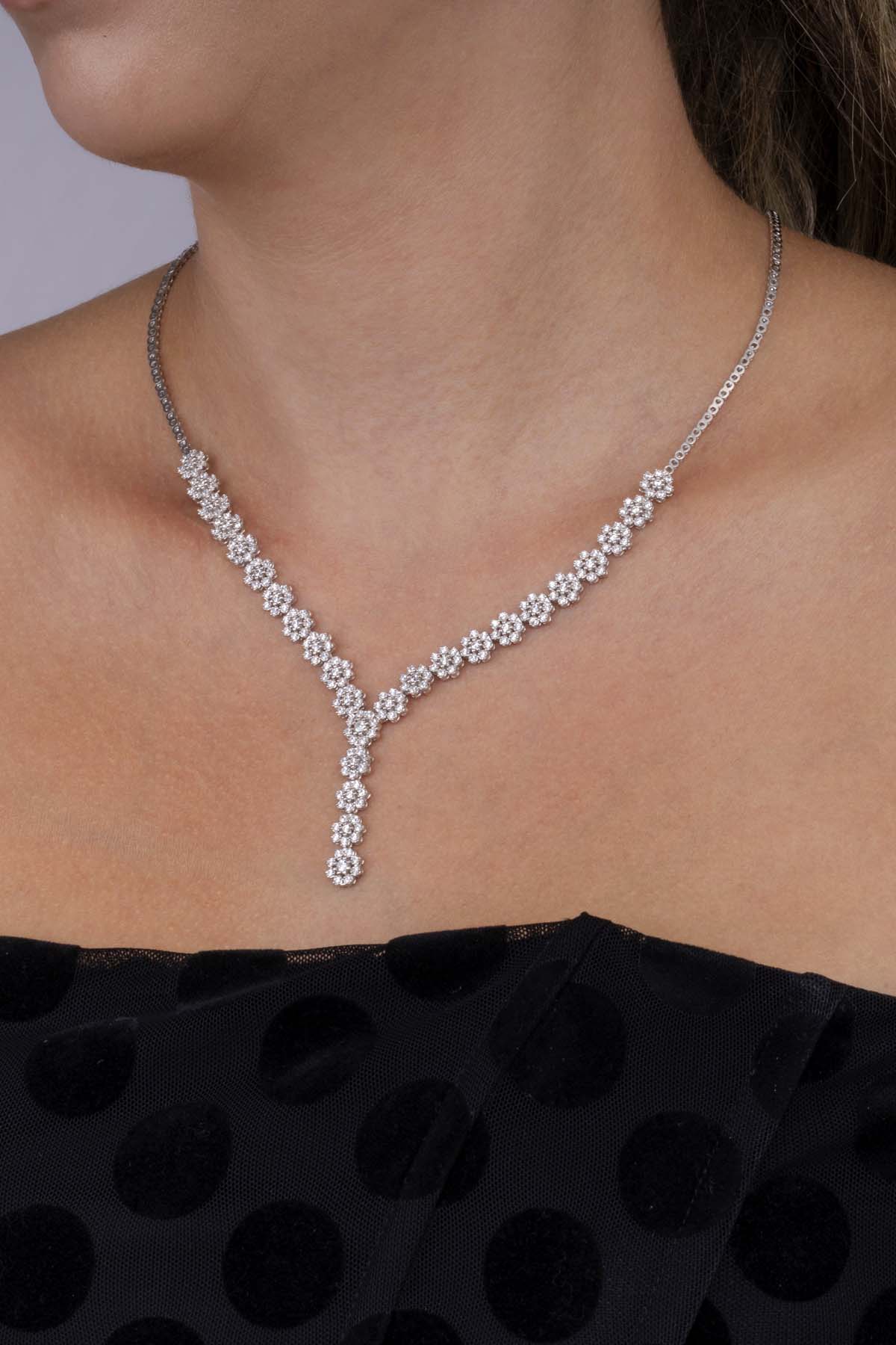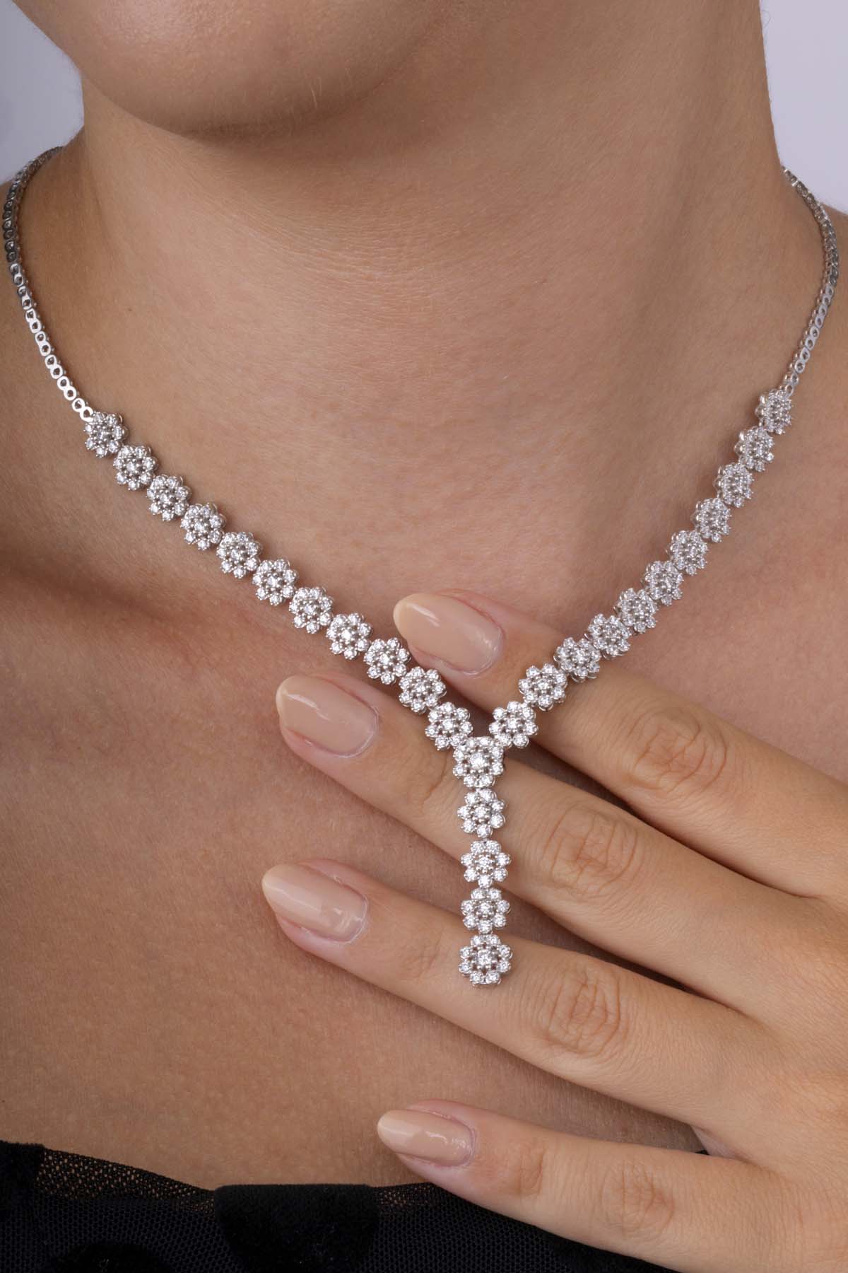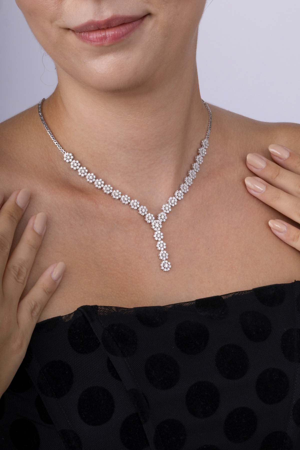 Gelince Haber Ver925 ayar gümüşten titizlikle tasarlanan bu şık kolye, tamamı elmas montür tekniğiyle işlenmiş papatya motiflerinden oluşmaktadır. Her bir çiçek formu, ışıltılı taşlarla bezeli olup kolye boyunca zarif bir akış oluşturur. Kolye ucu V formuyla zarifçe düşerken, ortadaki çiçek detayı tasarımı etkileyici şekilde tamamlar.