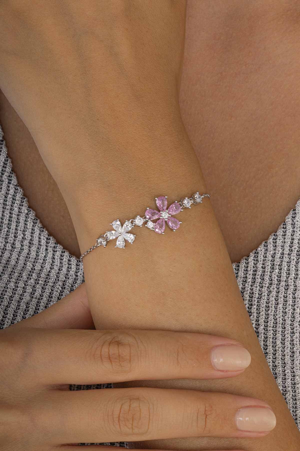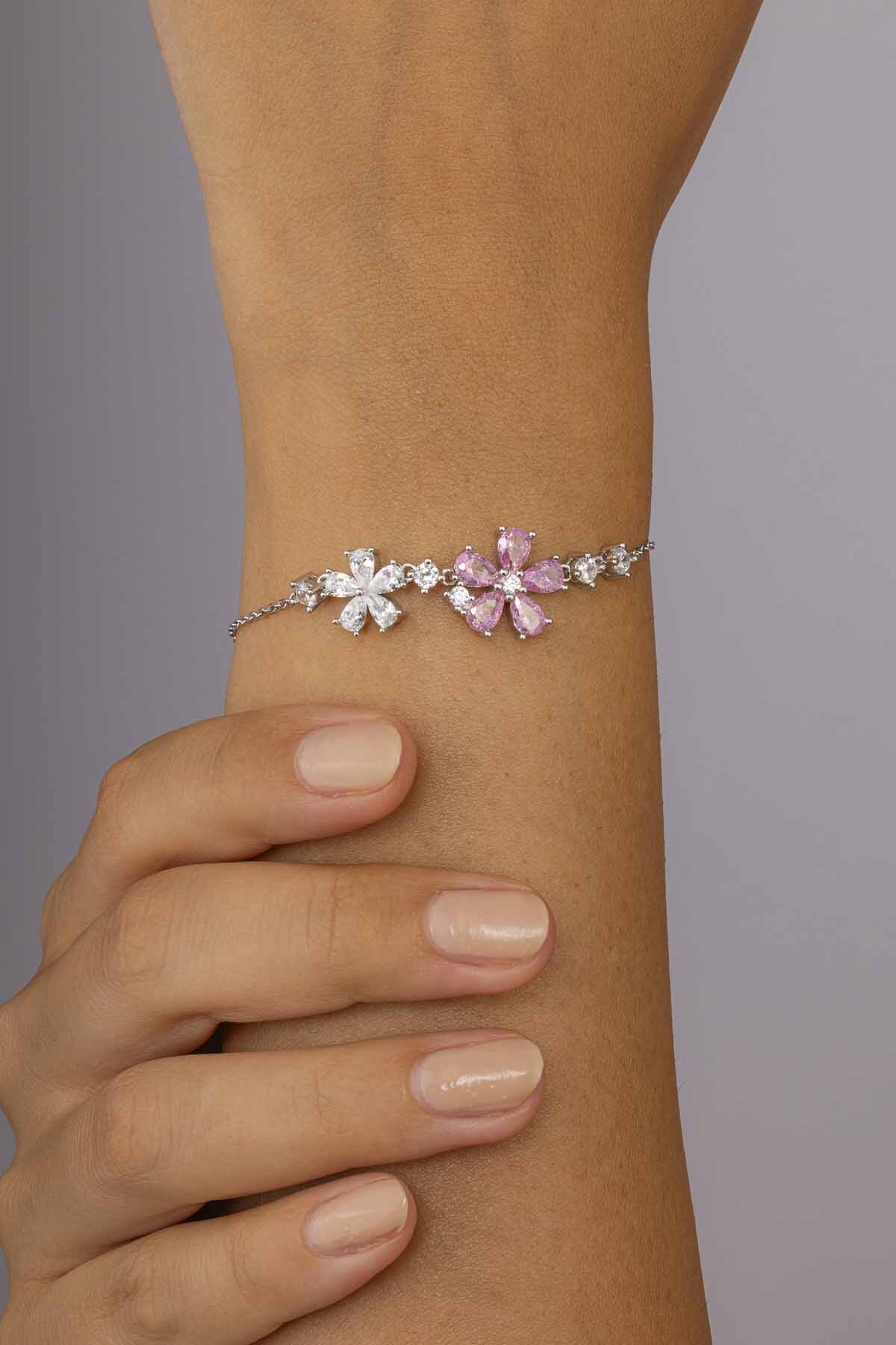 Pembe Beyaz Taşlı İkili Yonca Figürlü 925 Ayar Gümüş Bileklik