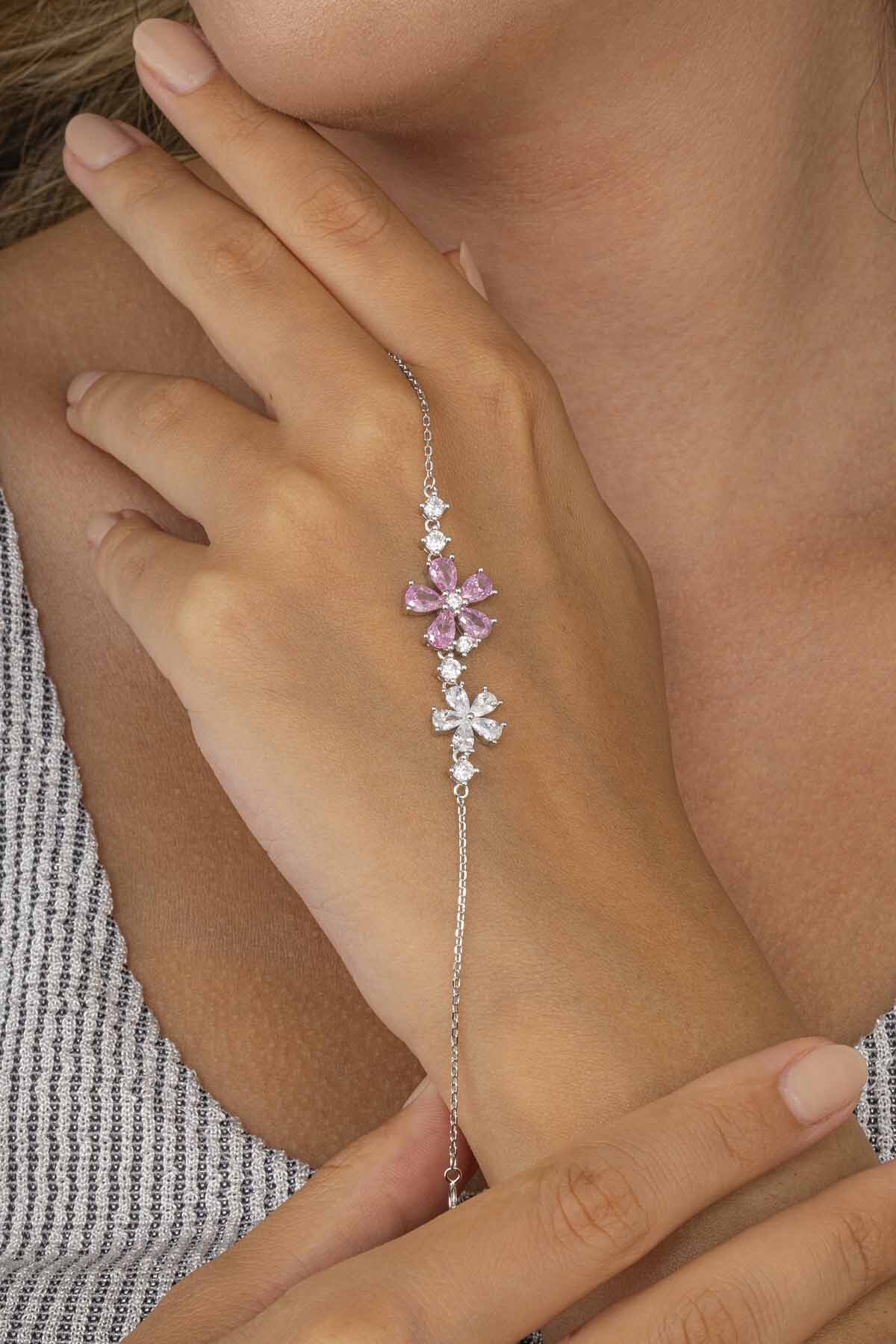 Pembe Beyaz Taşlı İkili Yonca Figürlü 925 Ayar Gümüş Bileklik - 2