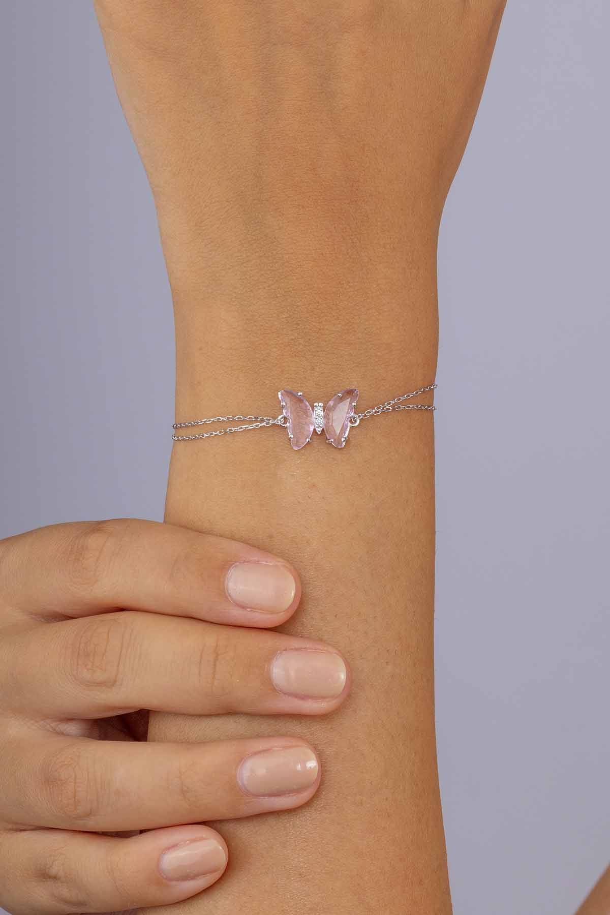 Pembe Taşlı Kelebek Gümüş Bileklik - 1