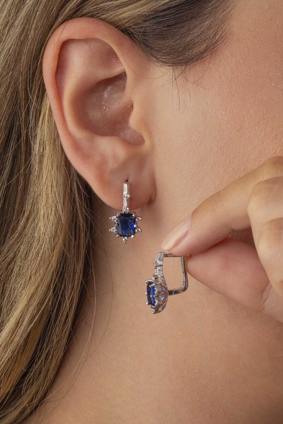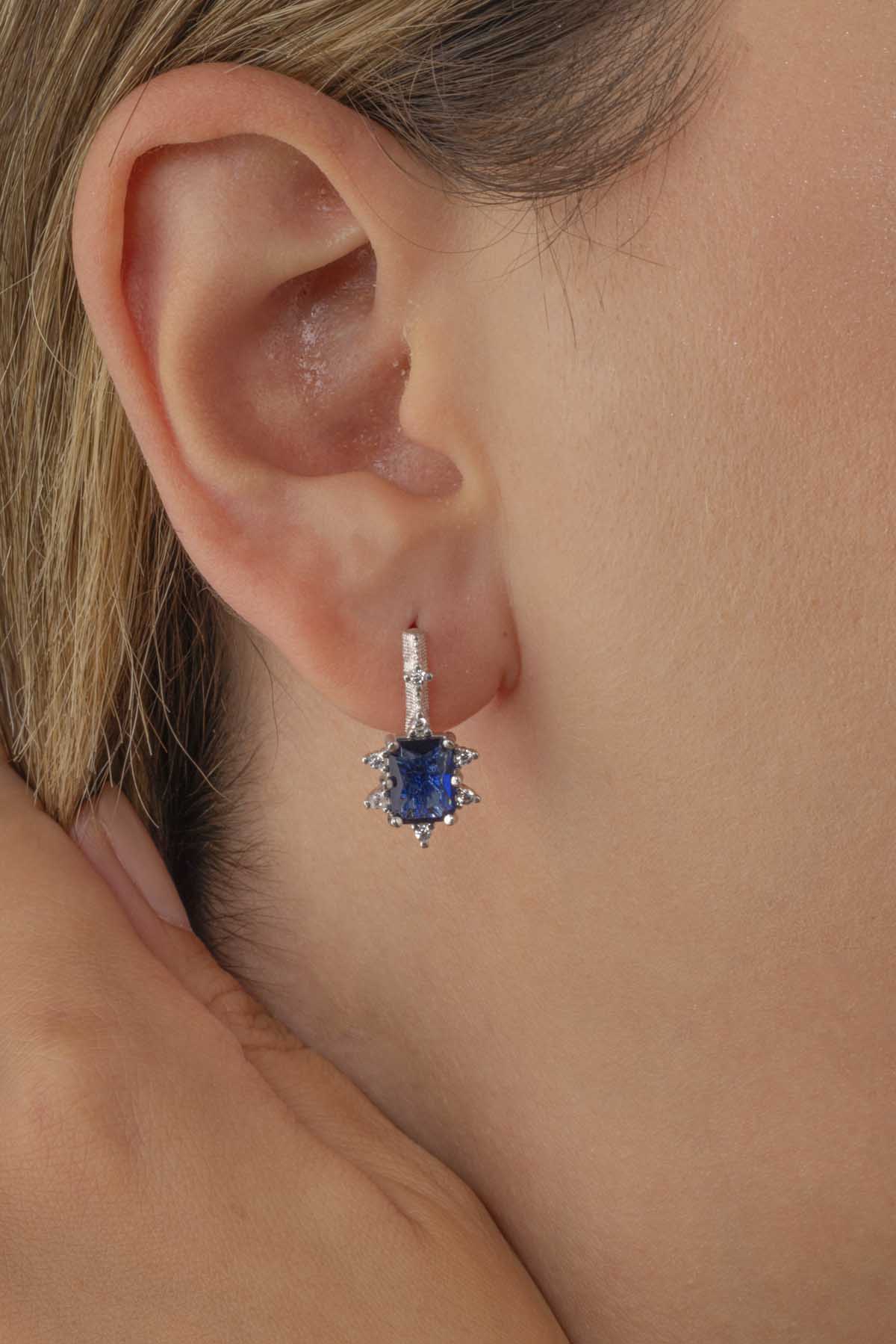 Pırlanta Montür Prenses Tektaş Gümüş Küpe Safir - 1