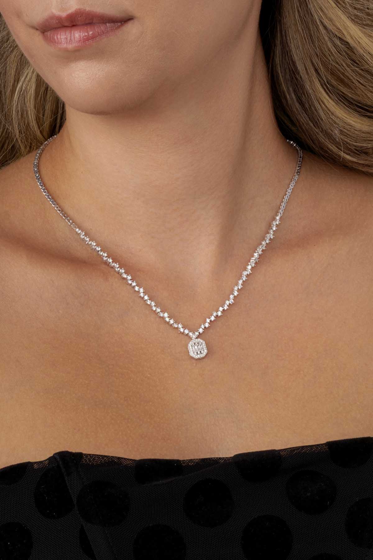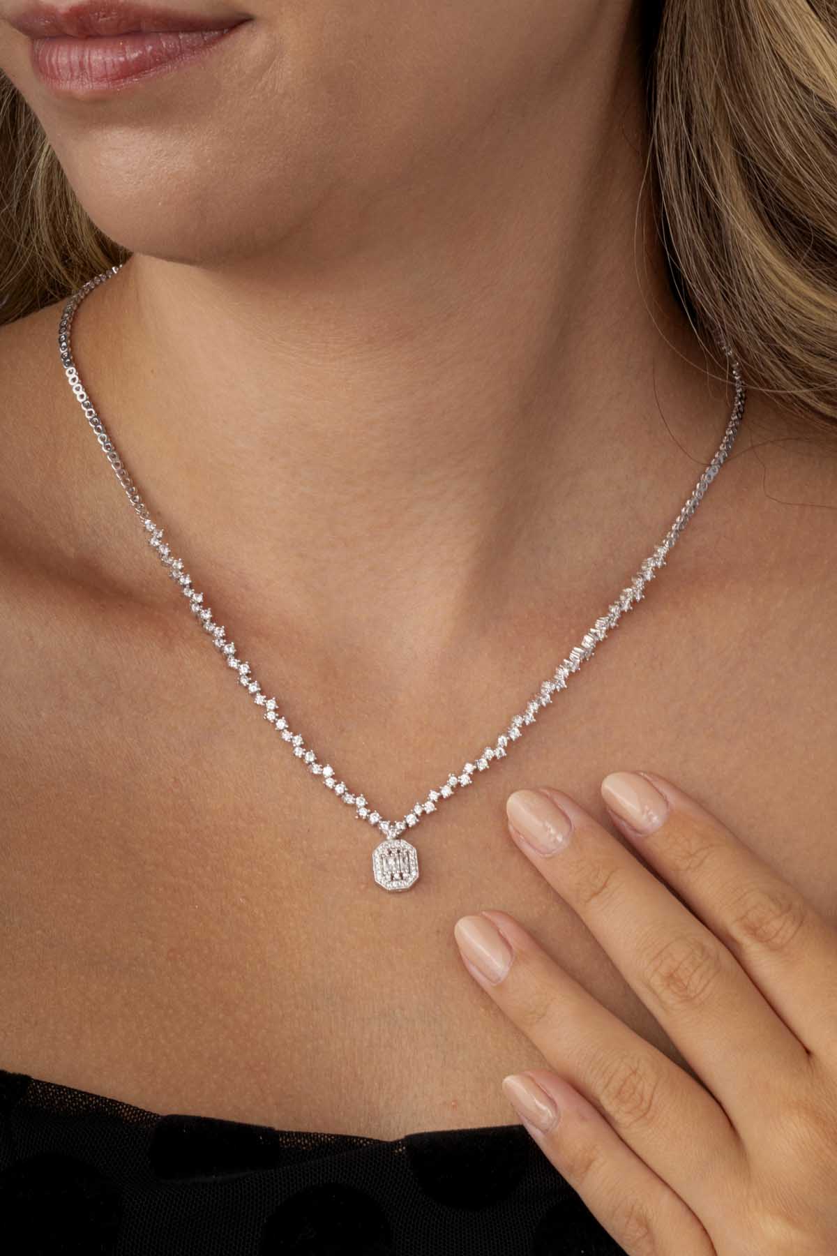 Pırlanta Montür Sıralı Tek Taş Rodyum Kaplama Baget Gümüş Kolye - 4