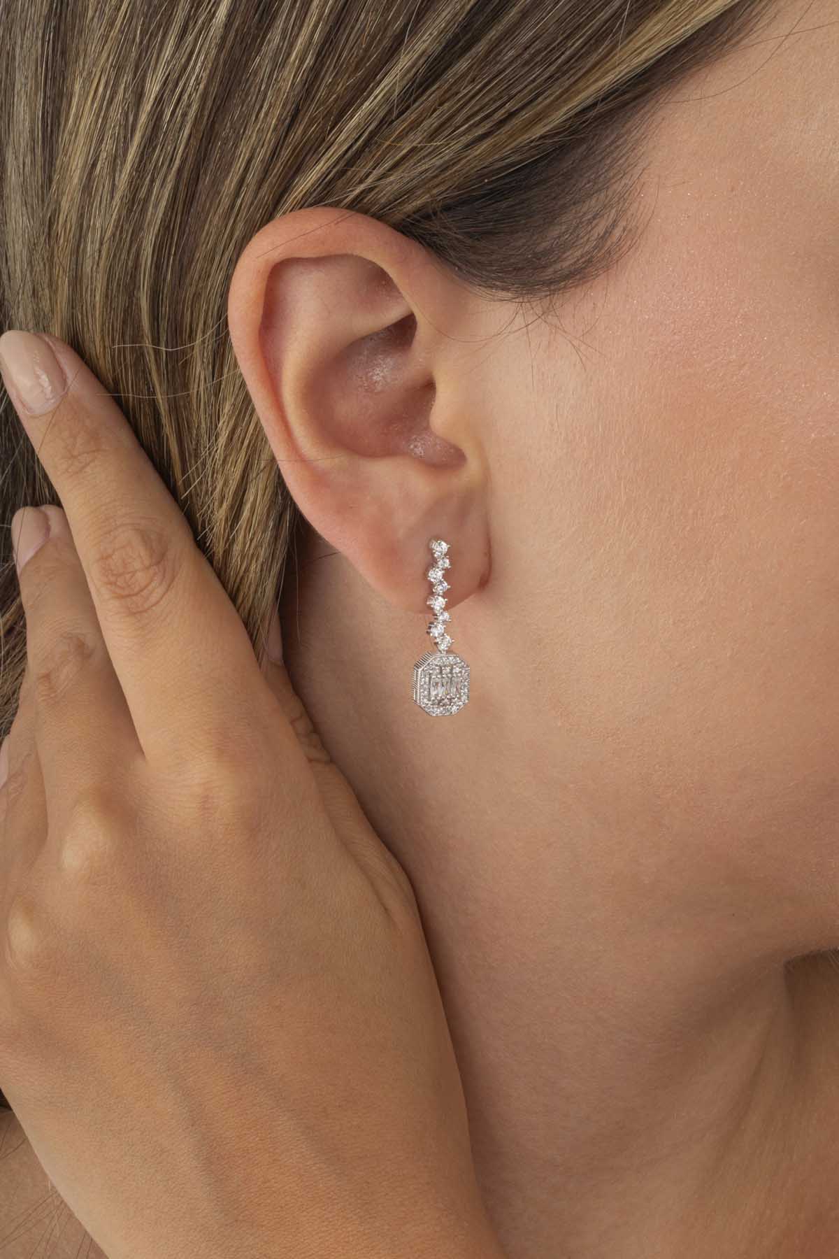 Pırlanta Montür Sıralı Tek Taş Rodyum Kaplama Baget Gümüş Küpe - 4
