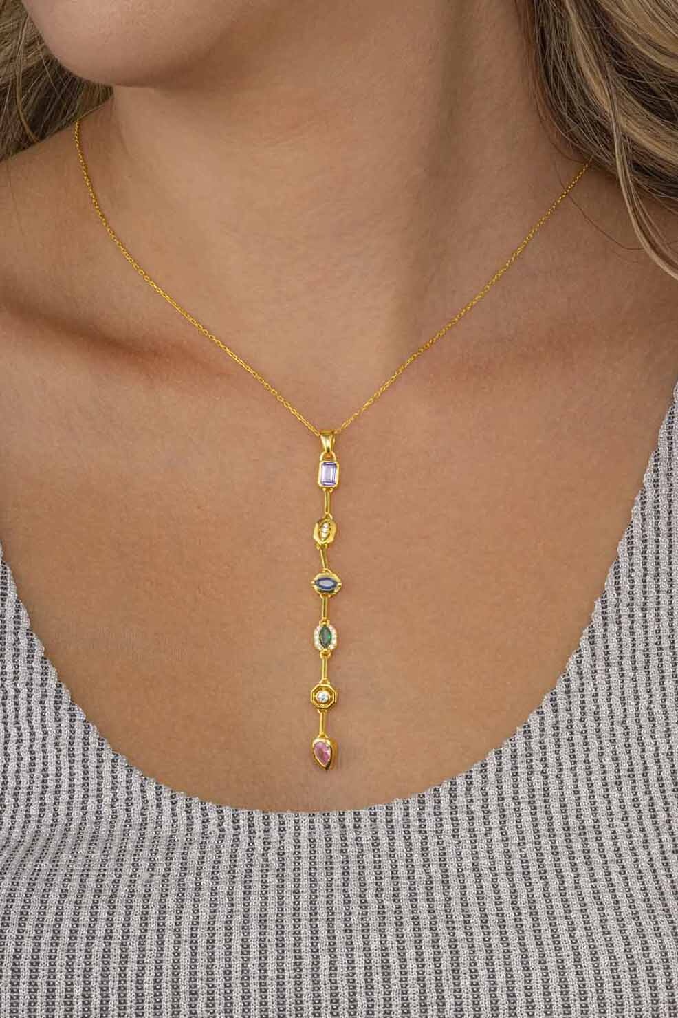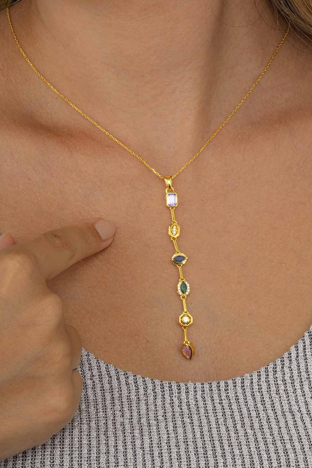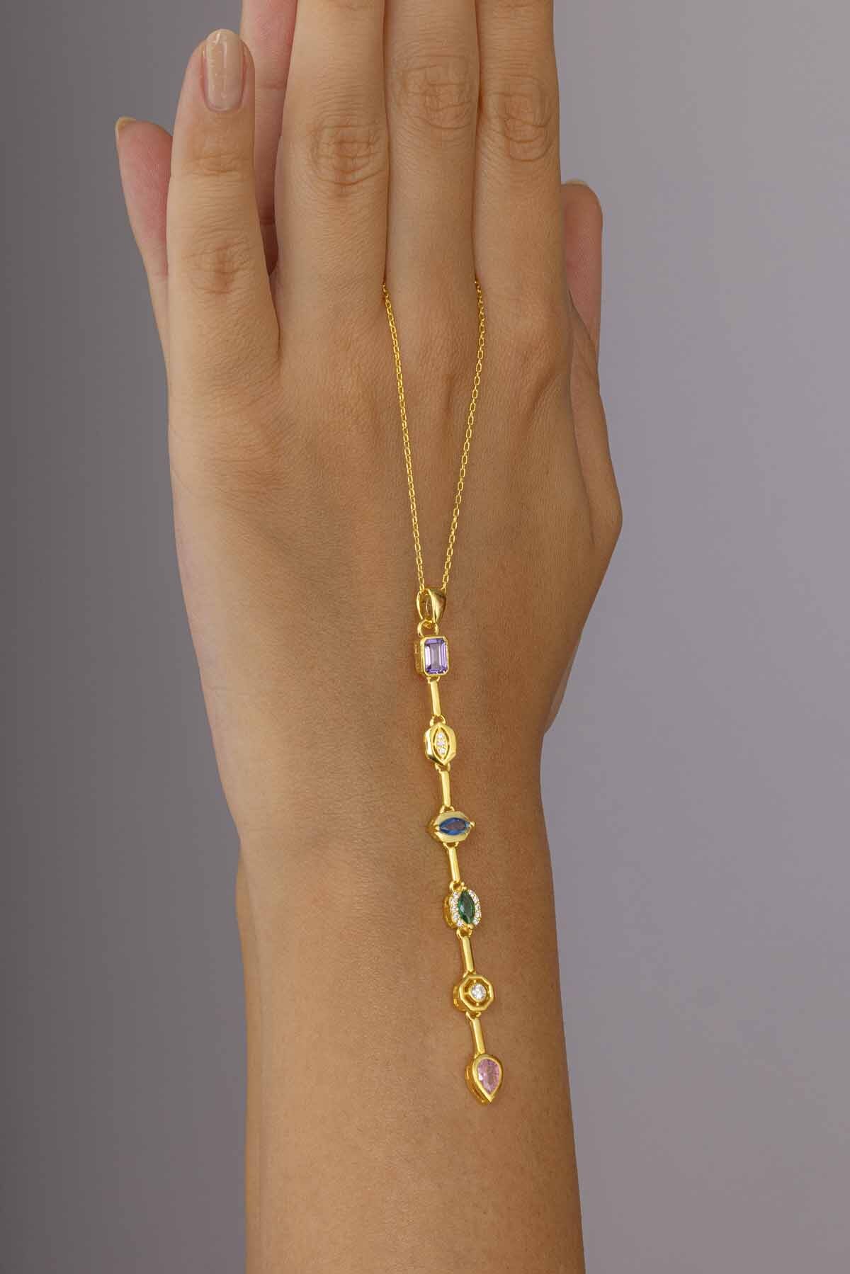 Renkli taşlı süzme altın kaplama kadın gümüş kolye, modern tasarımı ve göz alıcı detaylarıyla şıklığı tamamlayan özel bir aksesuardır. 925 ayar gümüş üzerine altın kaplama ile üretilen bu kolye, farklı şekil ve renklerde taşlarla zenginleştirilmiştir. Zarif zincir tasarımı ve dikey formdaki taş dizilimi, boyunda şık ve uzun bir görünüm sağlar.