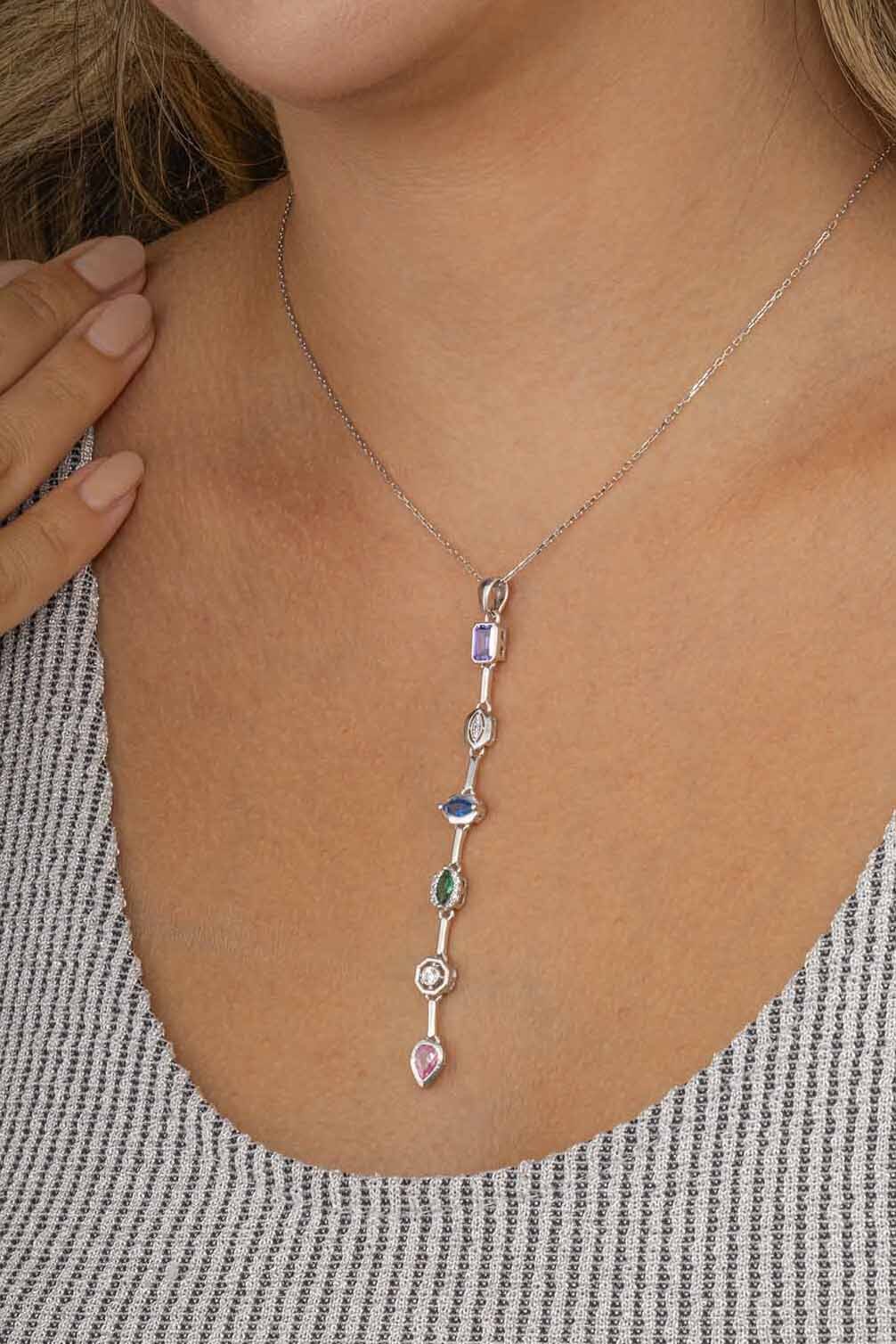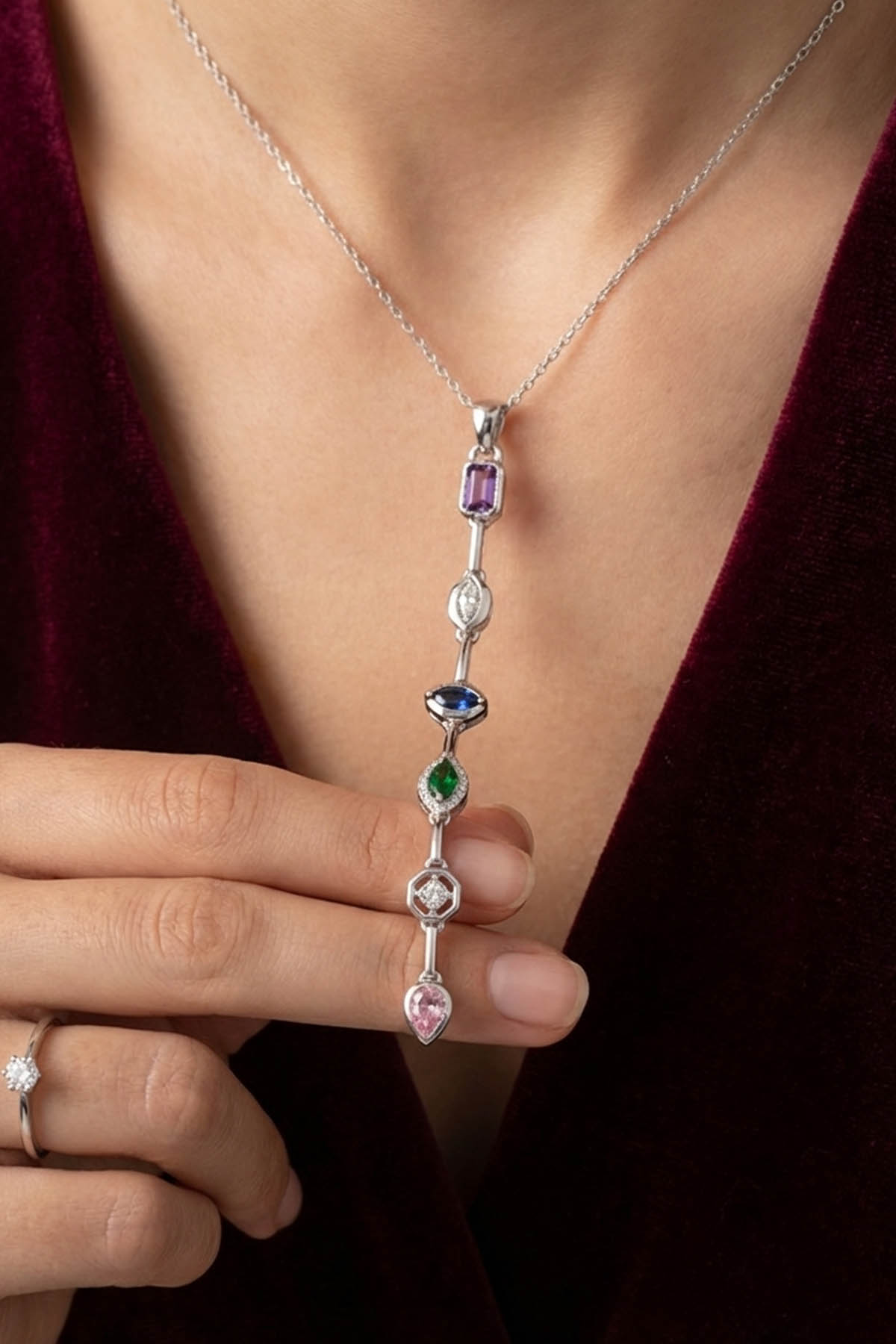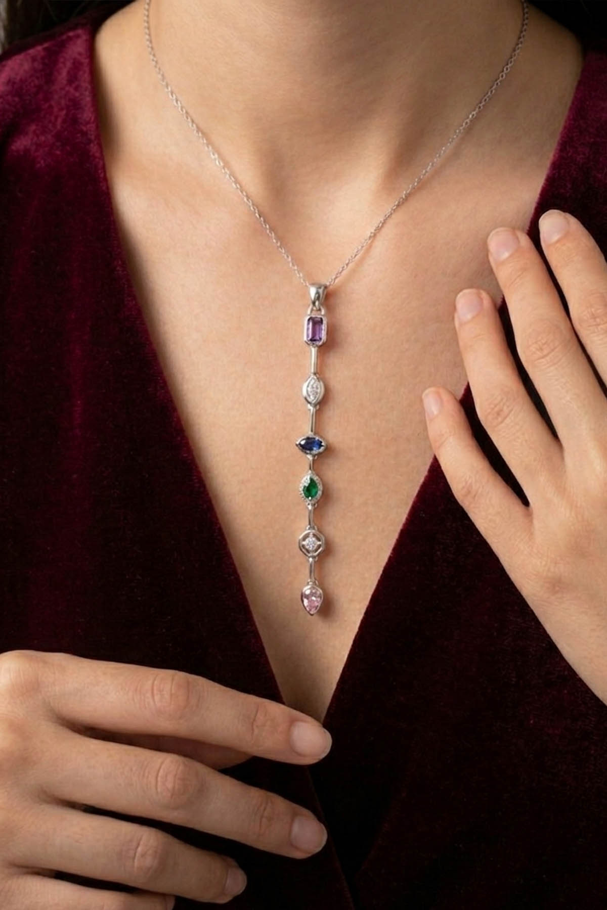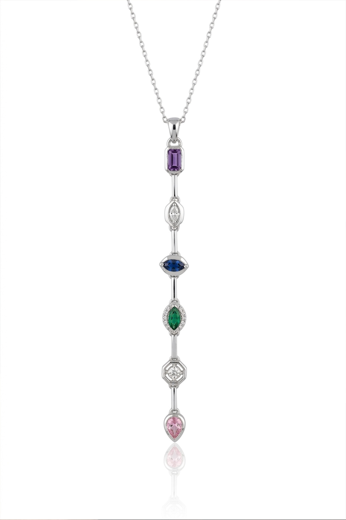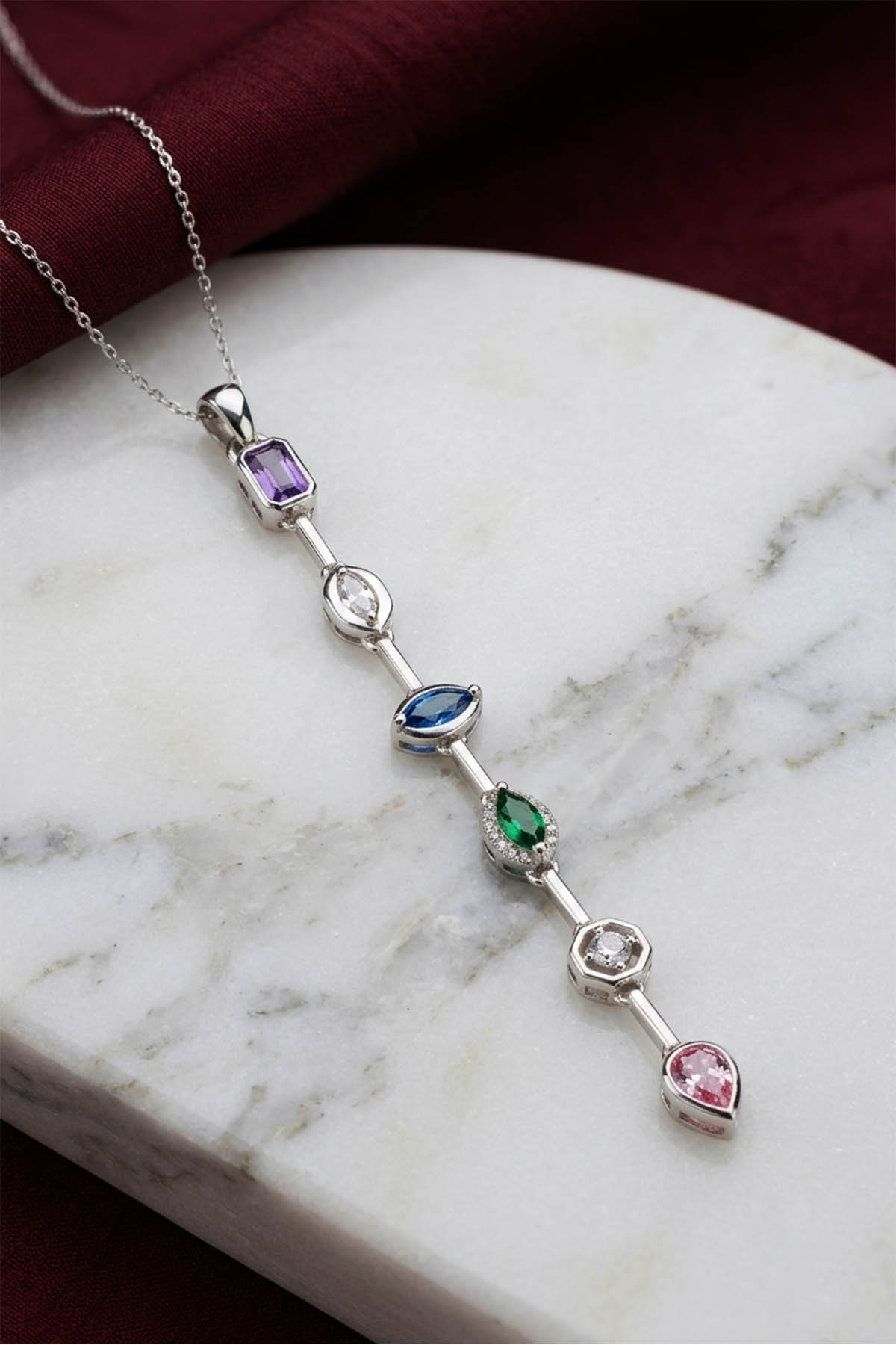Kolye üzerinde yer alan mor, mavi, yeşil, pembe ve beyaz tonlarındaki taşlar, ışığın geliş açısına göre parlayarak etkileyici bir ışıltı oluşturur. Minimalist ama aynı zamanda göz alıcı bir yapıya sahip olan bu tasarım, hem günlük kullanım hem de özel davetler için şık bir tamamlayıcıdır.