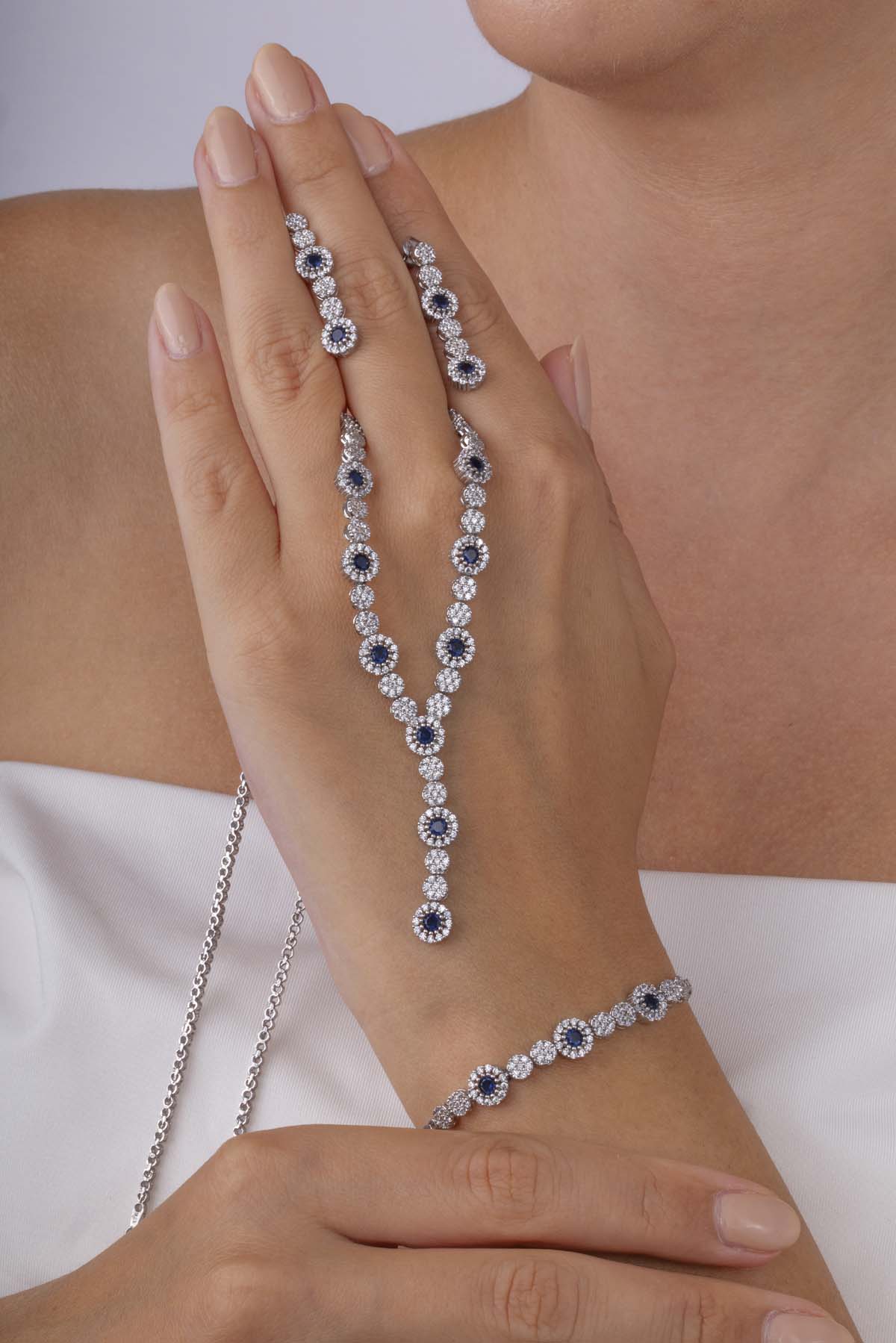 925 ayar gümüşten üretilen bu göz alıcı set, safir tonlarında taşlarla bezenmiş kolye, küpe ve bileklikten oluşuyor. Su yolu formunda dizilen taşlar, ışığı eşit şekilde yansıtarak her parçada kusursuz bir ışıltı sağlar. Derin mavi tonların verdiği asalet, zirkon taşların parlaklığıyla birleşerek etkileyici bir uyum yakalar.