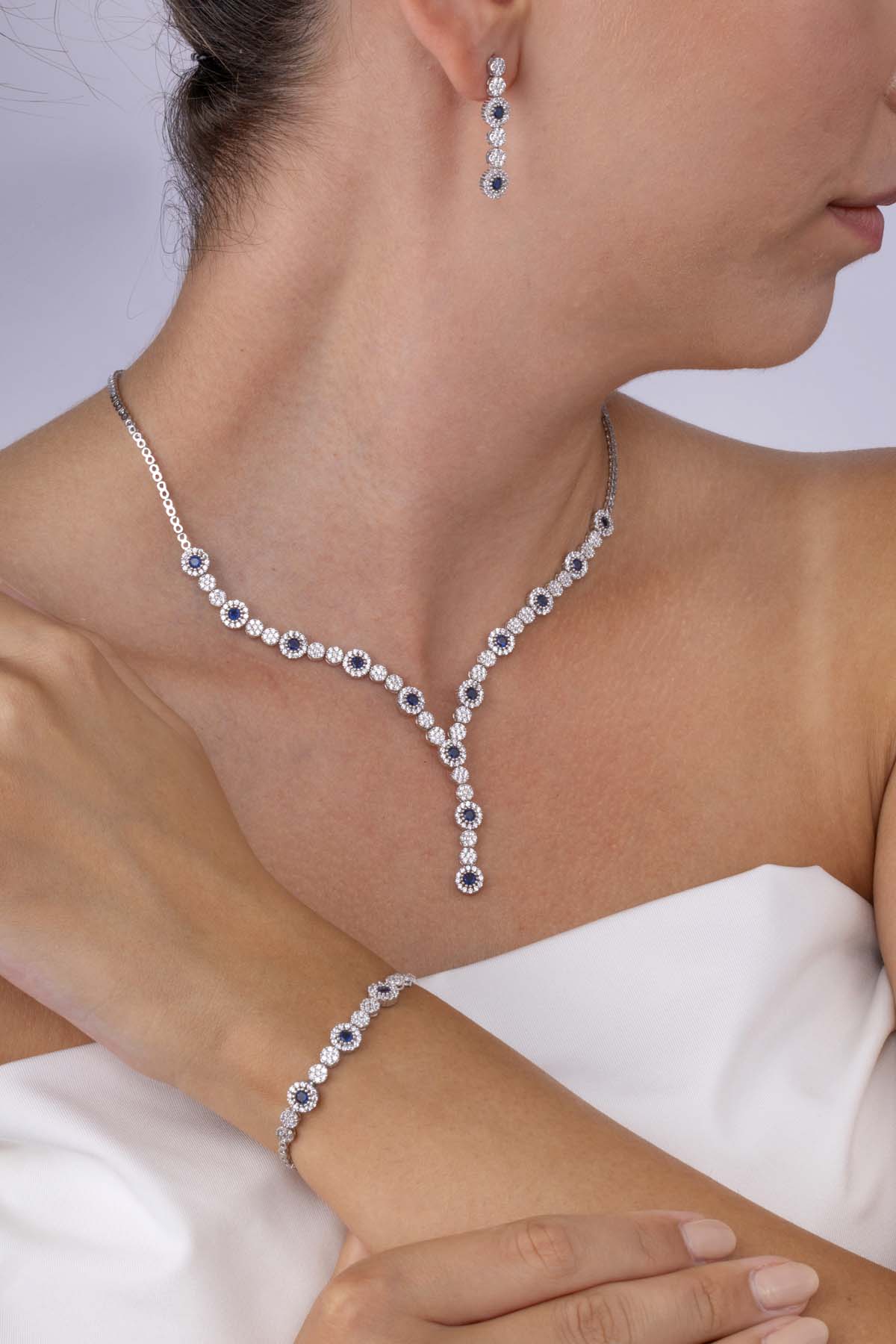 Safir Taşlı Rodyum Kaplama Gümüş Düğün Seti, kolye, yüzük ve bileklikten oluşan bu set, şık ve gösterişli bir stil sunar. Özel günler, düğün, nişan, davetler ve organizasyonlarda kullanabileceğiniz eşsiz bir modeldir.