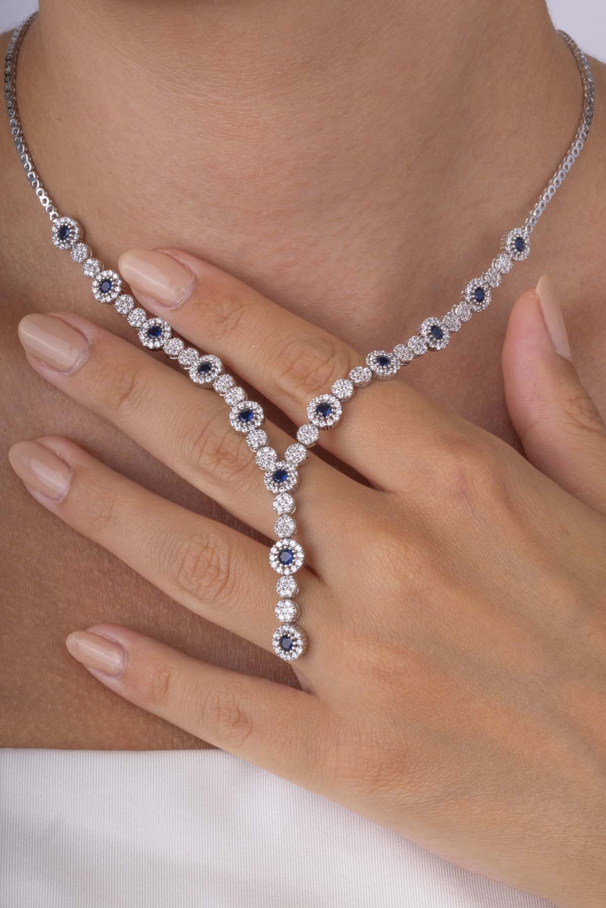 Mavinin zarif ışıltısı… Safir taşlı su yolu kolye, özel günlerinize unutulmaz bir şıklık katar.