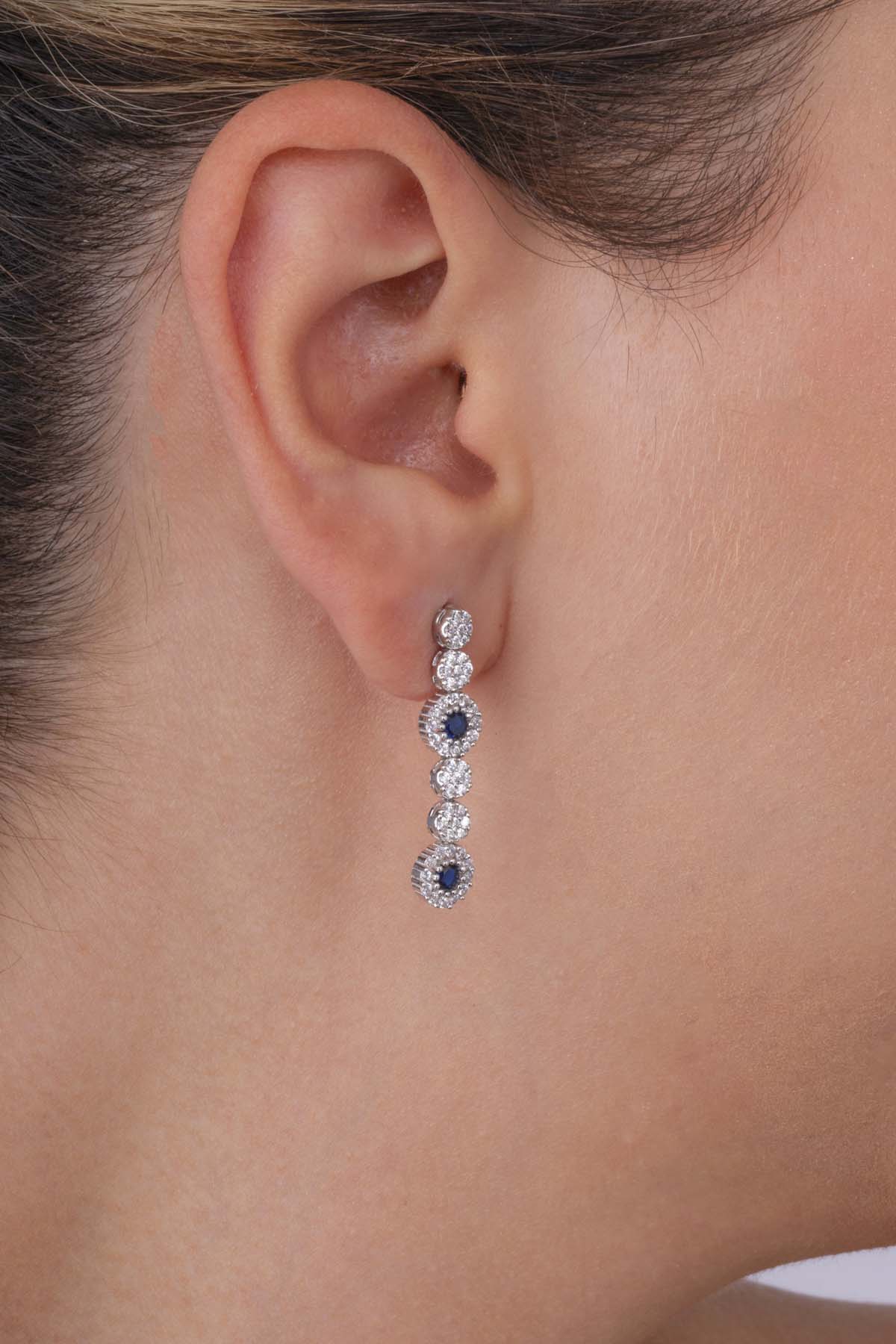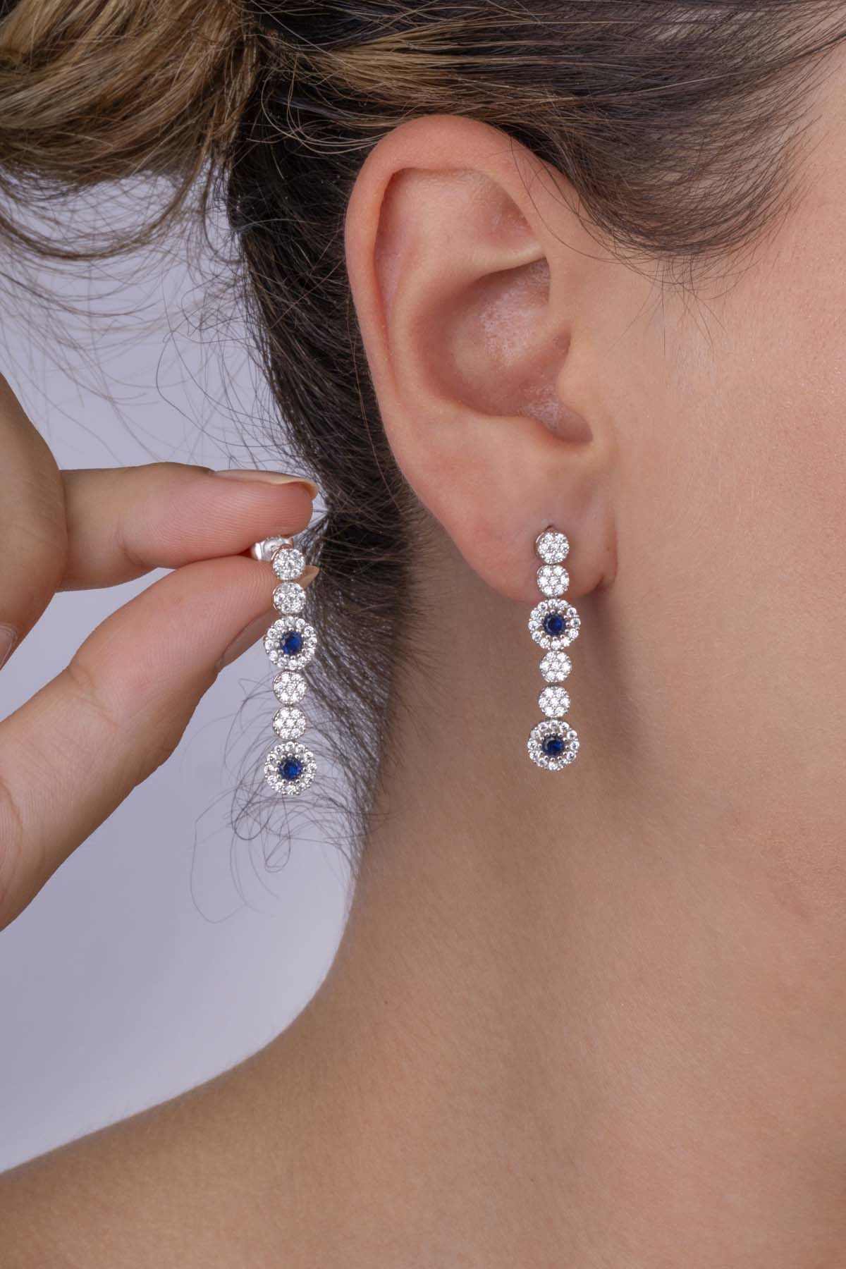 12 Ay'a Varan Taksit Seçeneği925 ayar gümüşten üretilen bu şık küpe, safir tonlarındaki taşların etrafını çevreleyen parlak zirkonlarla göz kamaştırıcı bir ışıltı sunuyor. Su yolu formunda dizilen taşlar, kulakta zarif bir akış efekti yaratırken modern ve klasik stilin uyumunu yansıtıyor.