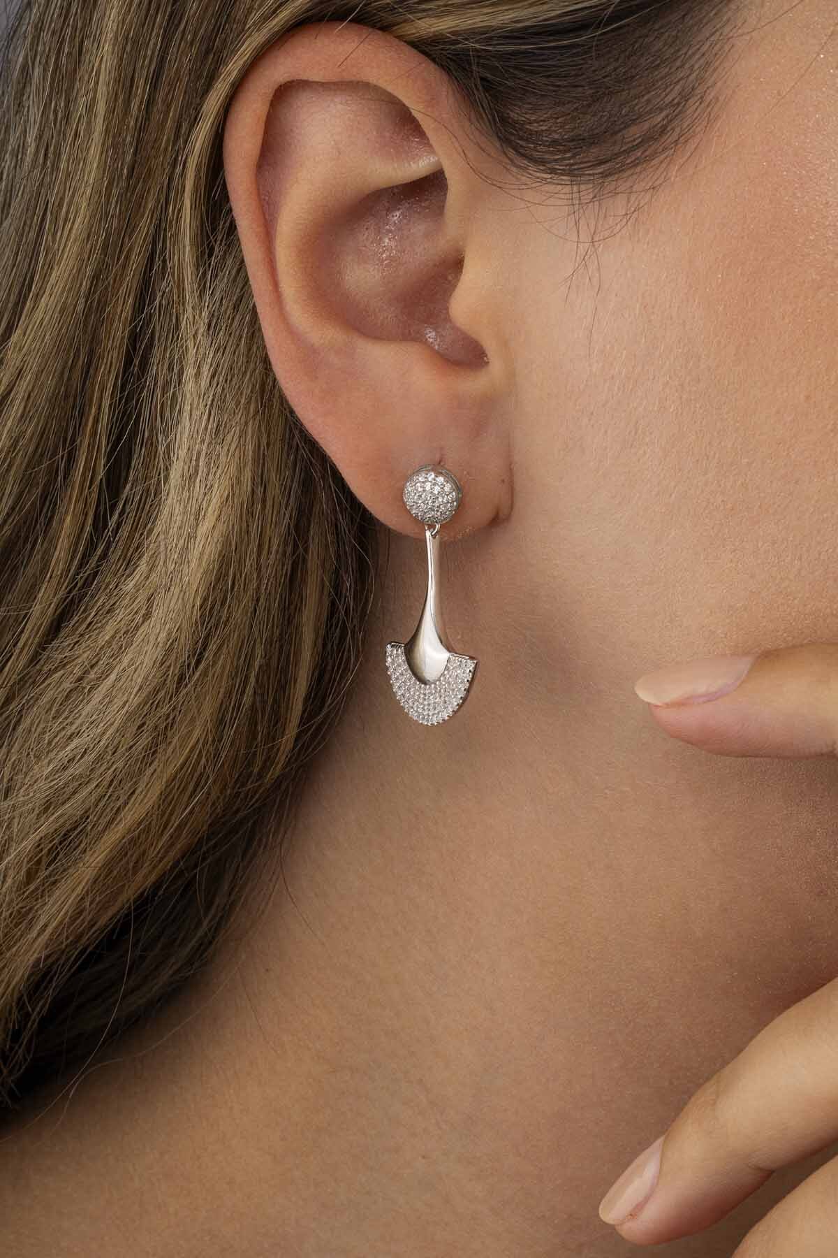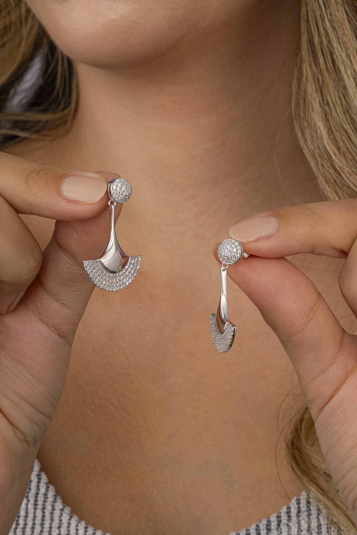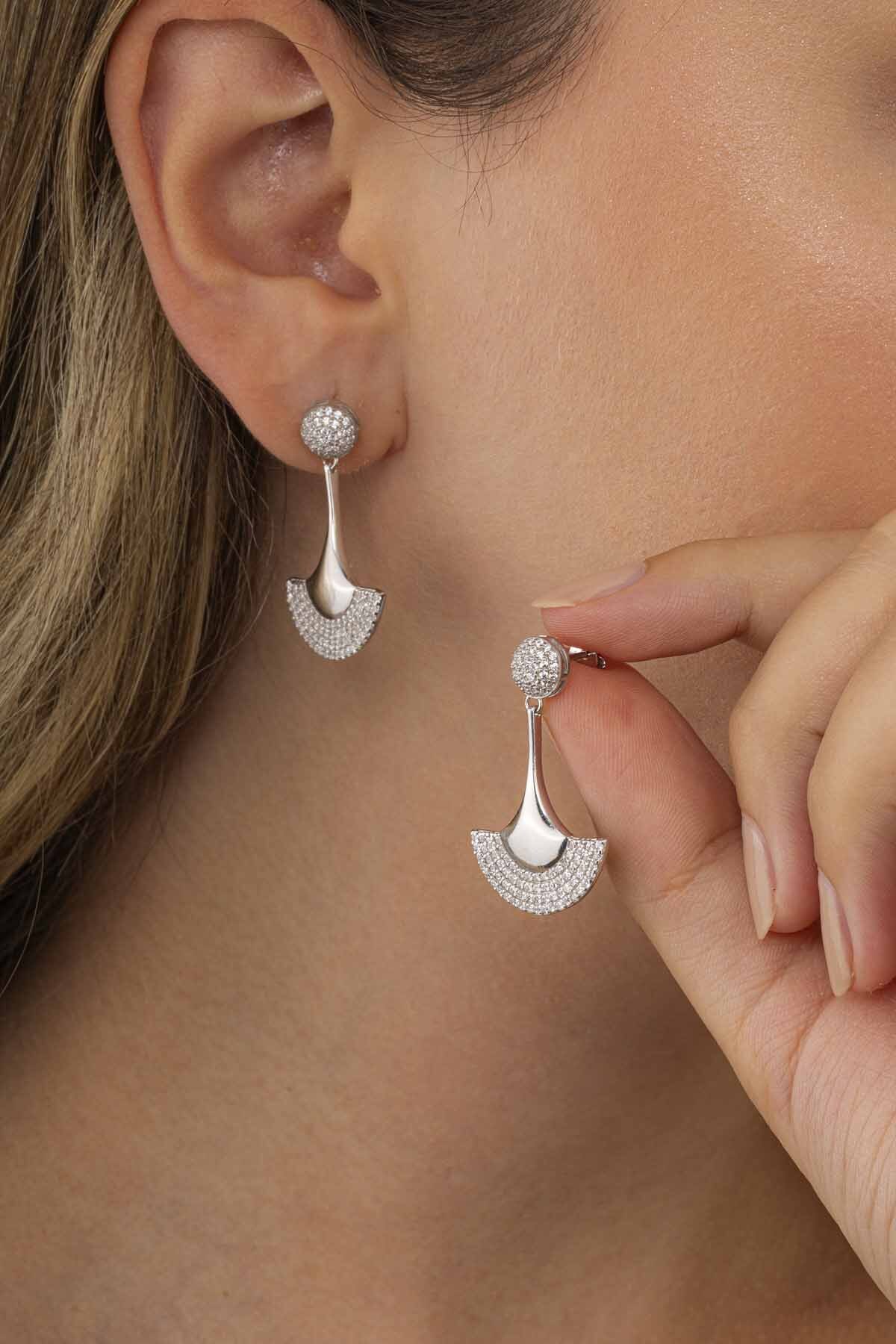 Yuvarlak taşlı üst bölüm ile sarkaç formundaki alt detayların birleşimi, küpeye estetik bir denge katar. Beyaz taşların zarif dizilimi, her ortamda şık ve sofistike bir görünüm sağlar. Günlük kombinlerden özel davetlere kadar geniş bir kullanım alanı sunarak kadınların tarzına ayrıcalık katar.