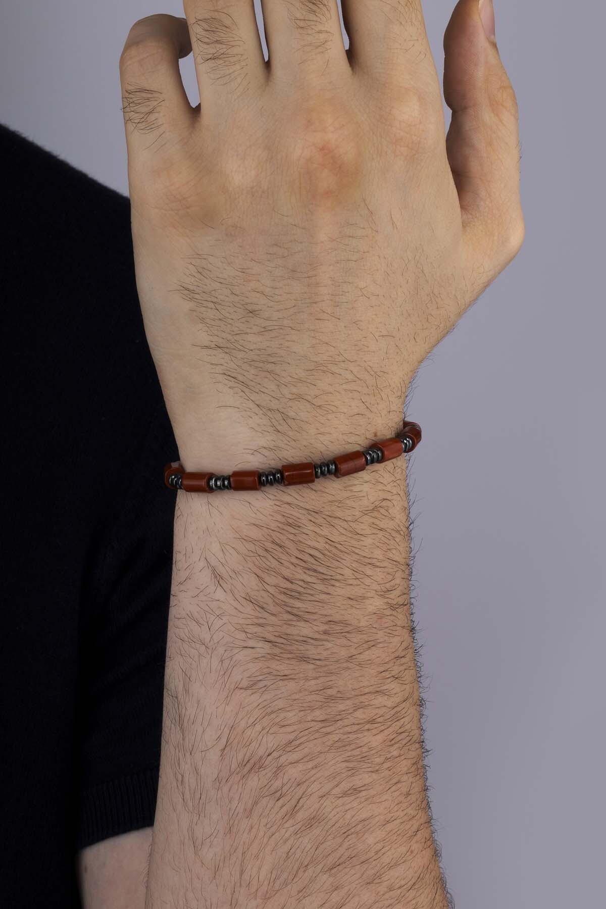 Silindir Kesim Akik Hematit Taşlı Doğal Taş Erkek Bileklik - 1