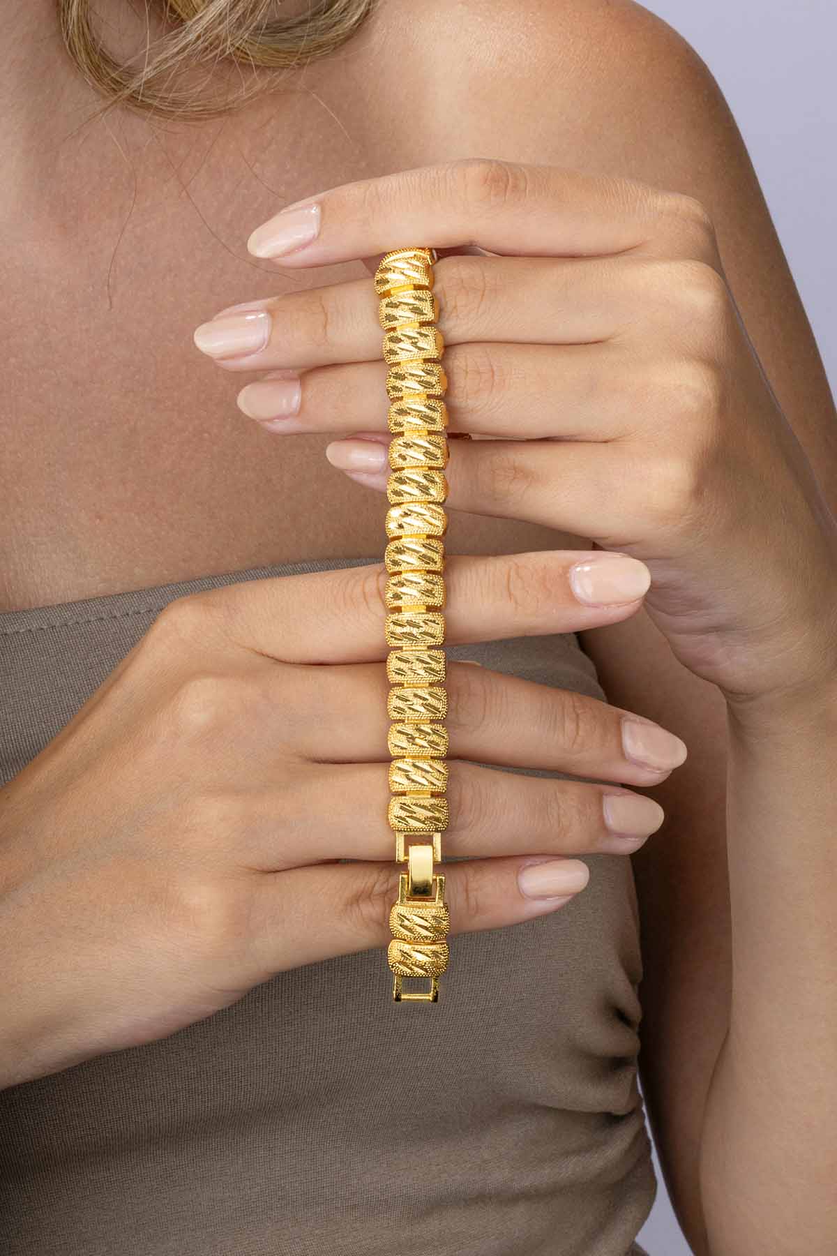 Sıralı dikdörtgen kesim altın kaplama çelik kadın bileklik, gösterişli tasarımı ve zarif detaylarıyla öne çıkan özel bir takıdır. Her bir parçanın özenle işlenmiş yüzeyi, altın kaplamanın parlaklığıyla birleşerek göz kamaştırıcı bir görünüm yaratır. İddialı formu sayesinde bilekte güçlü ve şık bir duruş sergiler.