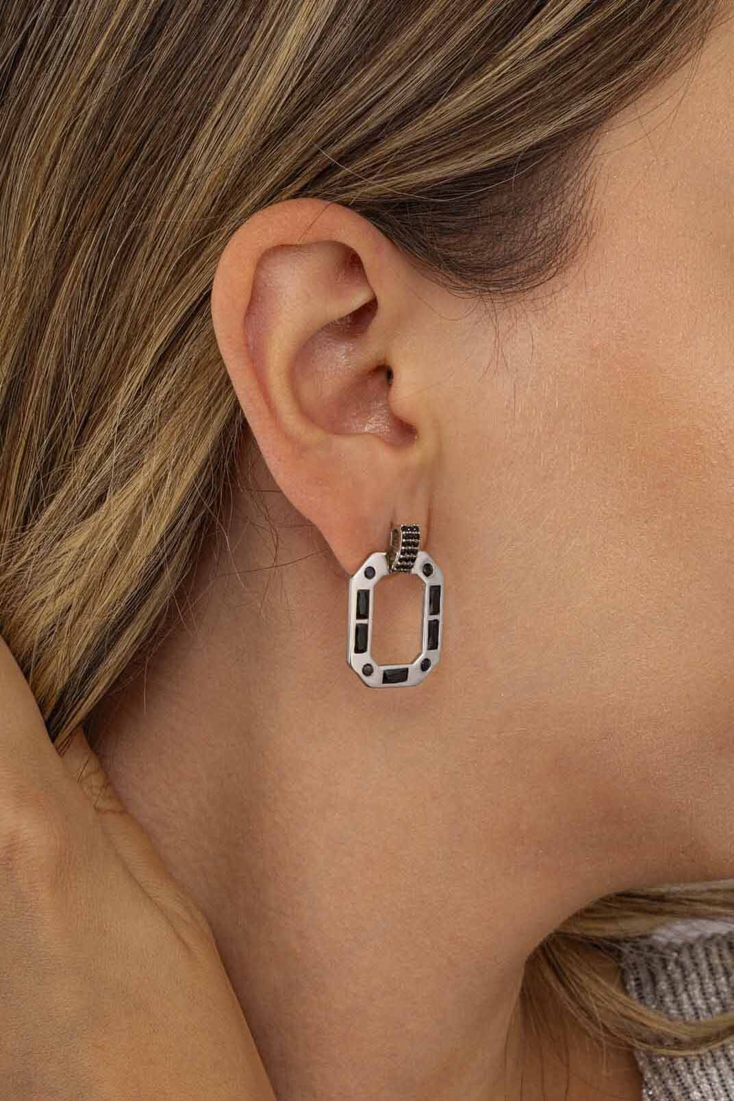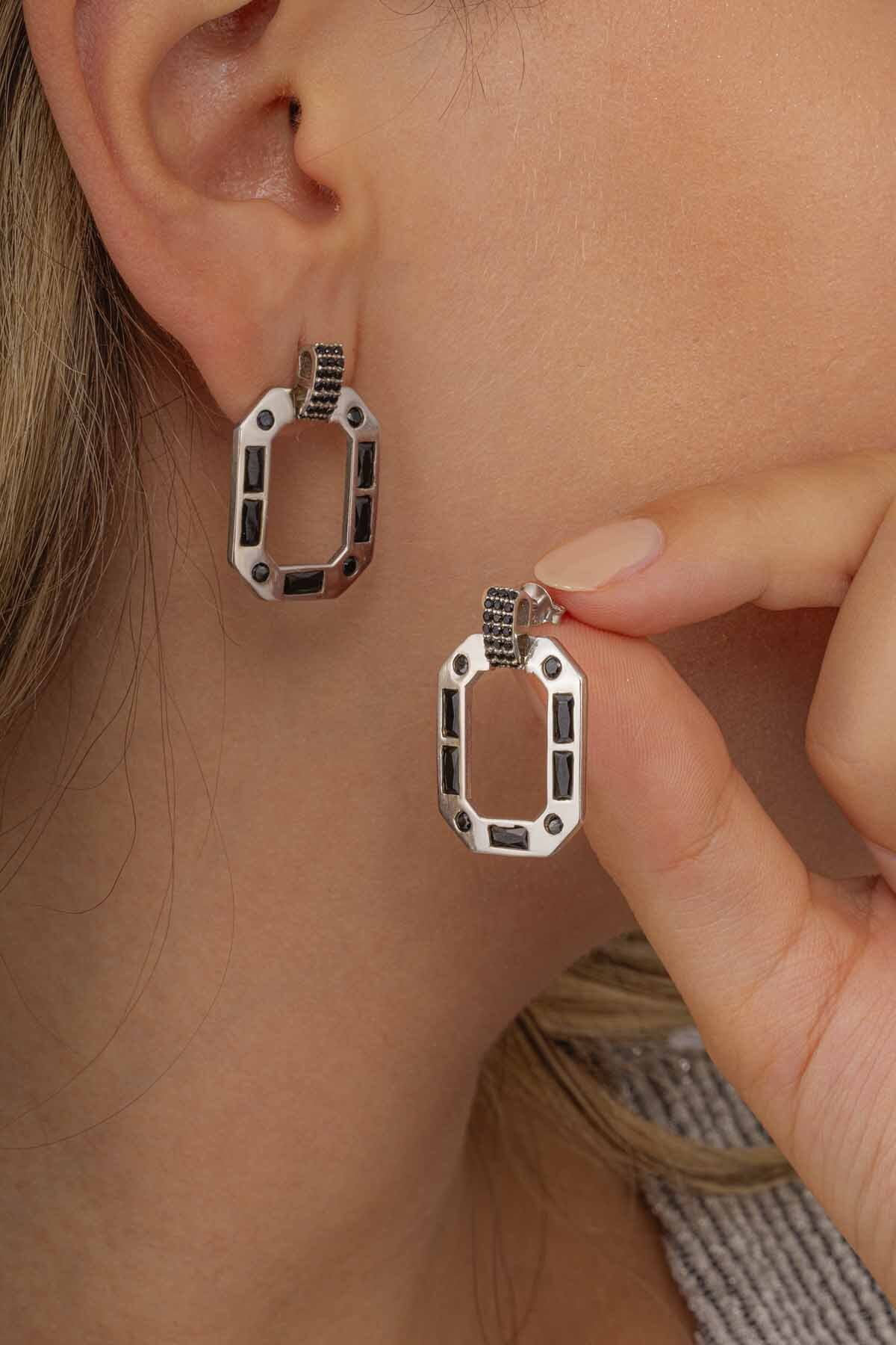 Siyah Taşlı Dikdörtgen Kesim 925 Ayar Gümüş Küpe