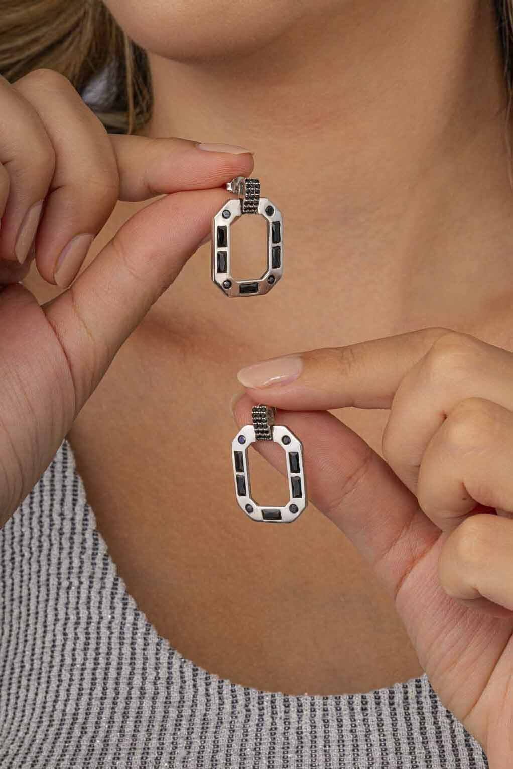 Minimalist tasarımıyla öne çıkan bu gümüş küpe, siyah taşların asil duruşunu geometrik hatlarla bir araya getirir. Işığı yansıtan taş detayları, küpenin karakterini ön plana çıkarırken, modern ve zamansız bir aksesuar olmasını sağlar. Ofis kombinlerinden gece davetlerine kadar geniş bir kullanım alanı sunar.