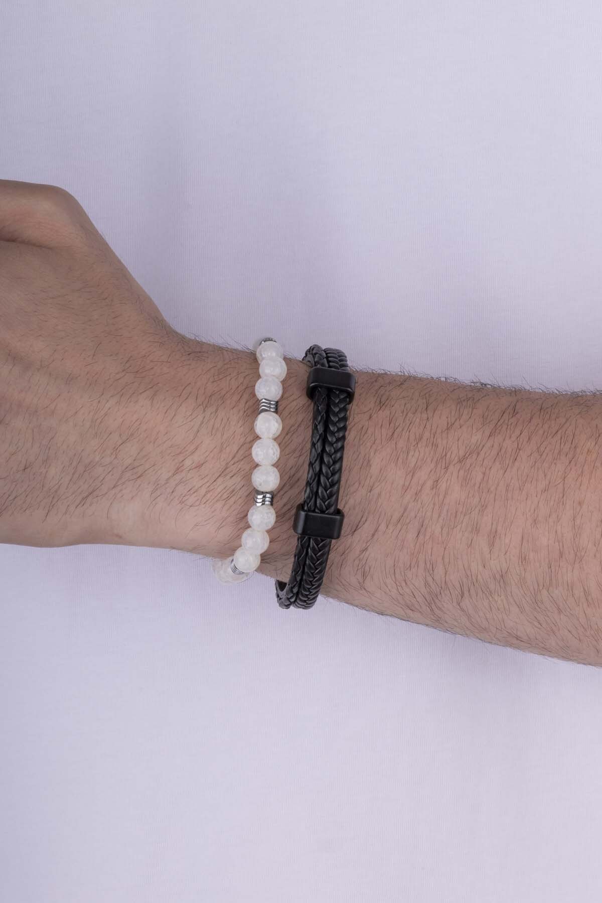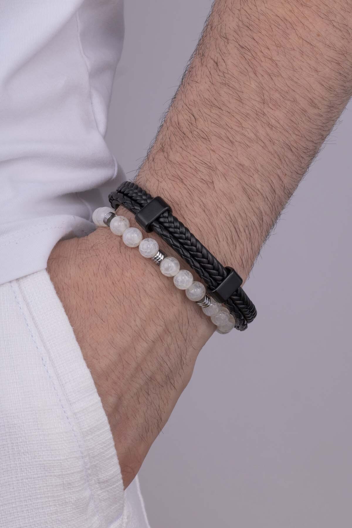 Gelince Haber VerDoğal taşın saf enerjisini ve derinin maskülen şıklığını buluşturan bu özel kombin, modern erkek stilini güçlendiriyor. Tibet akik taşının huzur veren etkisi ile siyah örgü deri bilekliğin karizmatik duruşu birleşerek güçlü bir bütünlük sunuyor.