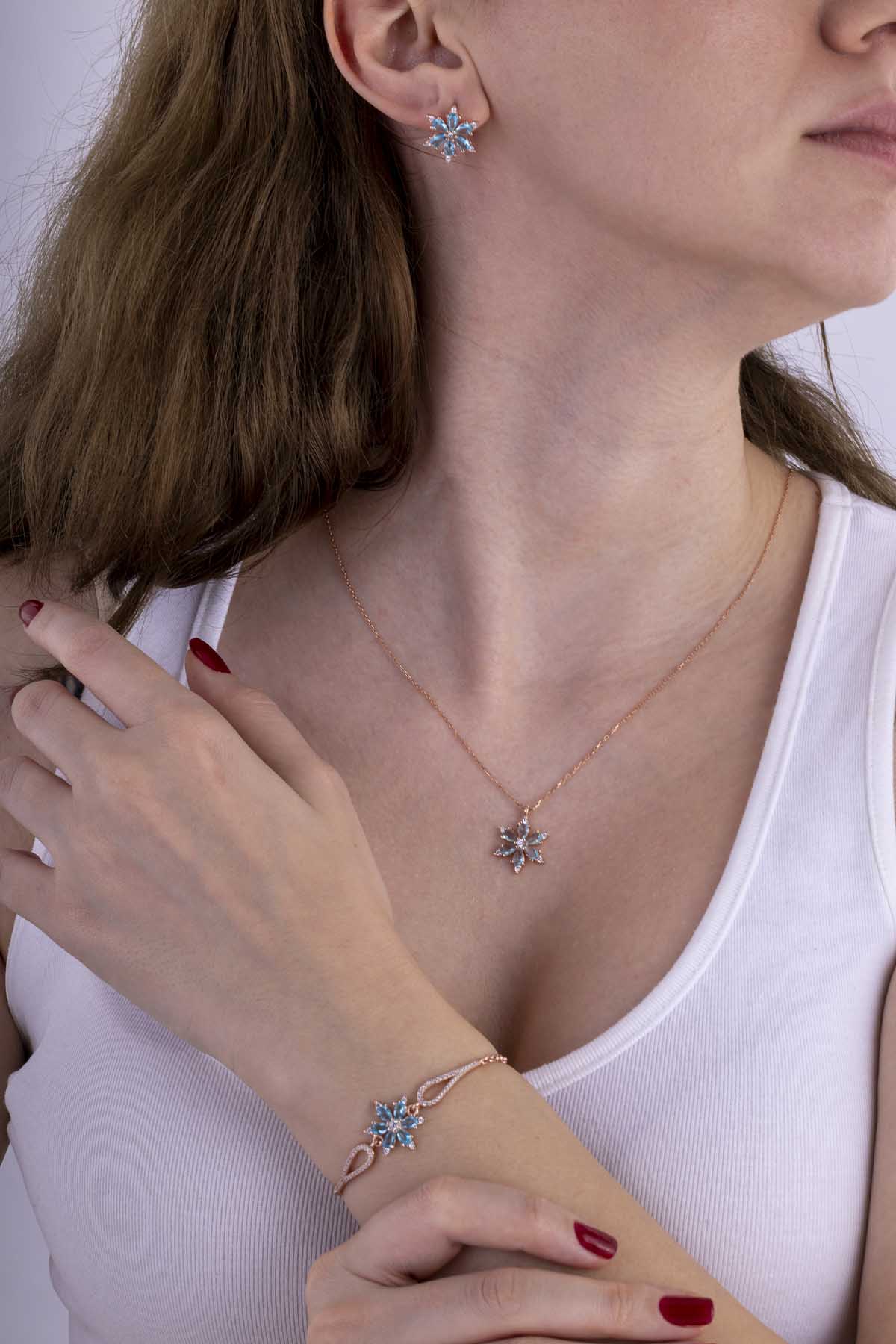 Çiçek motiflerinden oluşan bu set, kolye, küpe ve bileklik bütünlük sağlar. Özel günlerinizde doğanın zarafetini üzerinizde taşıyın.