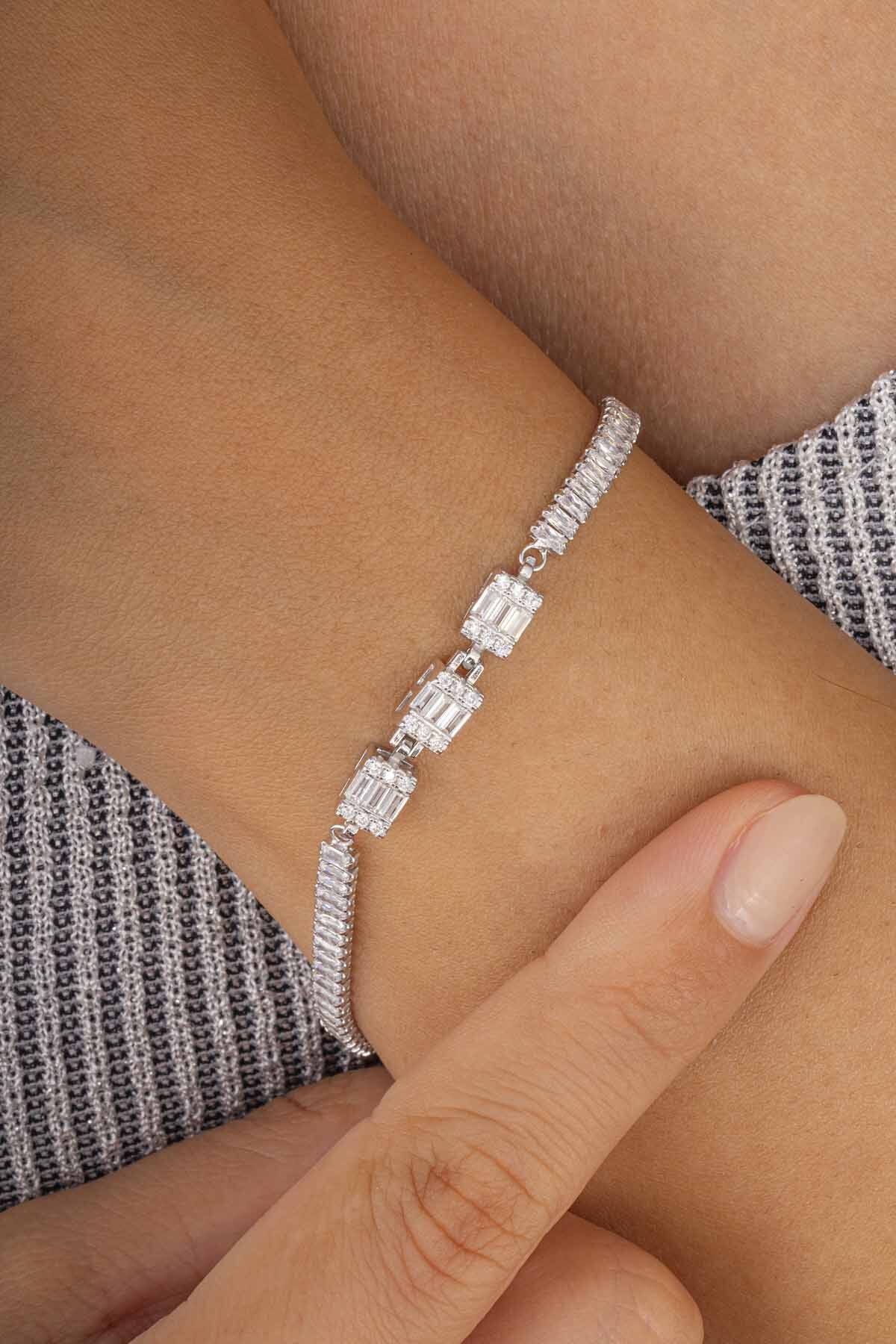 Tam tur dizilmiş parlak taşları sayesinde bilekte ışığı en iyi şekilde yansıtan bu model, kadınların takı koleksiyonunda zamansız bir parça olarak yerini alır. Baget taşların modern çizgileriyle birleşen klasik tasarım anlayışı, hem genç hem de olgun stillere rahatlıkla uyum sağlar. İnce işçilik ve kaliteli detaylarıyla dikkat çeken bu bileklik, modayı takip eden kadınların beğenisini kazanır.