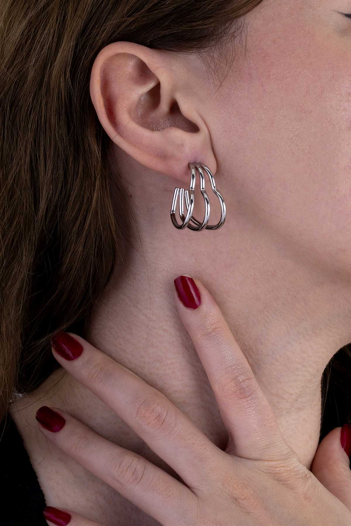 Üçlü kalp formunda tasarlanan beyaz altın kaplama çelik kadın küpe; modern, zarif ve dikkat çekici bir görünüm sunan şık bir aksesuardır.