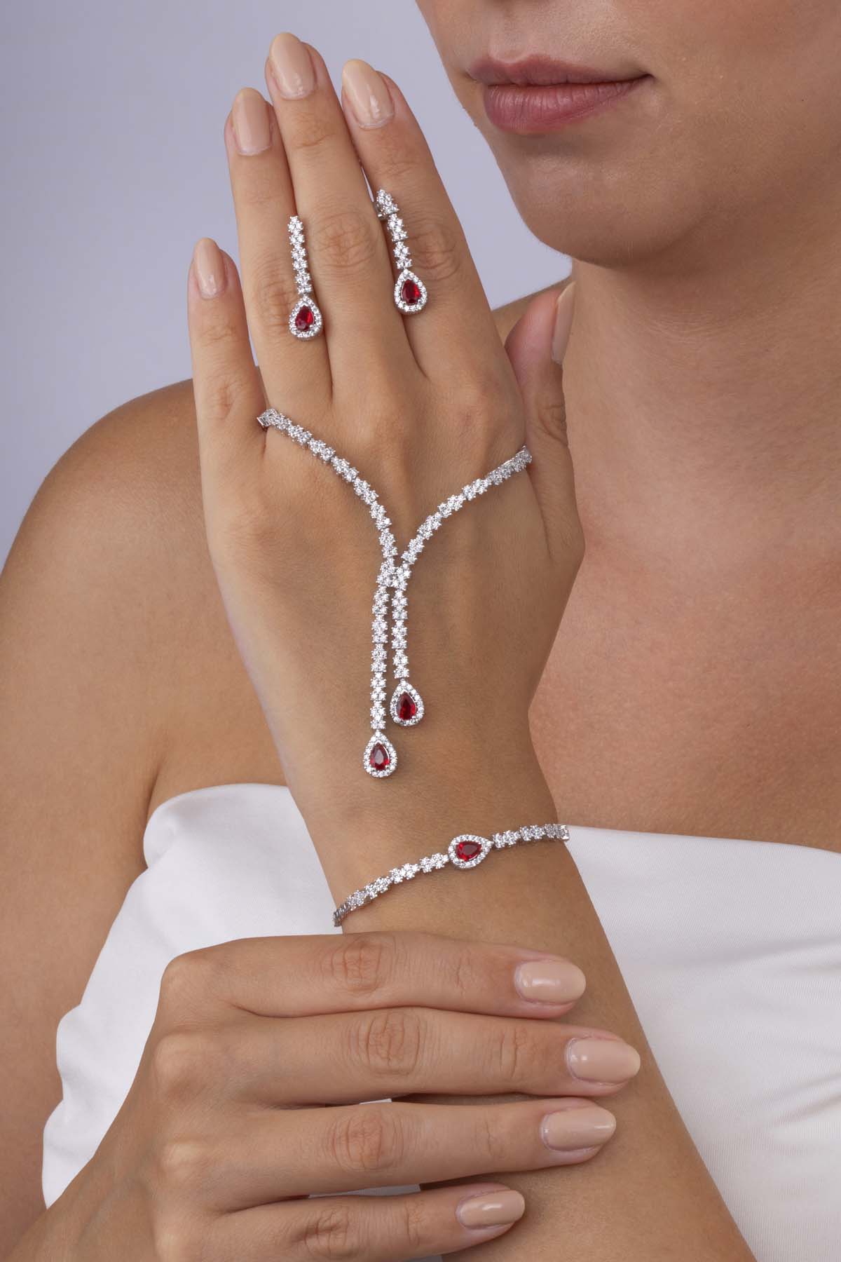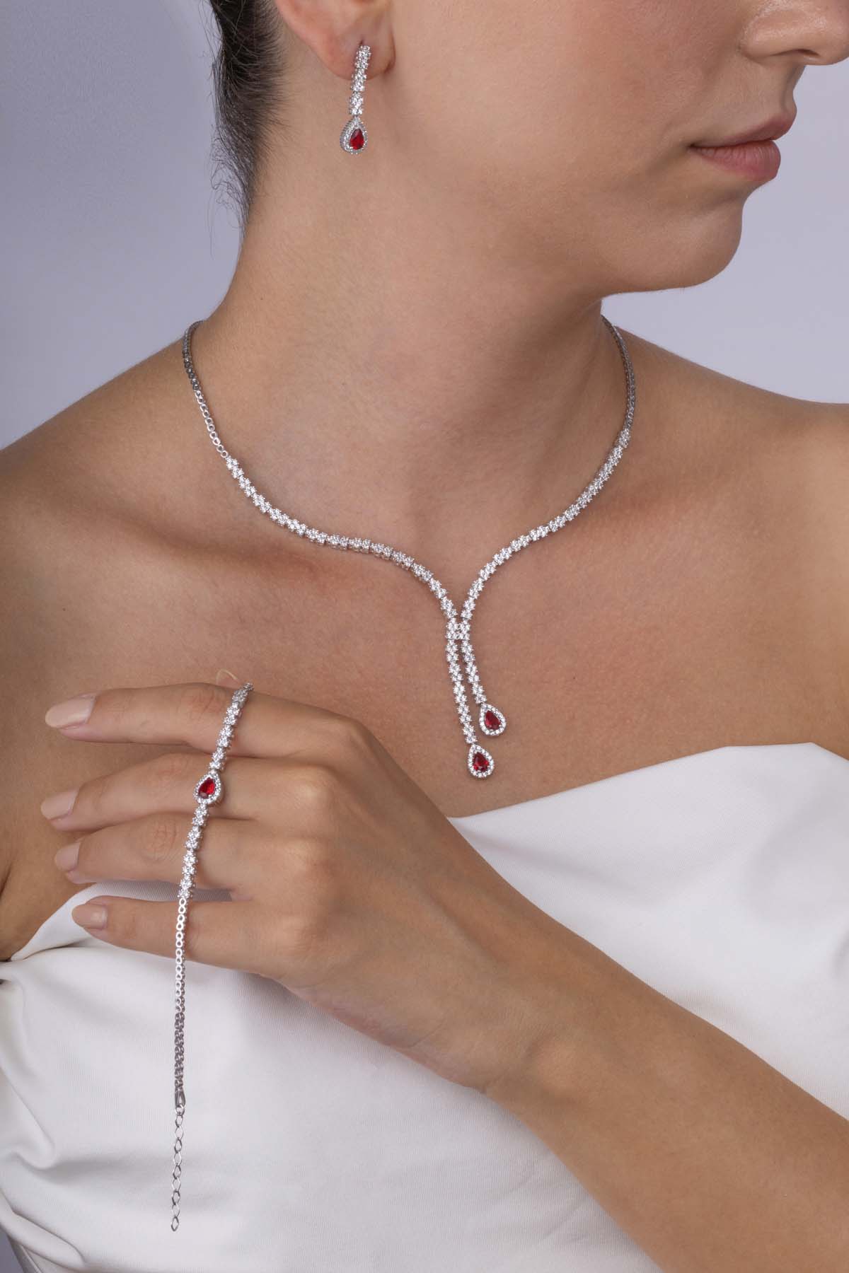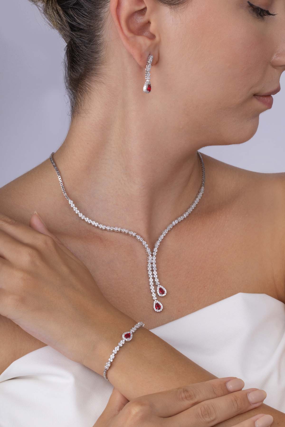 Yakut Taşlı Damla Motifli Rodyum Kaplama Gümüş Düğün Seti, kolye, küpe ve bileklikten oluşan bu set, şık ve gösterişli bir stil sunar. Özel günler, düğün, nişan, davetler ve organizasyonlarda kullanabileceğiniz eşsiz bir modeldir.