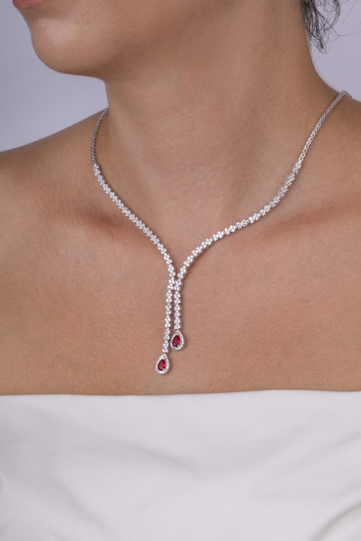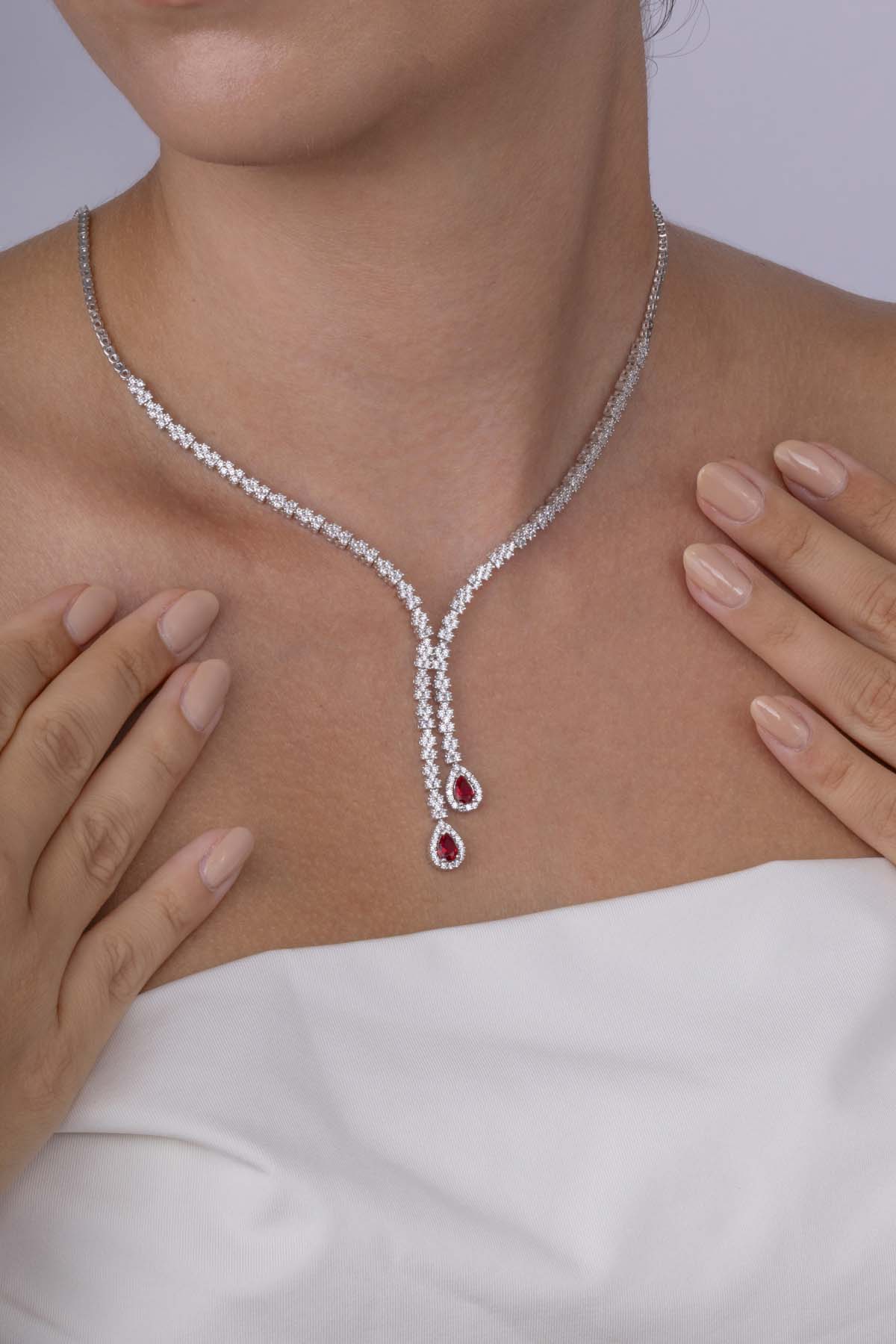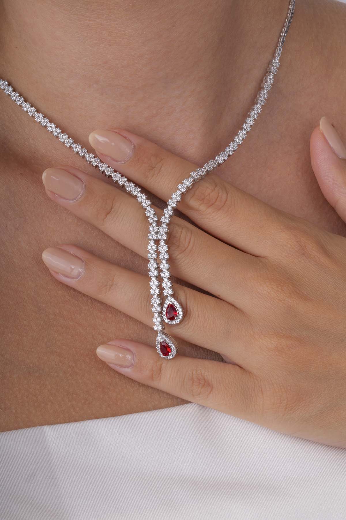 Zarif ve özgün formuyla bu kolye, düğün, nişan, davet ve balo gibi özel günlerde asil ve iddialı bir stil yaratmak isteyenler için ideal bir seçenektir. Kırmızı taşların çarpıcı tonu, zirkon taşların kusursuz parıltısıyla birleşerek göz alıcı bir denge oluşturur.