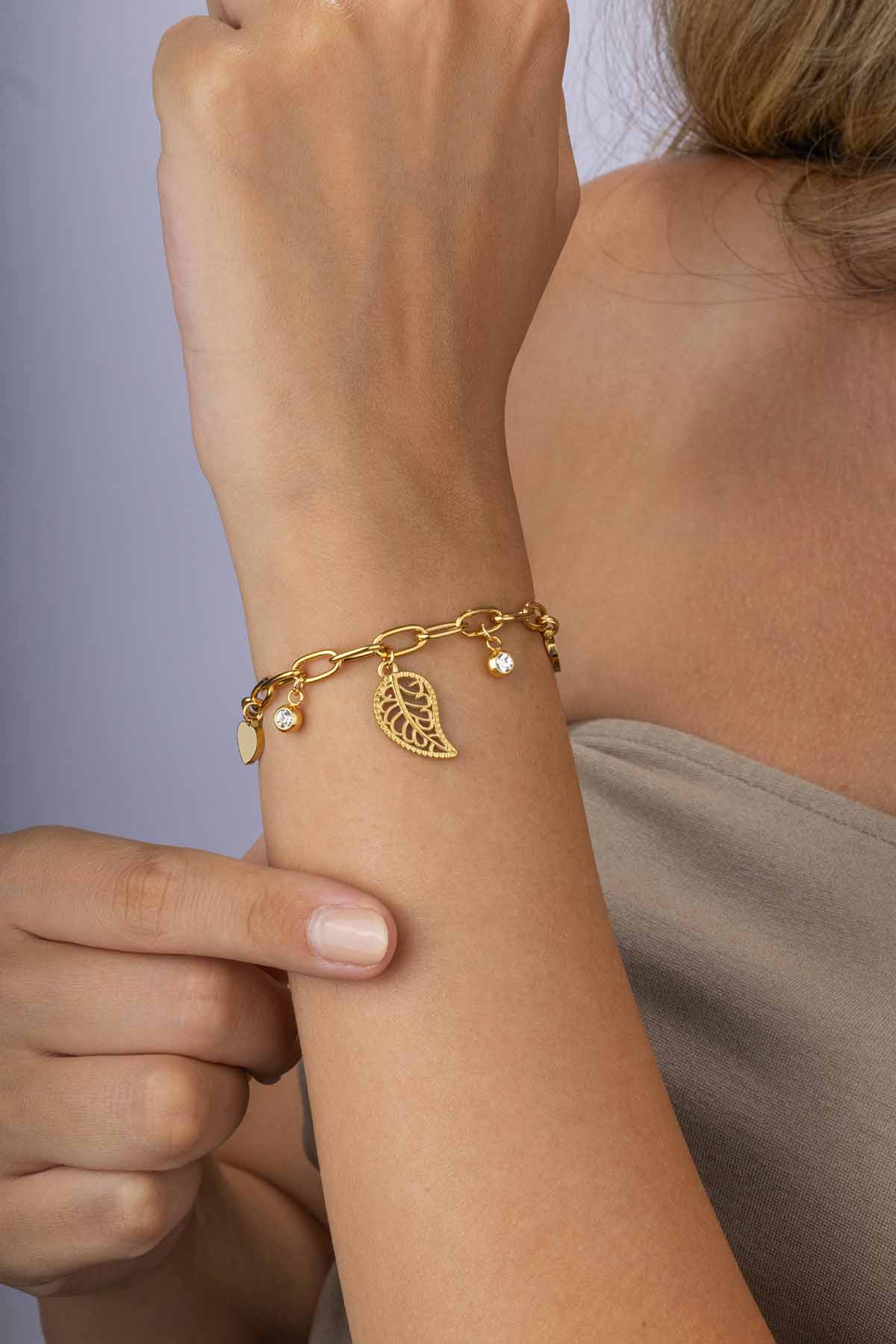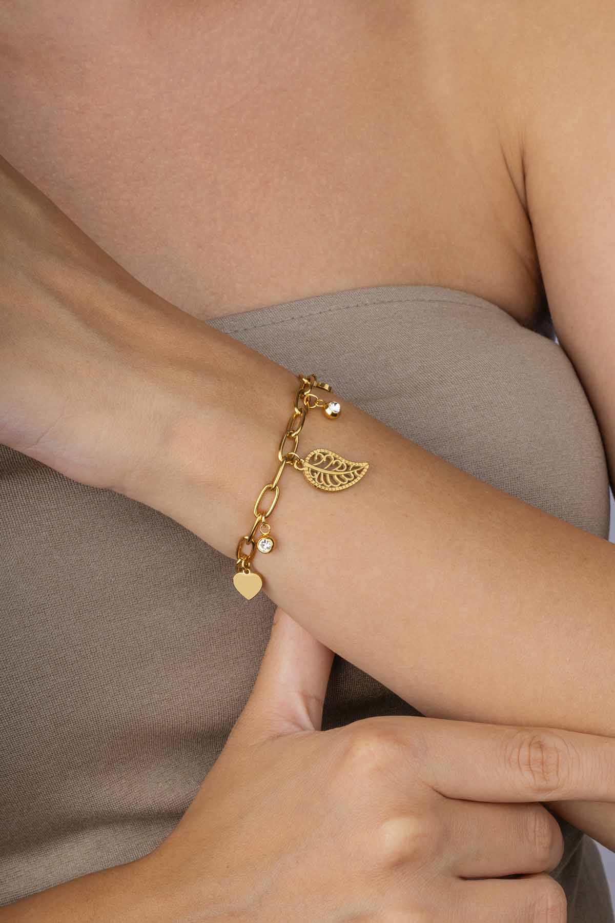 “Yaprak ve kalp figürleriyle tasarlanmış altın kaplama çelik kadın bileklik, kararma yapmayan dayanıklı yapısıyla hem günlük hem de özel gün kombinlerine şıklık katar.”