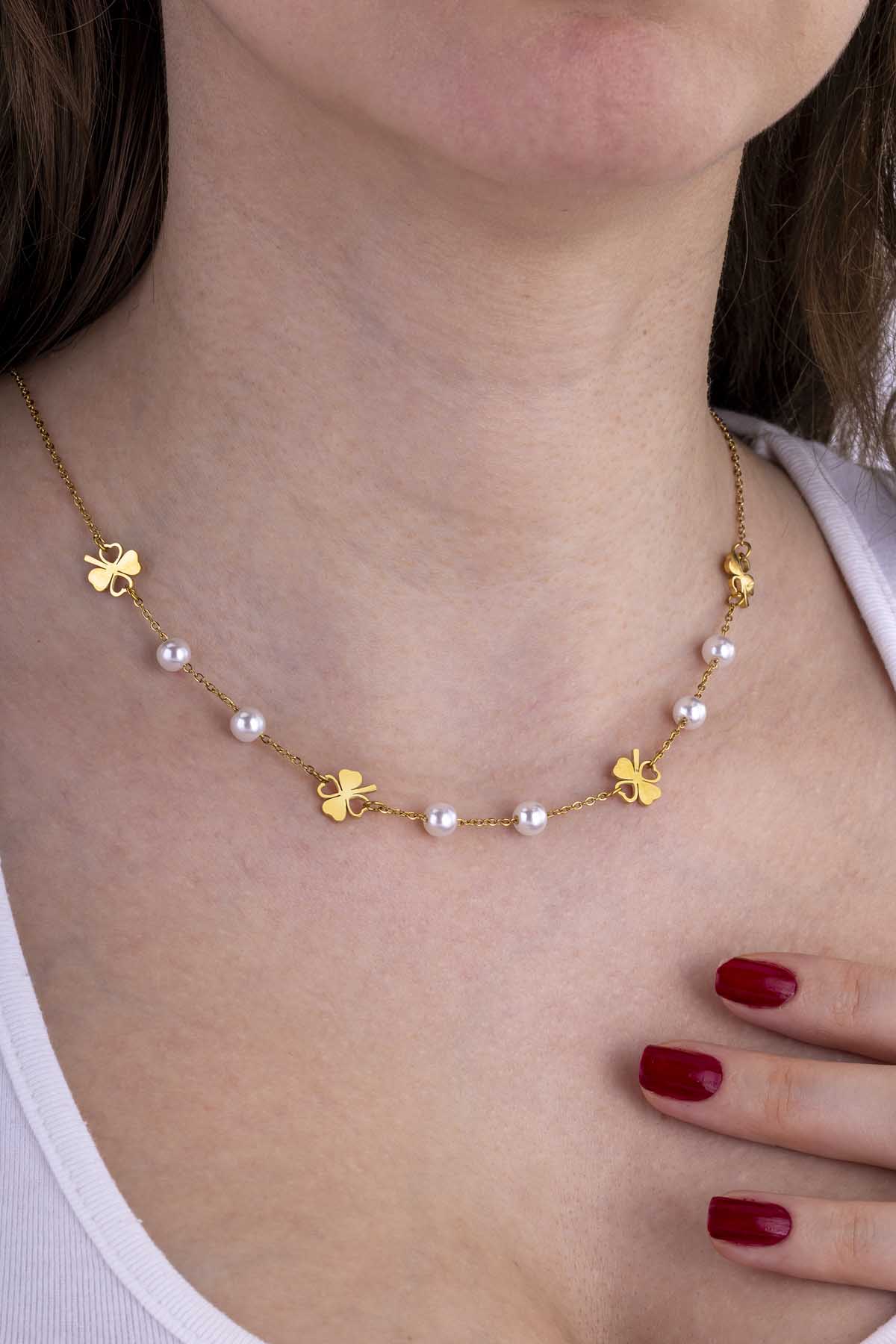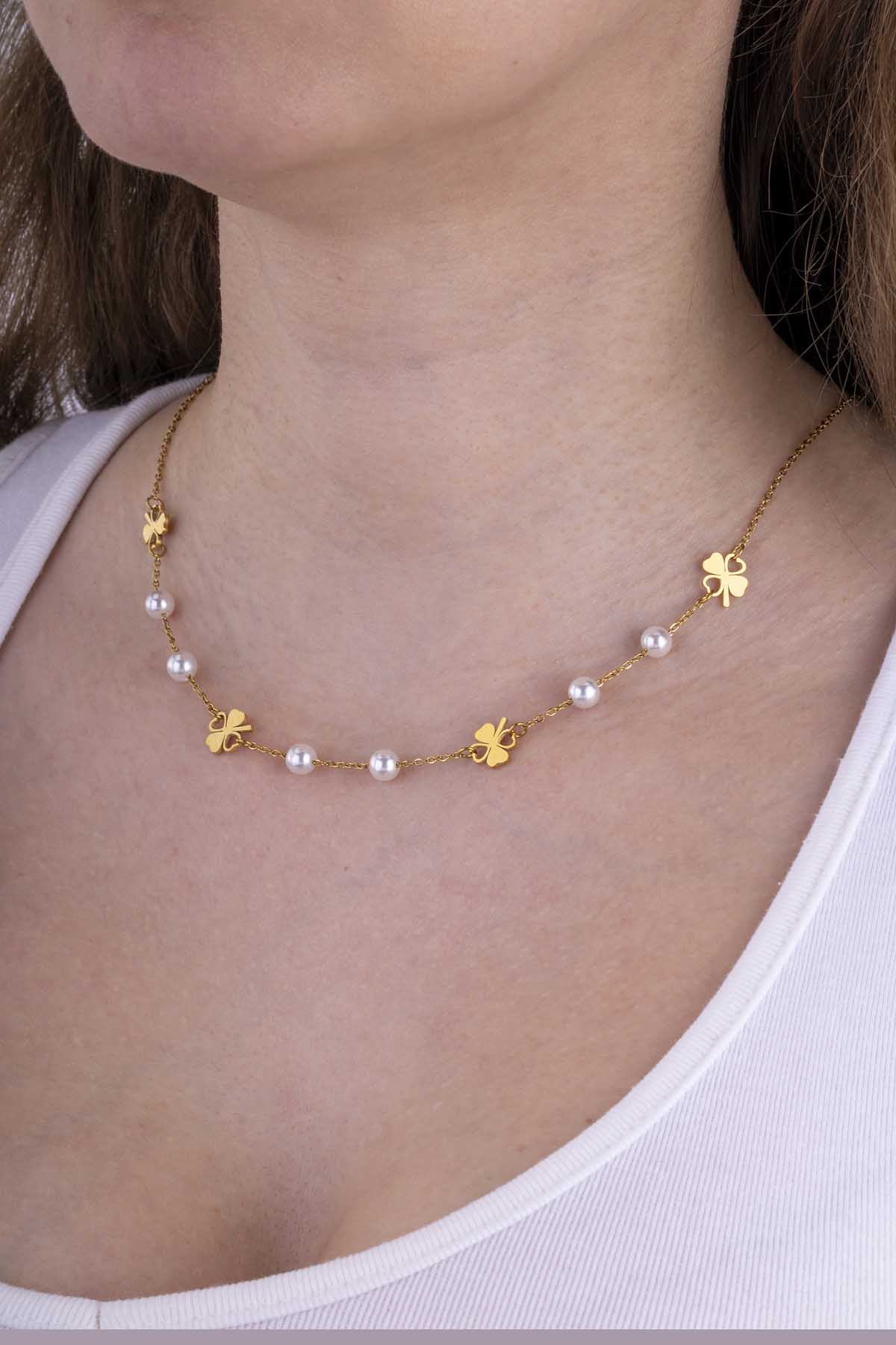 Yonca figürleri ve inci detaylarıyla tasarlanan altın kaplama çelik kadın kolye, zarif, modern ve şans sembolü taşıyan şık bir aksesuardır.