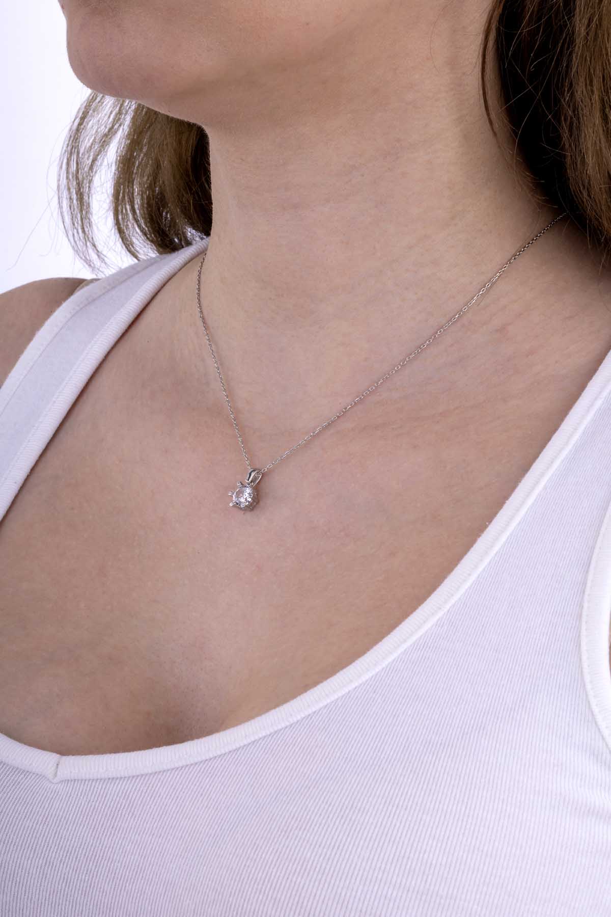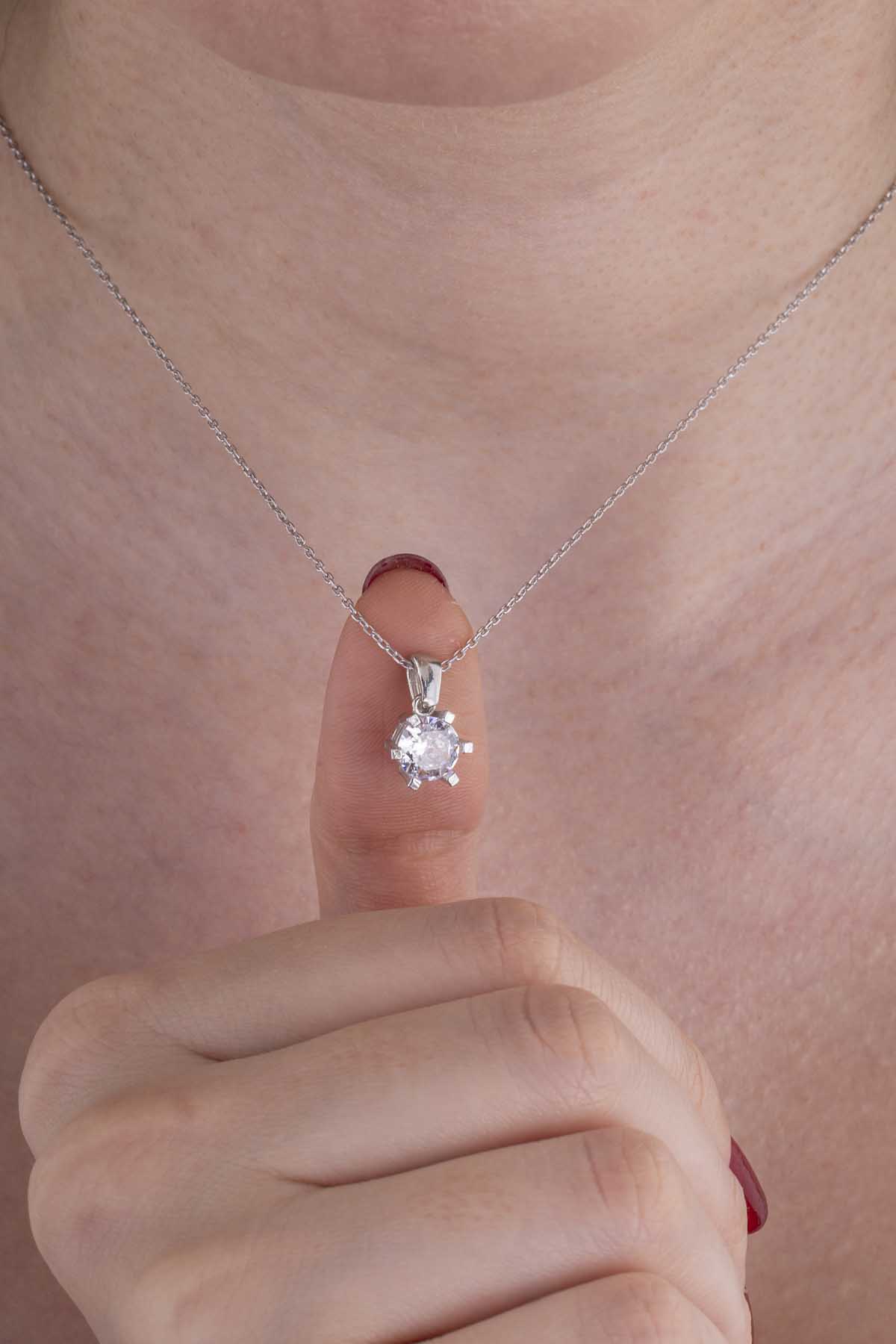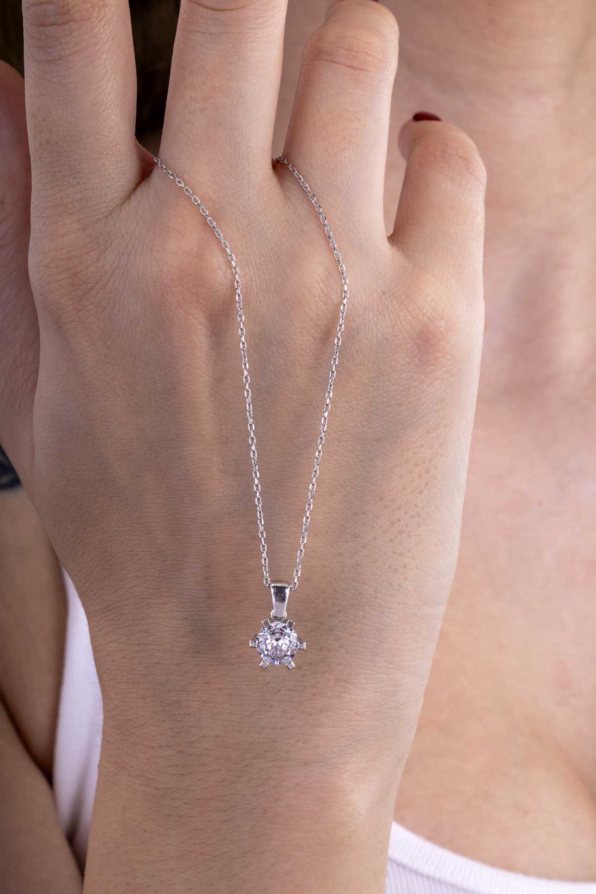 1.068,00 TLYuvarlak kesim pırlanta görünümündeki taşın 6 tırnaklı modern bir formda işlendiği bu gümüş kadın kolye, zarif, ışıltılı ve klasik şıklığı yansıtan özel bir aksesuardır.