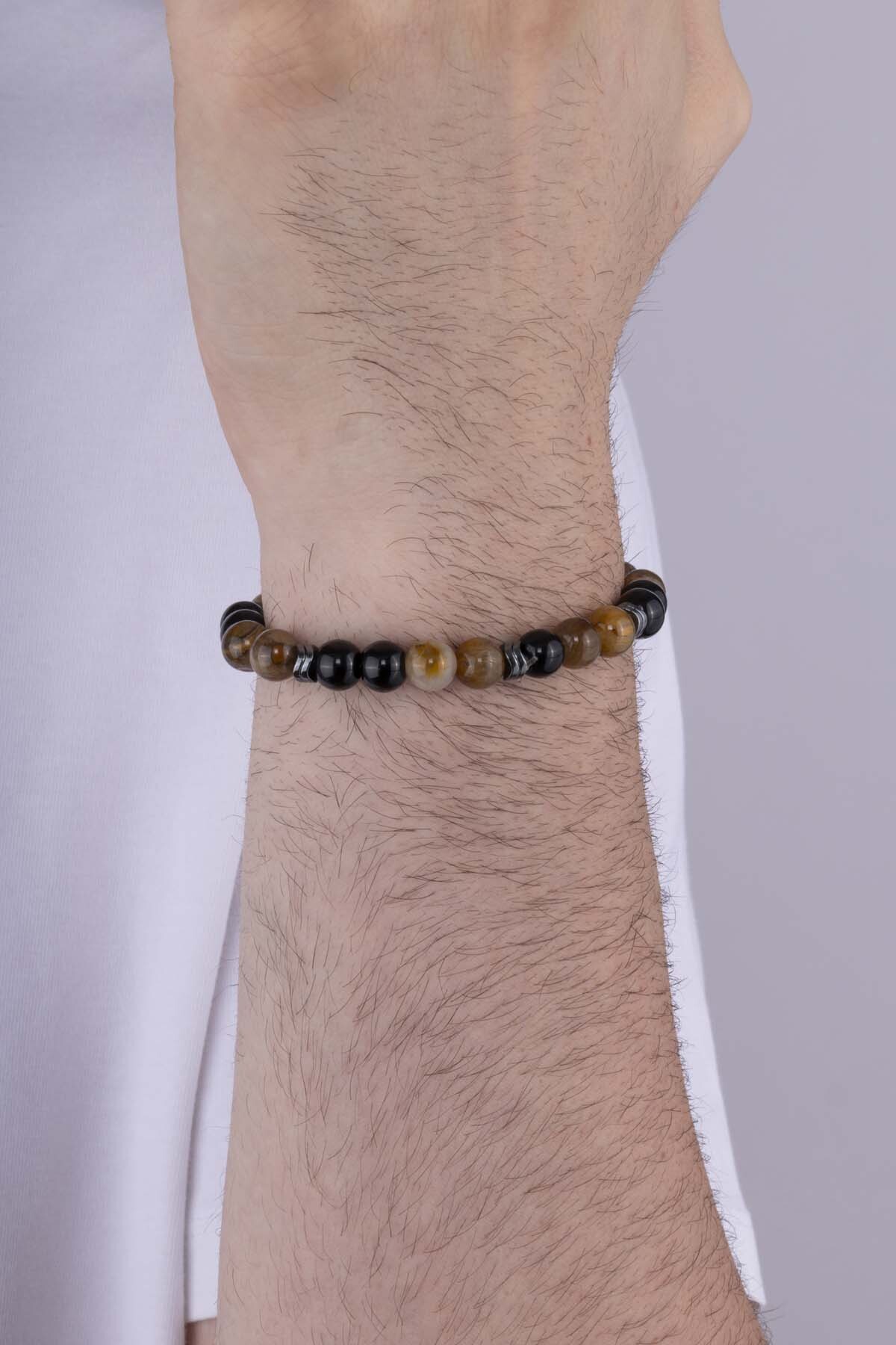 Damarlı akik taşının doğal dokusu ve enerjisi ile tasarlanan bu bileklik, erkek stiline güçlü bir karakter katıyor. Taşların doğal damar yapısı, bilekliğe her parçada benzersiz bir görünüm kazandırırken siyah ve kahverenginin tonlarıyla sofistike bir şıklık sunuyor.