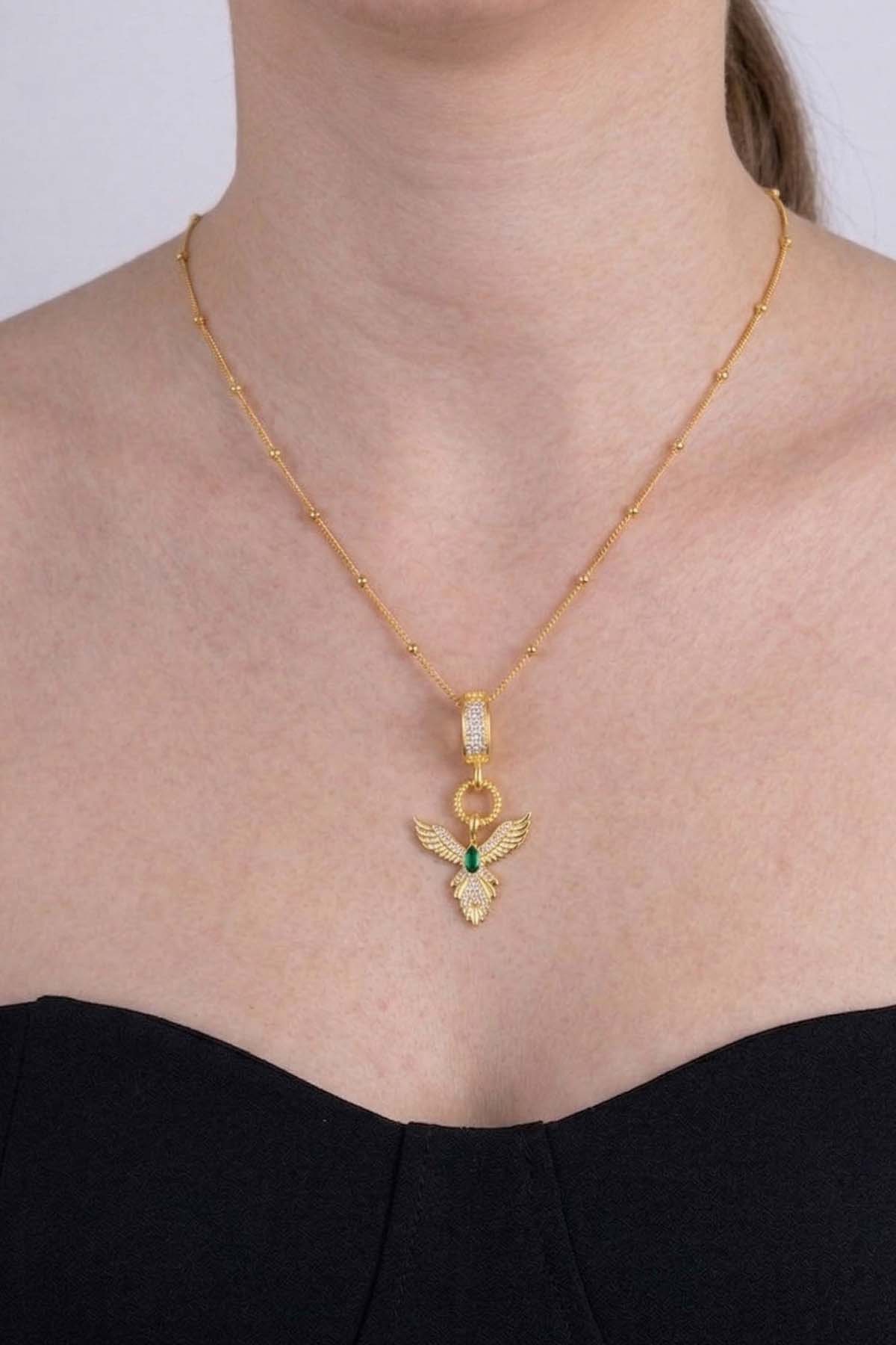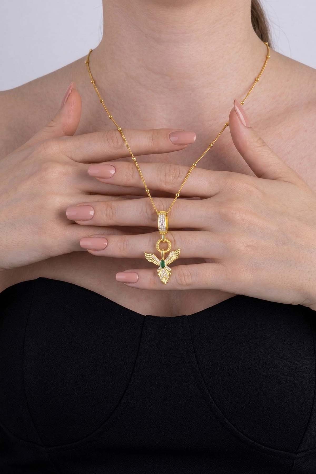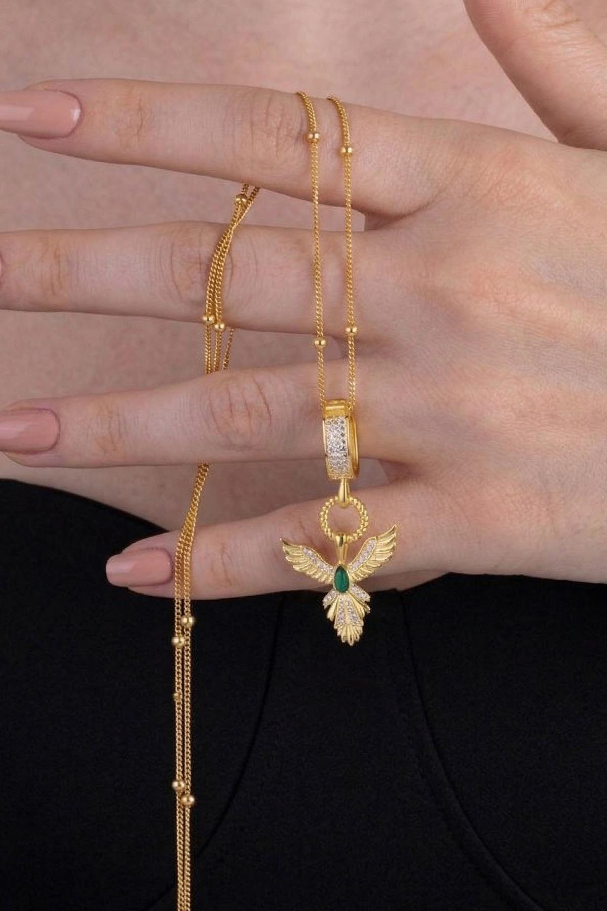 Yeniden doğuşun ve ölümsüzlüğün simgesi olan 925 ayar gümüş altın kaplama anka kuşu kolye, zarif tasarımıyla günlük şıklığınıza ilham verici bir anlam katıyor.