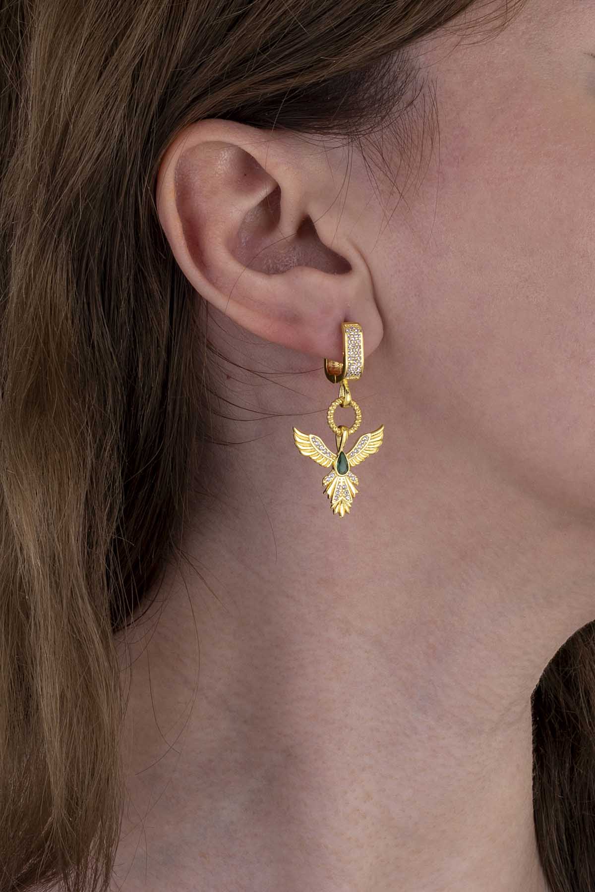 Gelince Haber Ver925 ayar gümüşten üretilen ve altın kaplama ile tamamlanan anka kuşu küpe, günlük kullanım için ideal bir şıklık sunar. Anka kuşu; yeniden doğuşu, umudu ve içsel gücü simgeler. Yeşil taş detayı ile zenginleştirilen bu özel tasarım, ışığı büyüleyici şekilde yansıtarak stilinize sofistike bir dokunuş katacak. Hem modern çizgileri hem de güçlü sembolizmi sayesinde, günlük kombinlerde kolayca kullanılabileceği gibi özel günlerde de dikkat çekici bir aksesuar olacaktır. Dayanıklı yapısı uzun süreli kullanım sağlarken, anlam yüklü tasarımıyla sevdiklerinize hediye edebileceğiniz değerli bir parçadır.