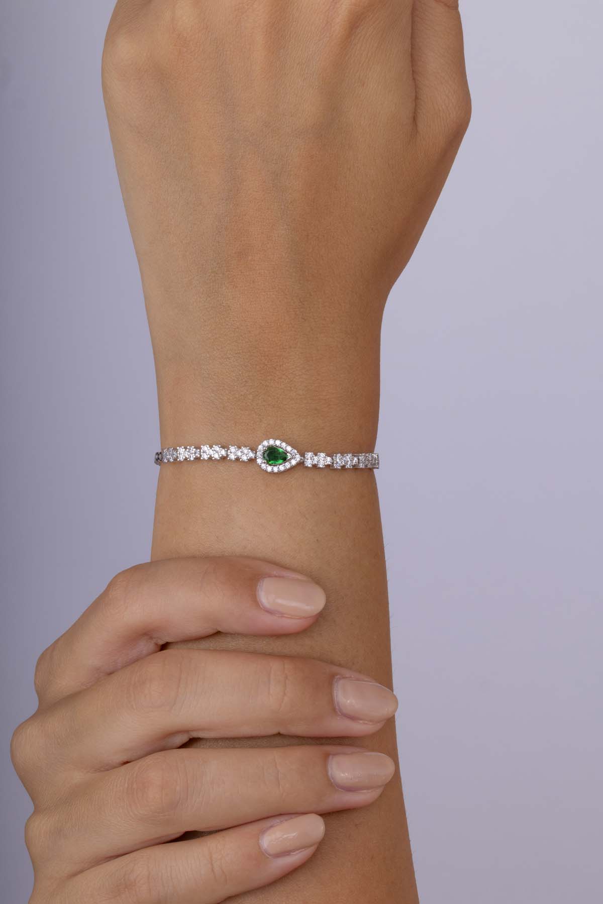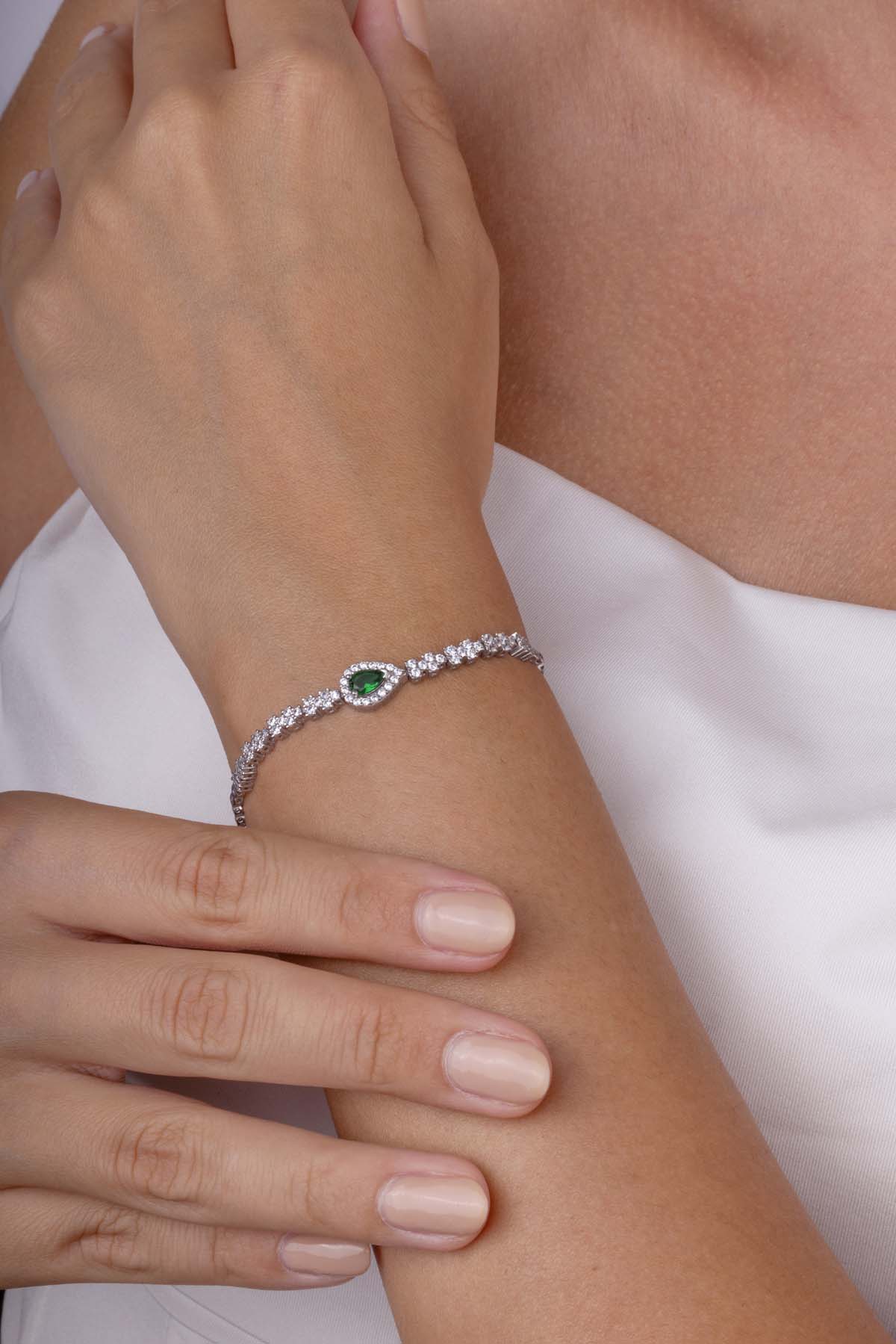 12 Ay'a Varan Taksit Seçeneği925 ayar gümüşten üretilmiş bu zarif bileklik, merkezde yer alan zümrüt tonlarındaki damla taş ile öne çıkar. Damla taşın etrafını saran pırlanta görünümlü zirkon taşlar, bileğe zarif bir ışıltı katar. Su yolu formunda dizilmiş taşlar, bileklik boyunca dengeli bir parlaklık sağlar ve tasarıma sofistike bir bütünlük kazandırır.
