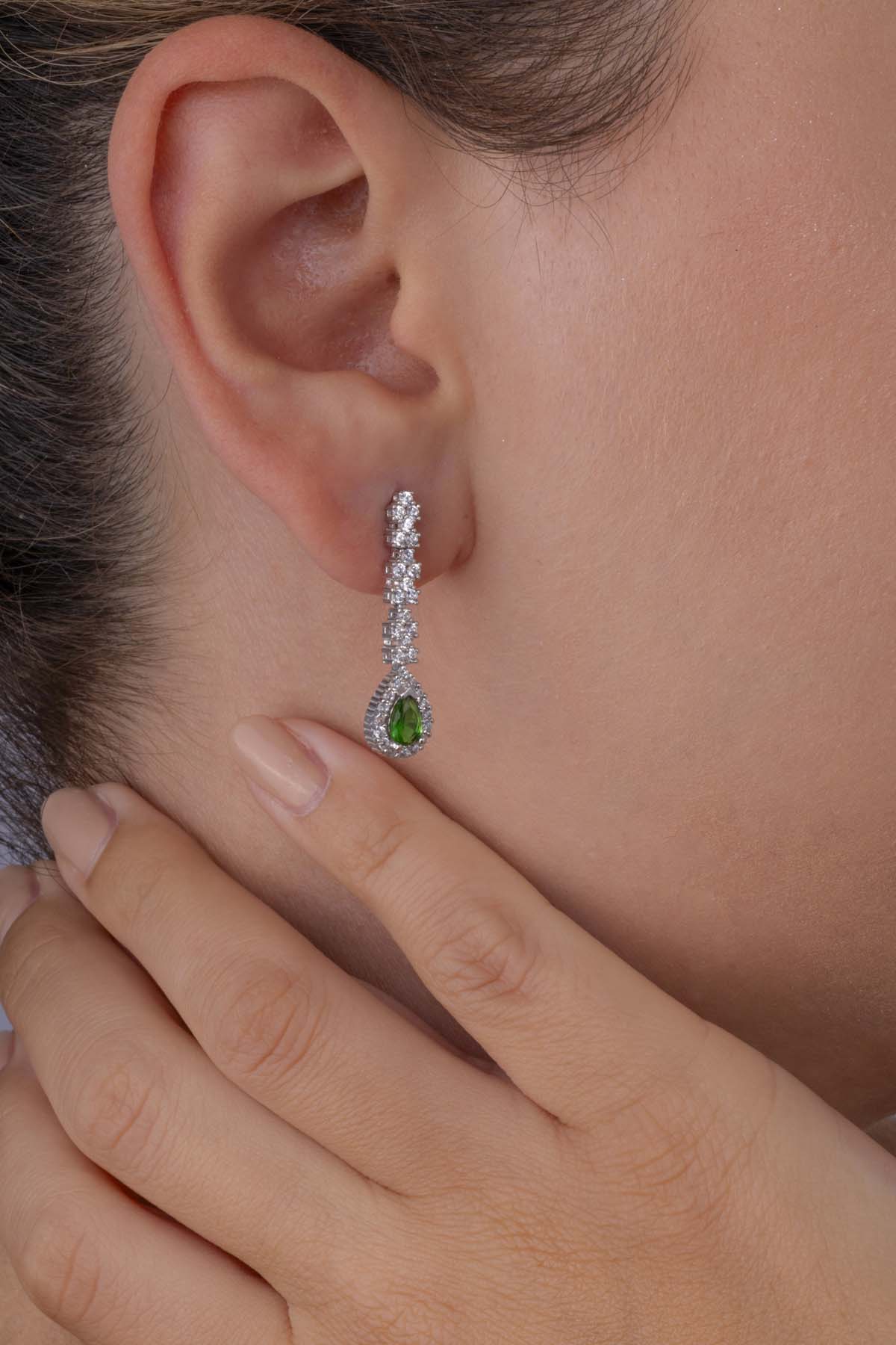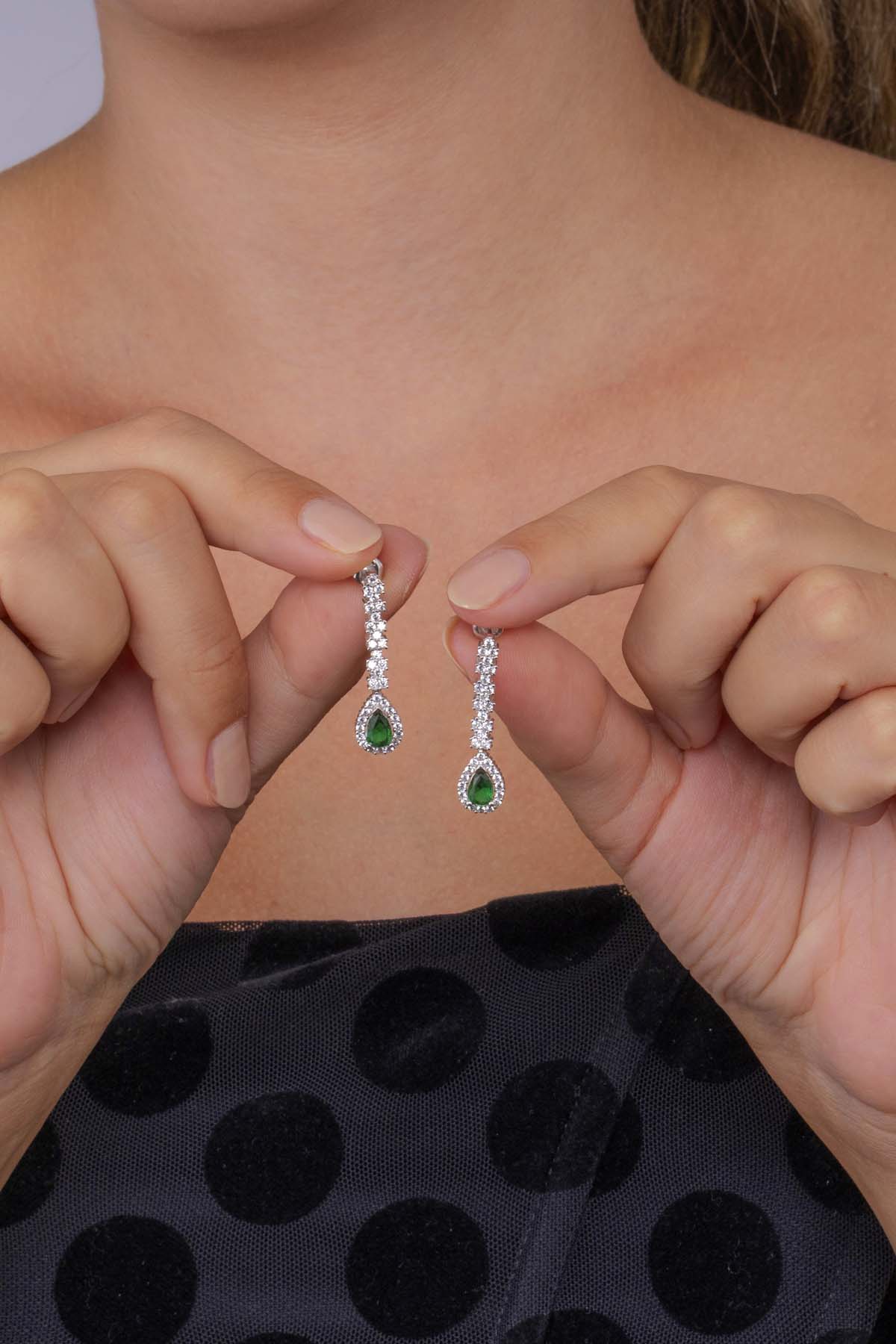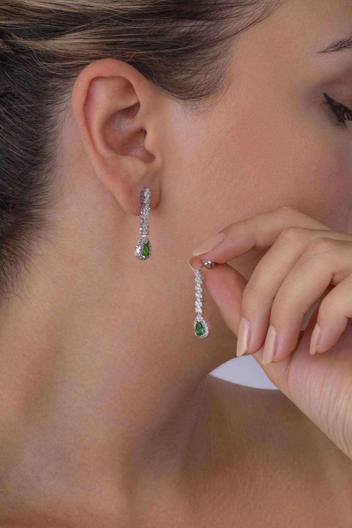 12 Ay'a Varan Taksit Seçeneği925 ayar gümüşten titizlikle üretilen bu şık küpe, merkezinde yer alan zümrüt tonlarındaki damla taşla dikkat çeker. Işıltılı zirkonlarla süslenmiş su yolu formu, taşların zarif bir akış içinde dizilmesini sağlar ve kulakta etkileyici bir düşüş görünümü oluşturur. Yeşil taşın derin ve güçlü tonu, zirkonların parlaklığıyla birleşerek göz alıcı bir kontrast yaratır.